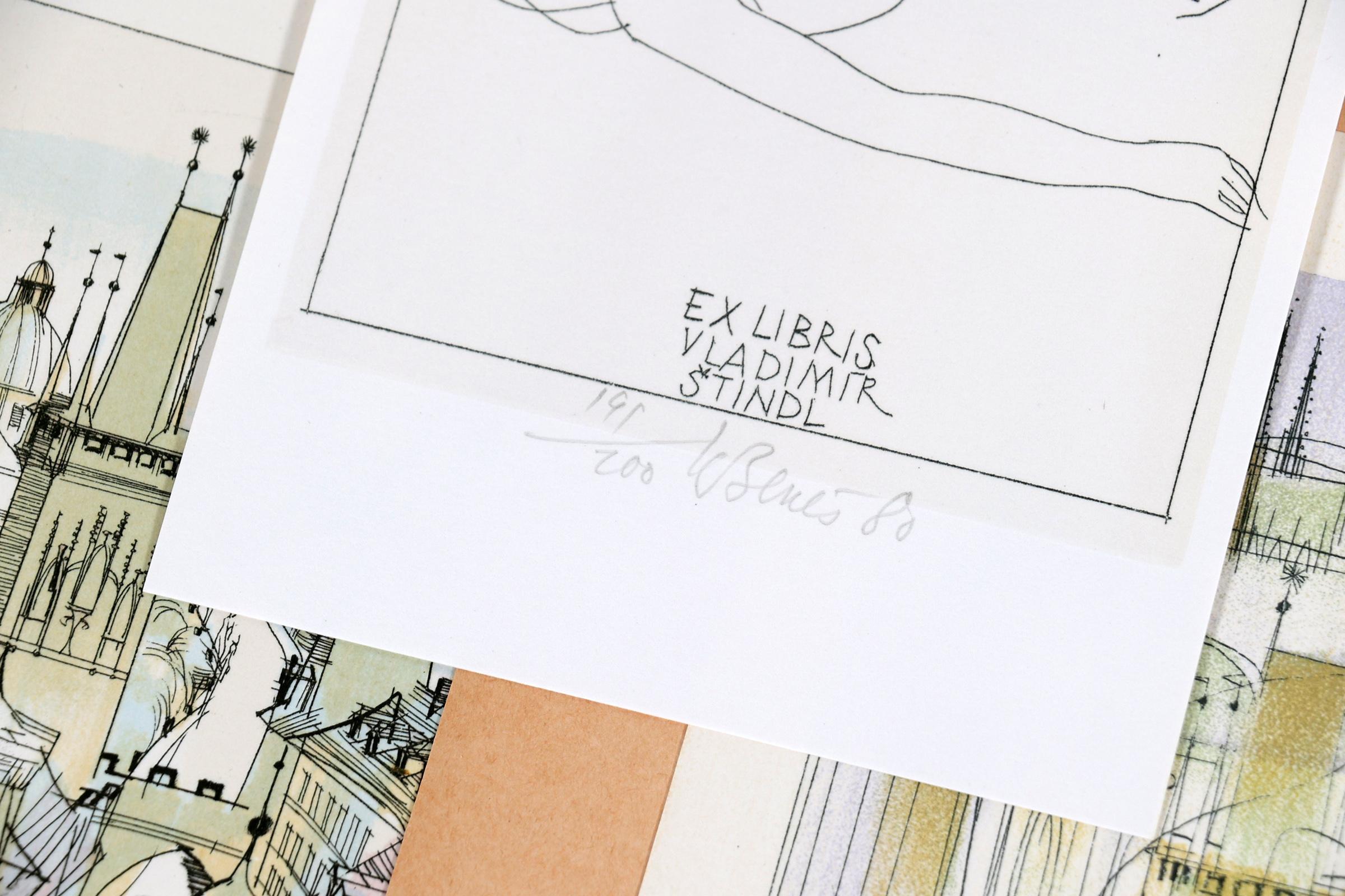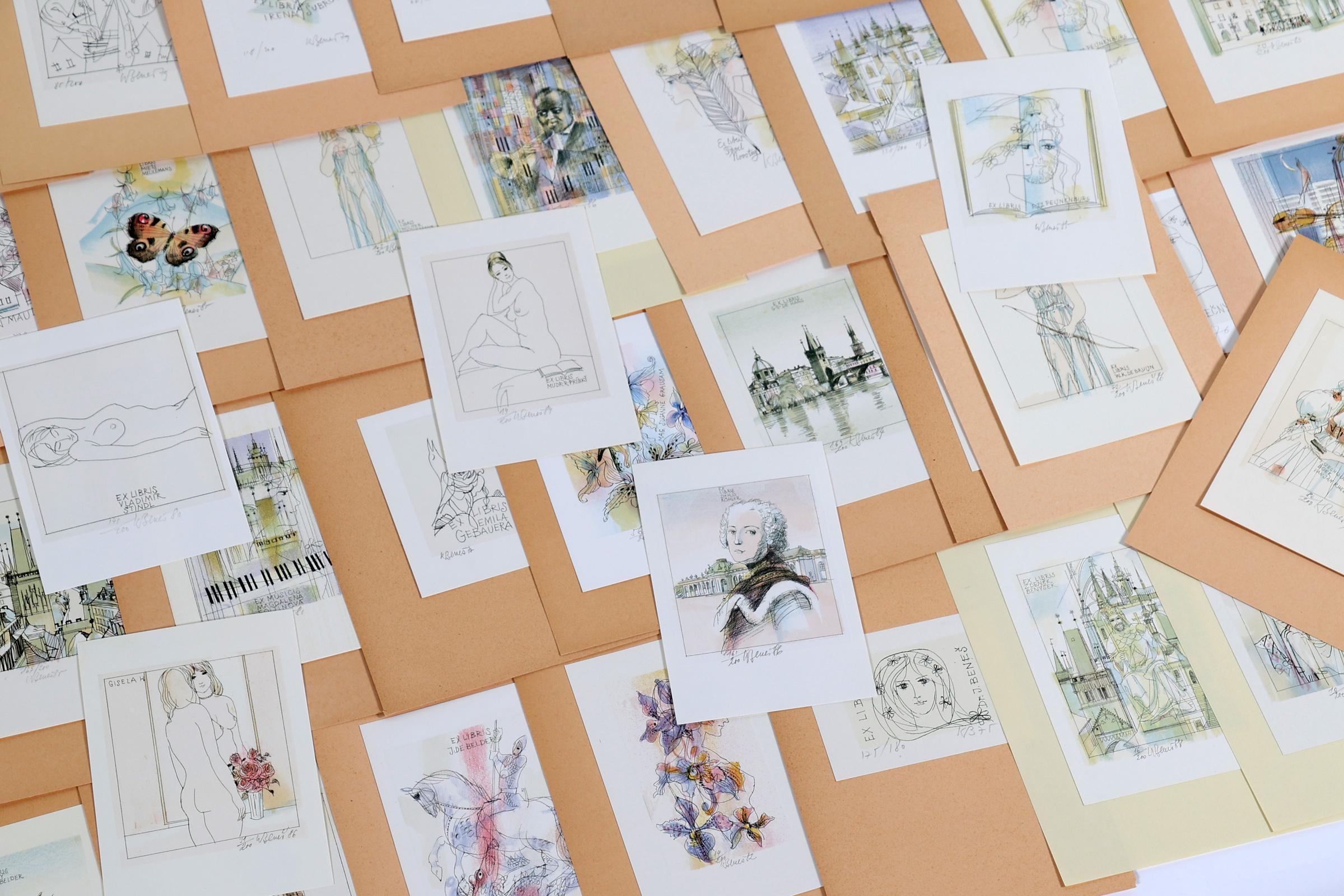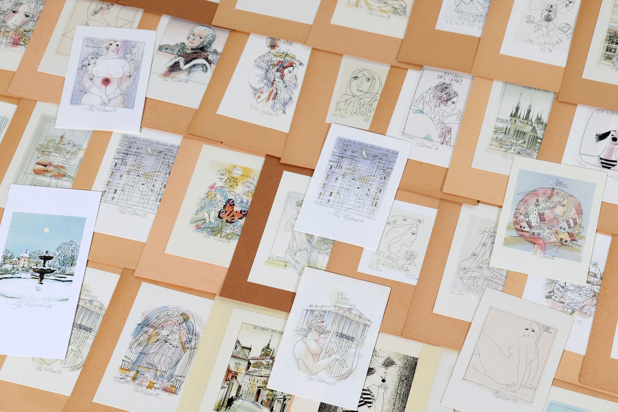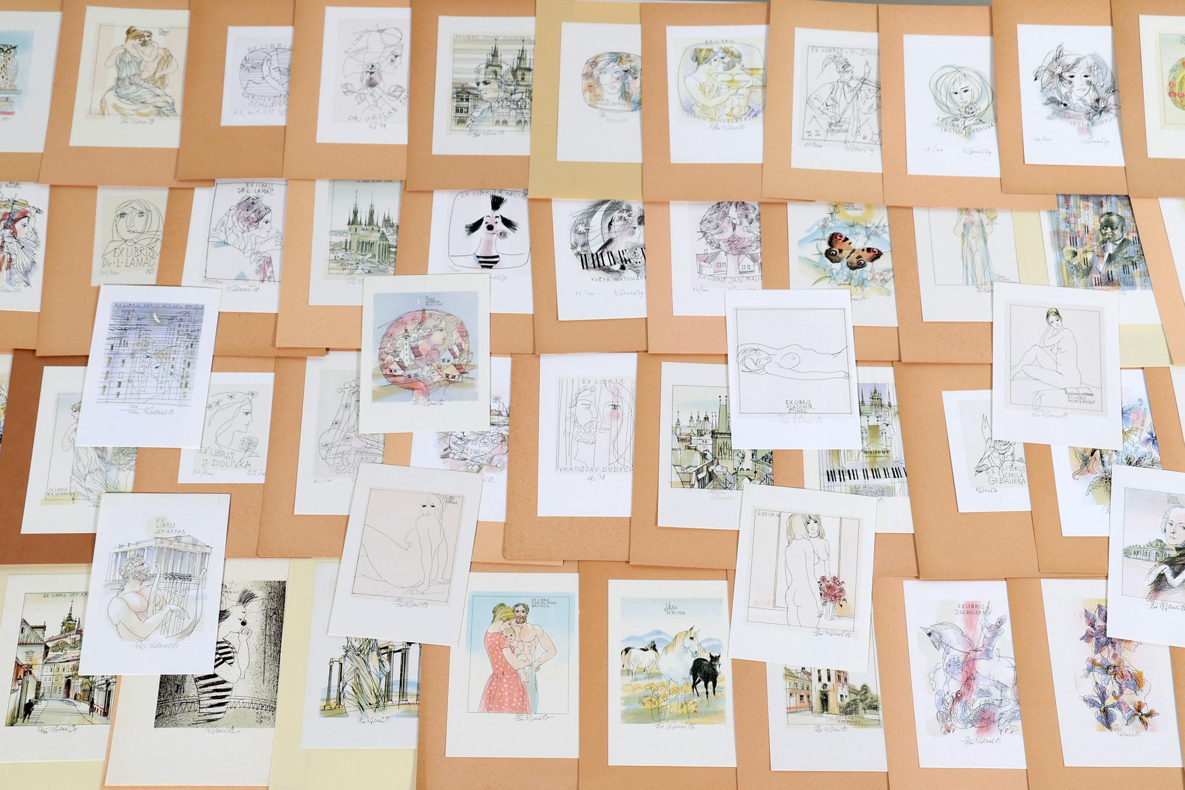 Benes, K., plm. 80 exlibris, litho (vaak in kleur), alle gesigneerd, opgeplakt. Diverse thema's.