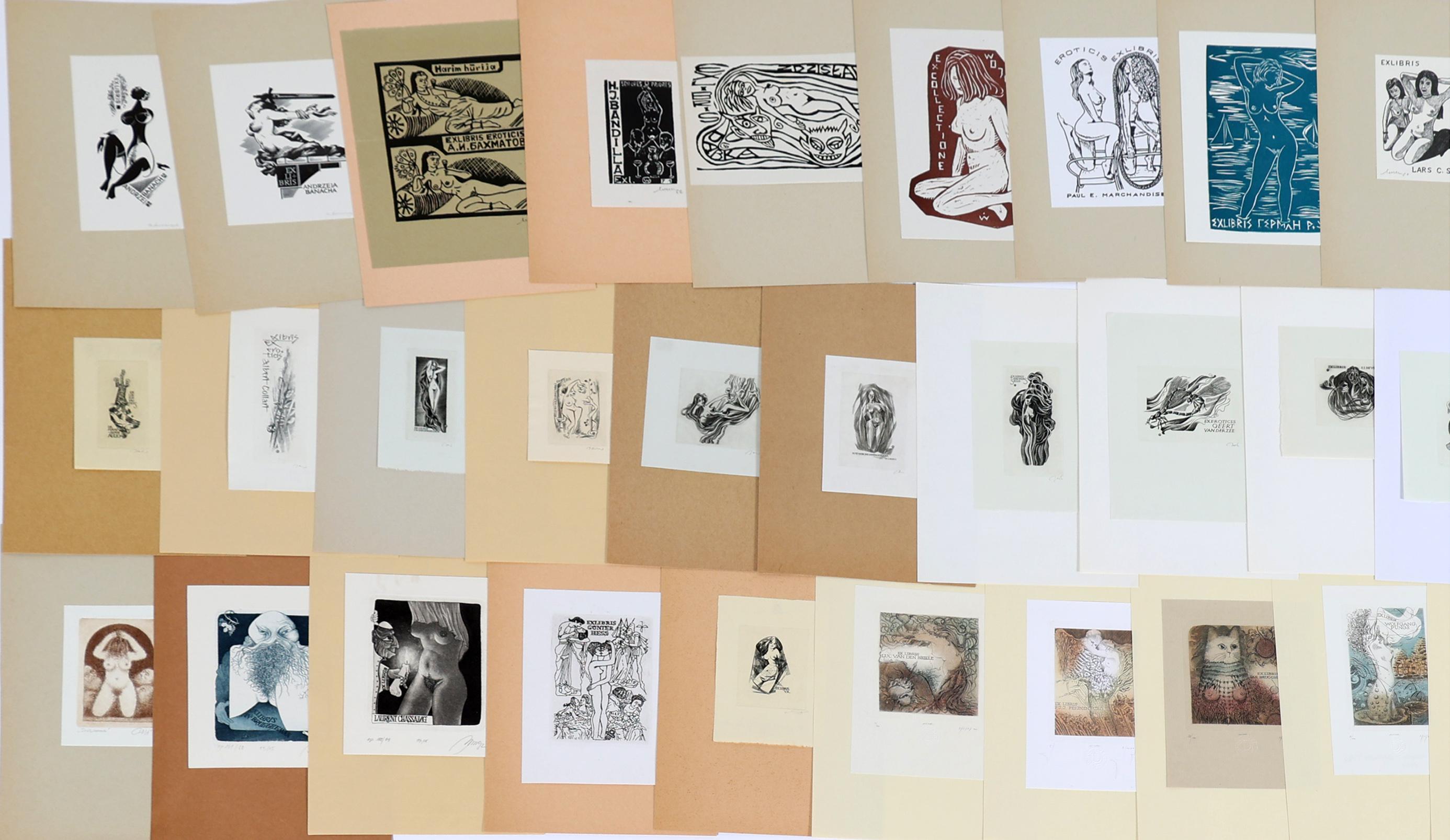 collectie Poolse exlibris, thema: naakt / erotiek. 20 x Diepdruk (25 x gesigneerd), rest hoogdruk (24 x gesigneerd). Opgeplakt. Kunstenaars o.a. Balon, Bortowski, Jakubowski, Janeczek, Agopsowicz, Barylski, Dolatowski, Glowacka, Cieslak.