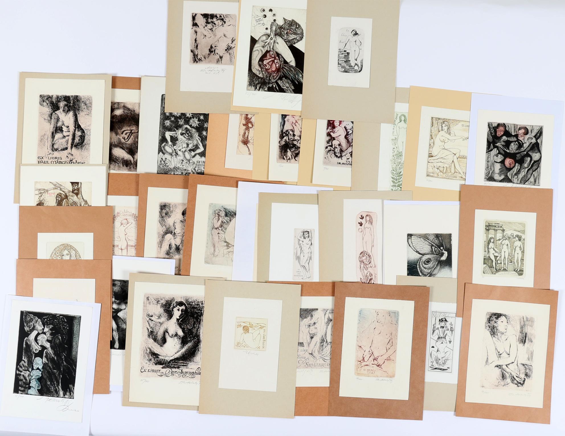 collectie van plm. 30 exlibris, thema: naakt / erotiek. Gemaakt door Tsjechische kunstenaars. Diepdrukken, 30 x gesigneerd. Opgeplakt. Kunstenaars o.a. Bednarik, Kacirek, Bouda, Chrenko, Fialo, Halata, Havlik, Housa, Hrivnac, Janicek.