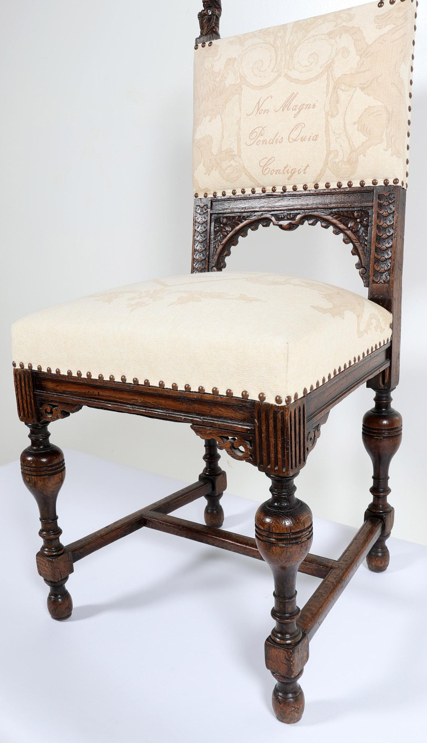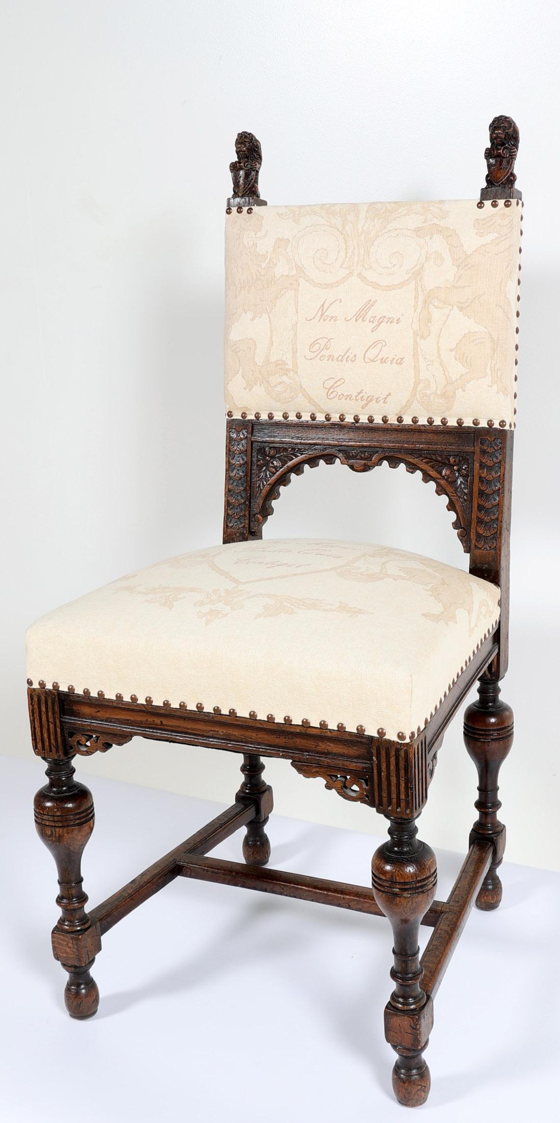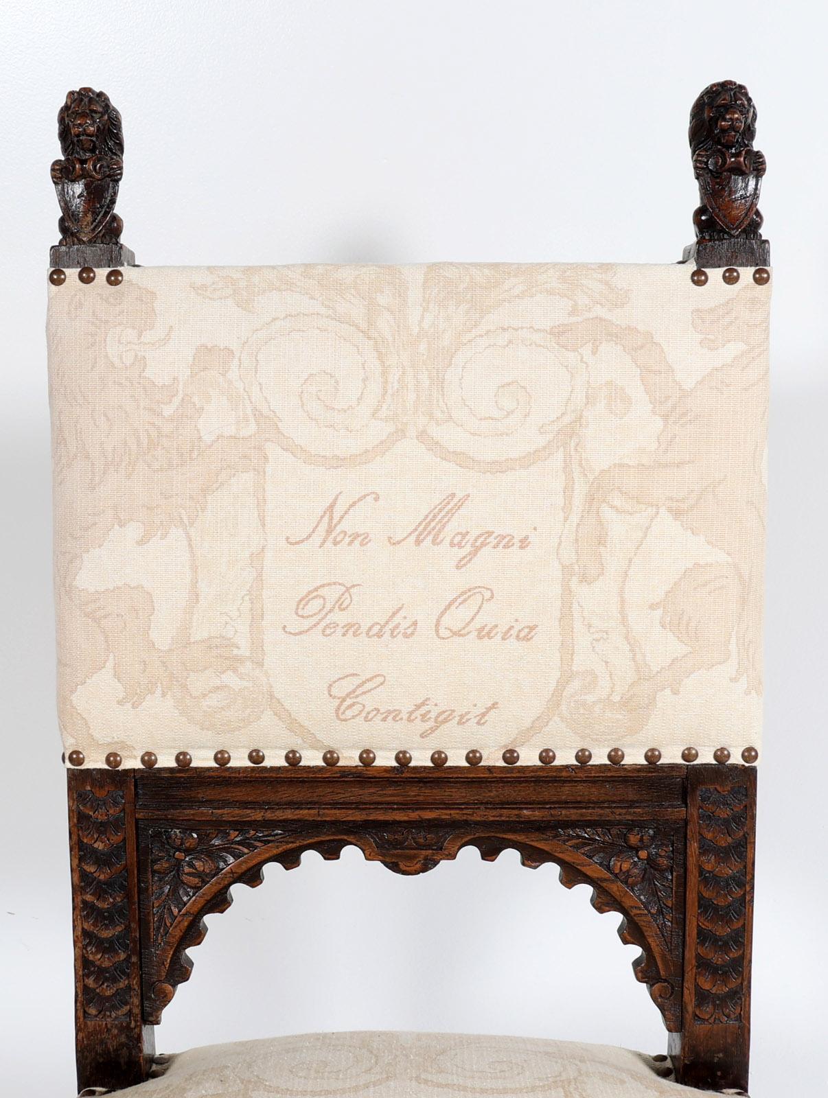 Antieke eikenhouten stoel met 2 leeuwen met wapenschild bovenop de rugleuning, met beige stoffering met daarop de tekst: 'Non Magni Pondis Ouia Contigit'
