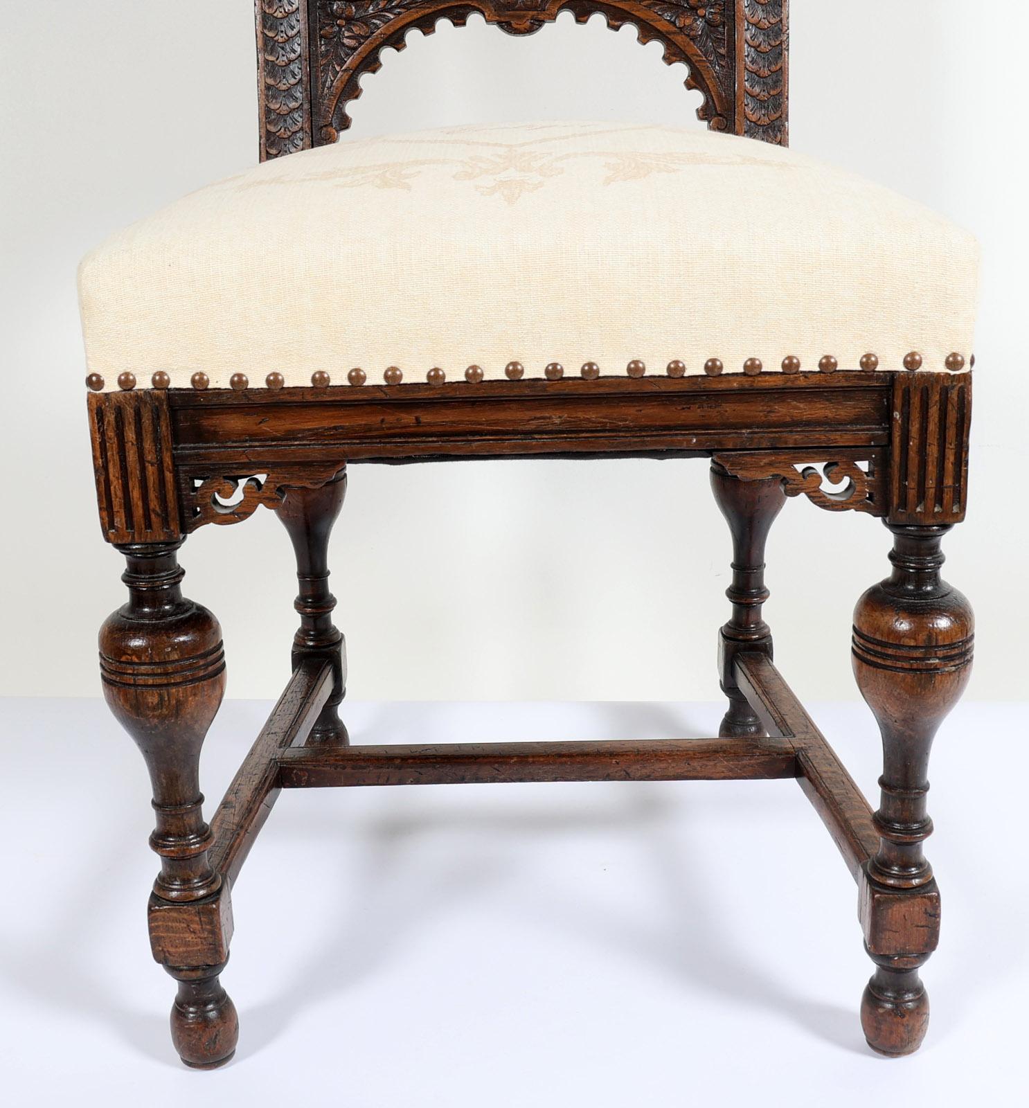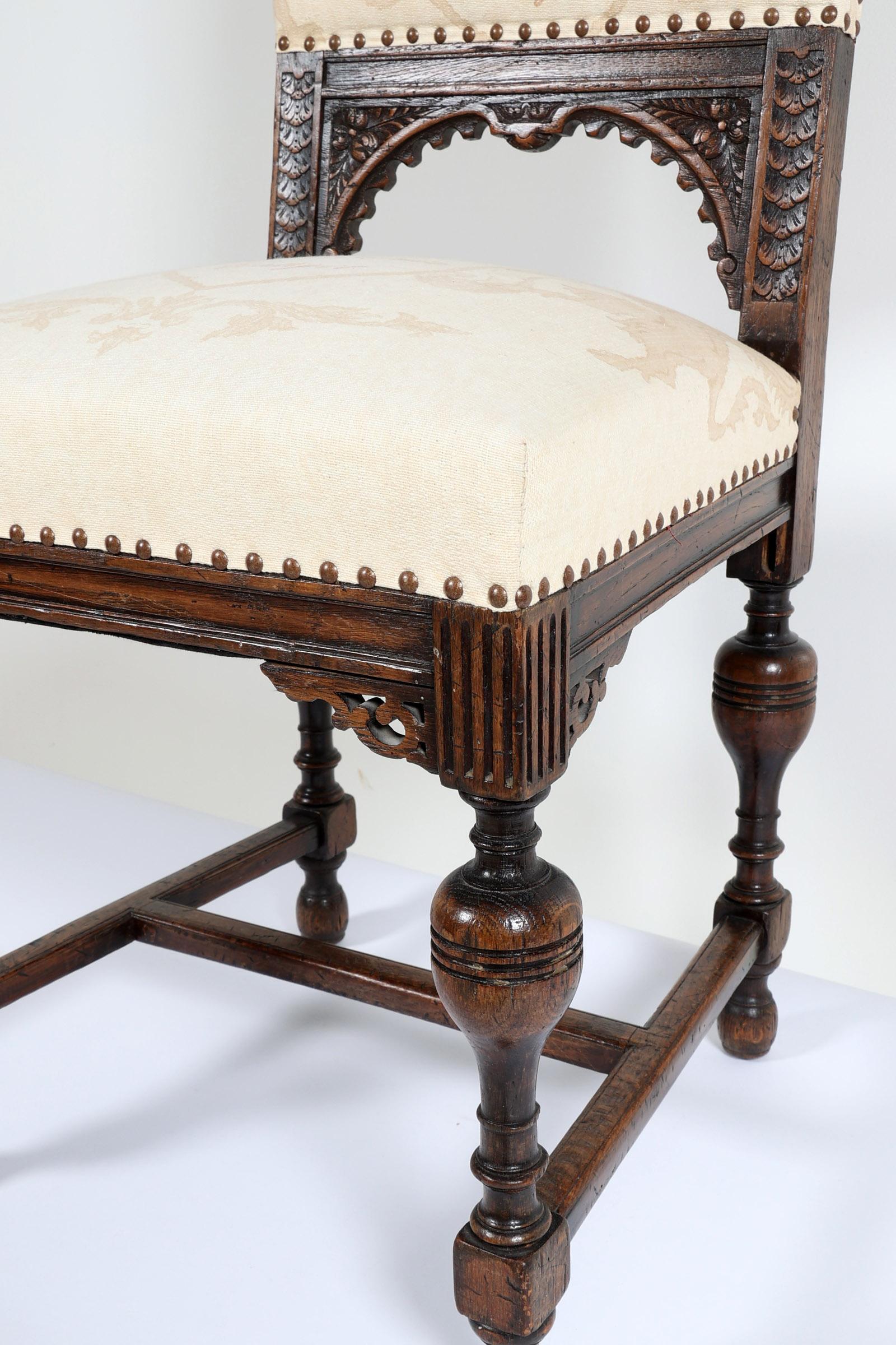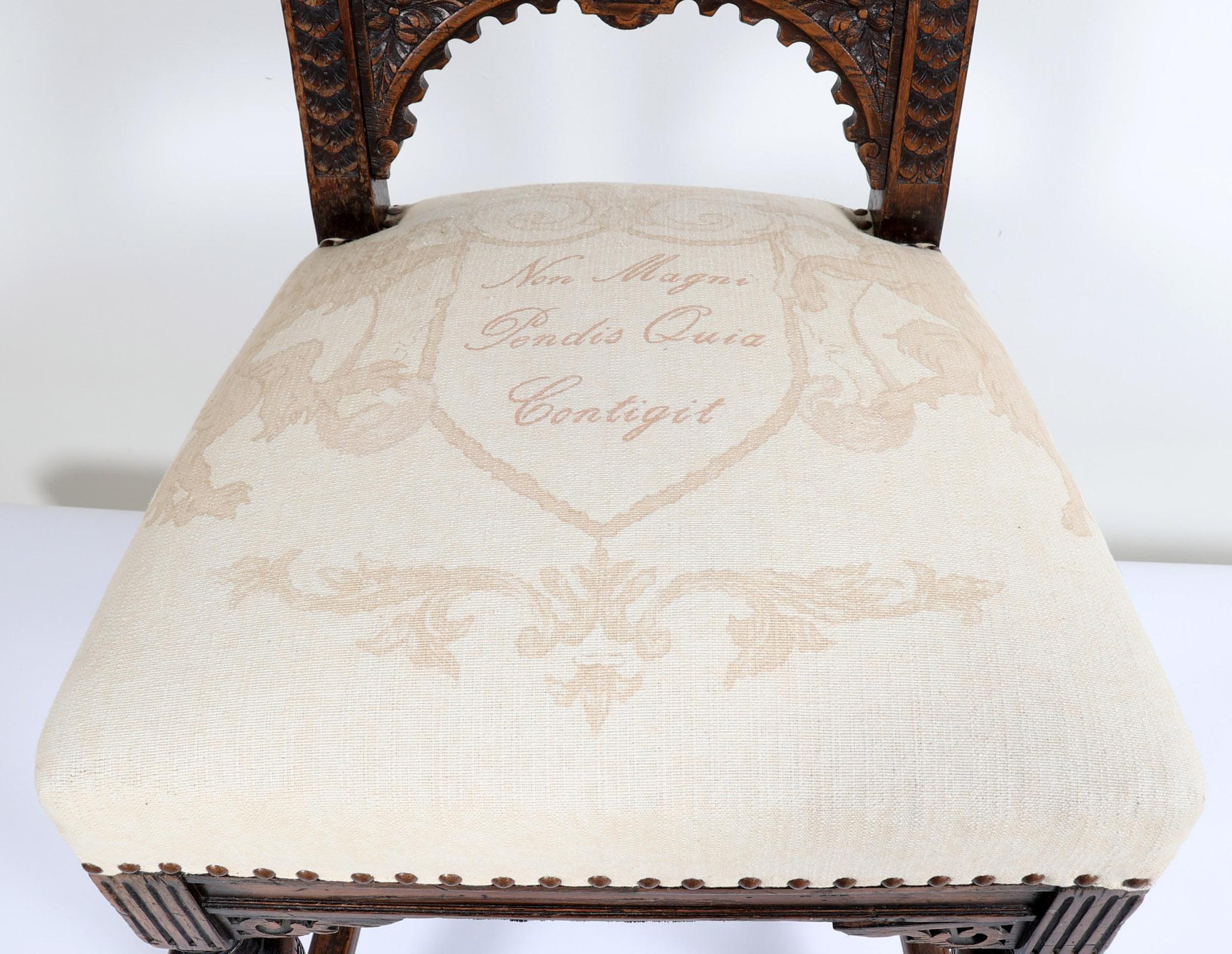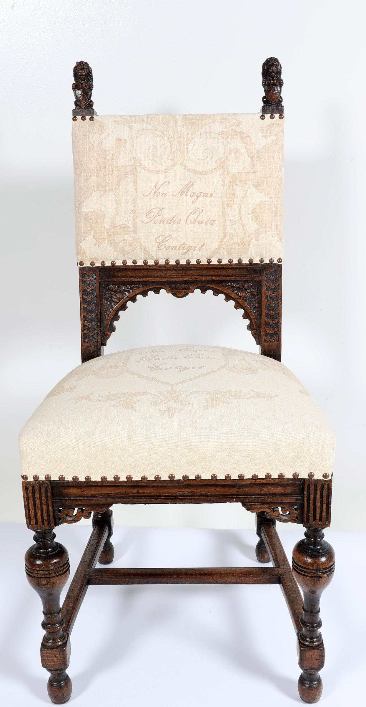 Antieke eikenhouten stoel met 2 leeuwen met wapenschild bovenop de rugleuning, met beige stoffering met daarop de tekst: 'Non Magni Pondis Ouia Contigit'