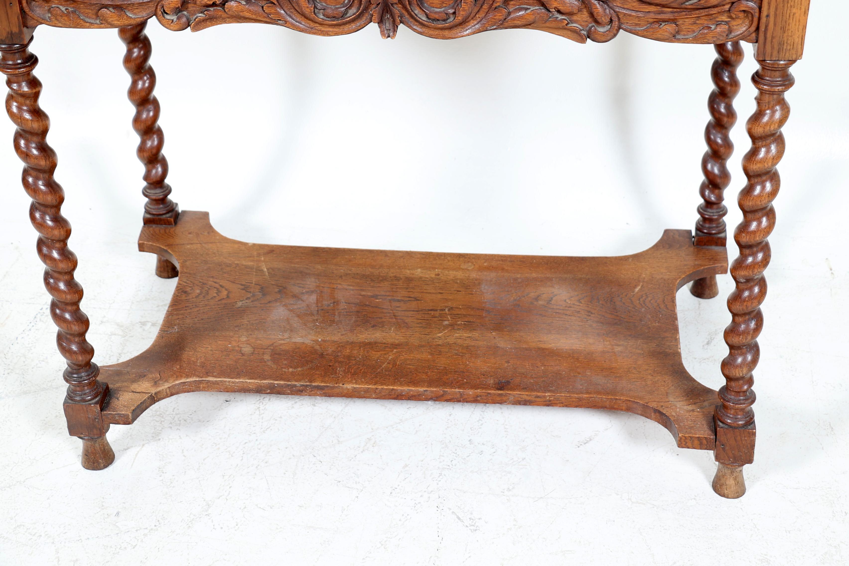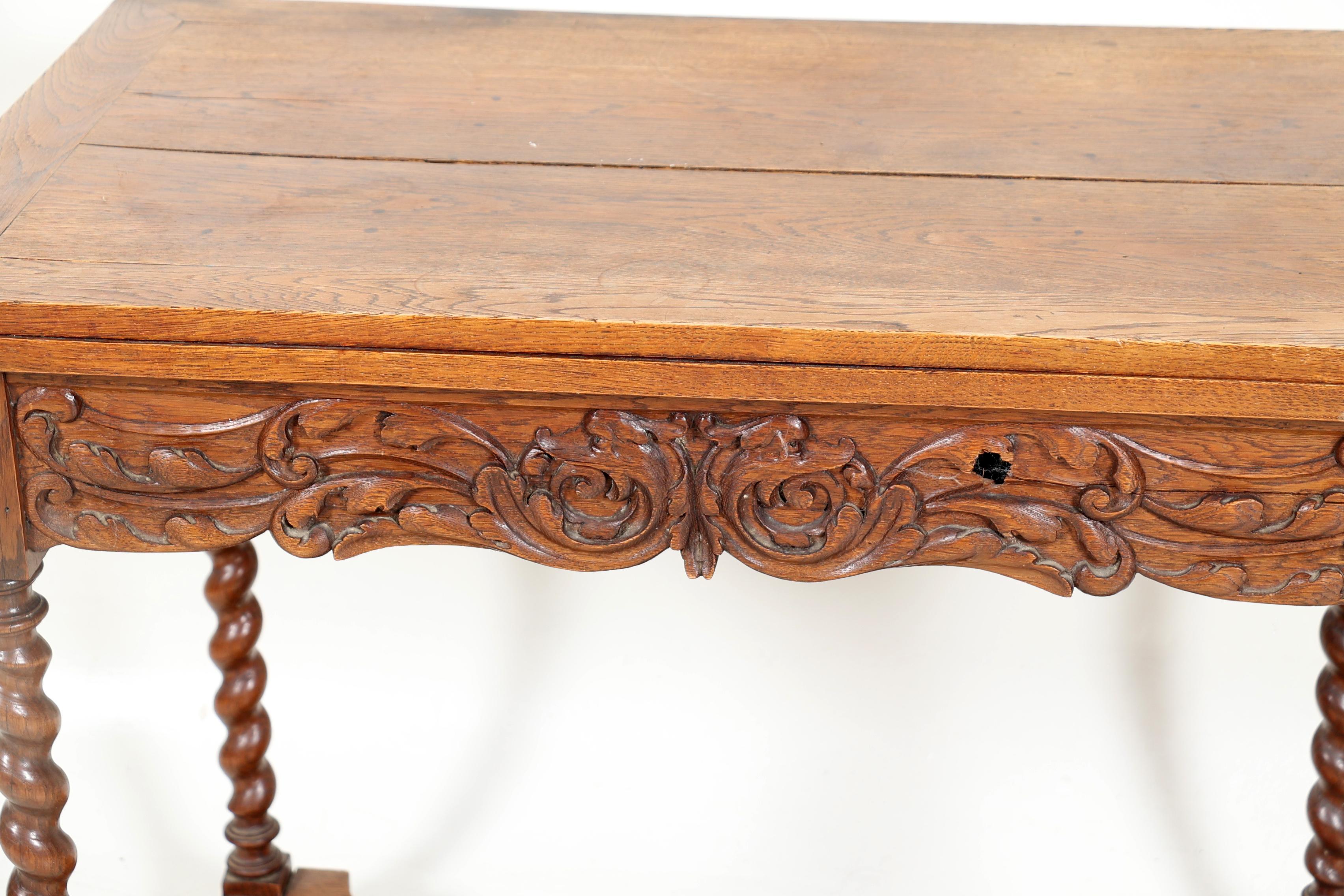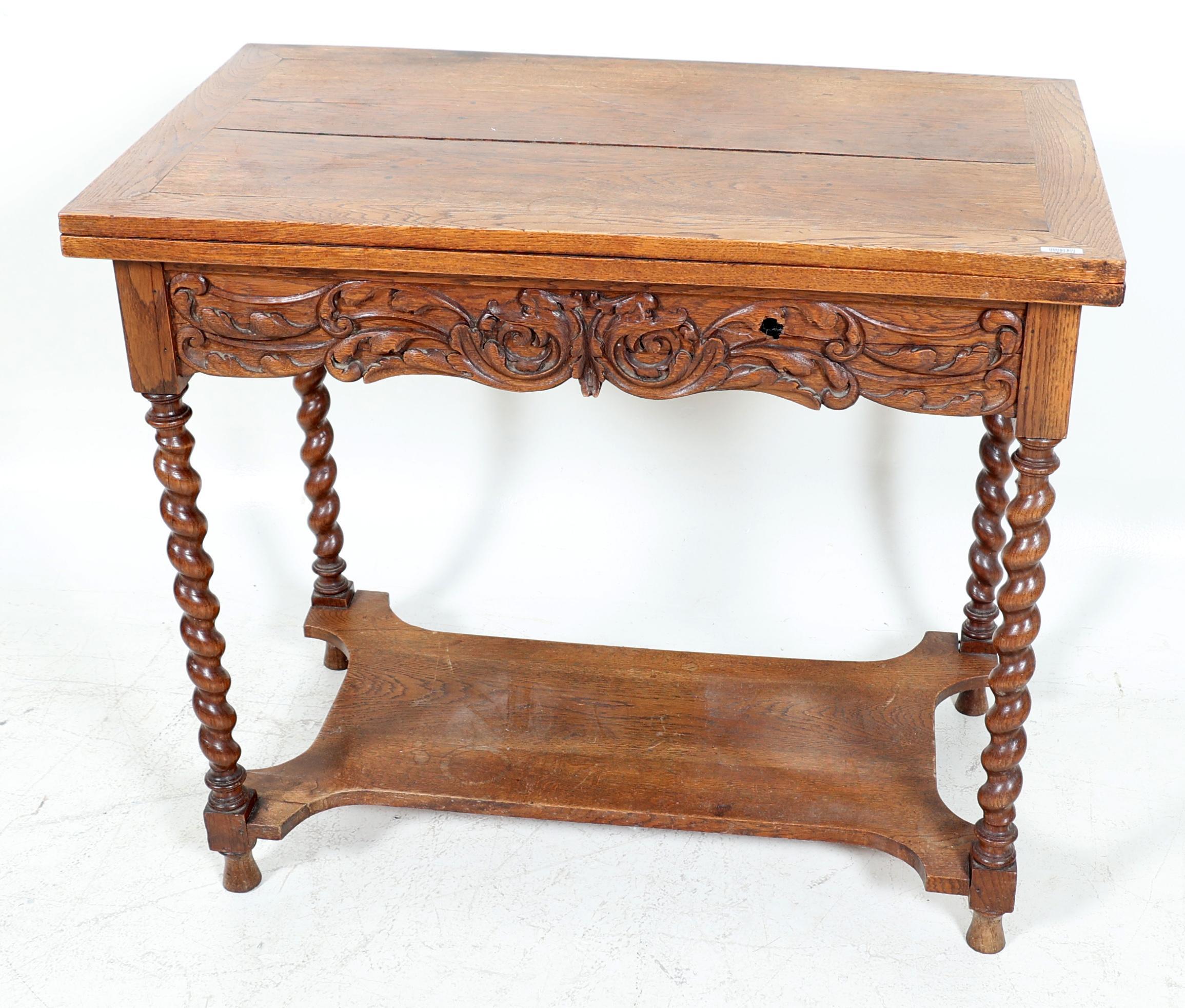 Eikenhouten bijzettafel met uitklapbaar blad, rustend op getorste poten, h.75 x b.87 x d.51 cm.