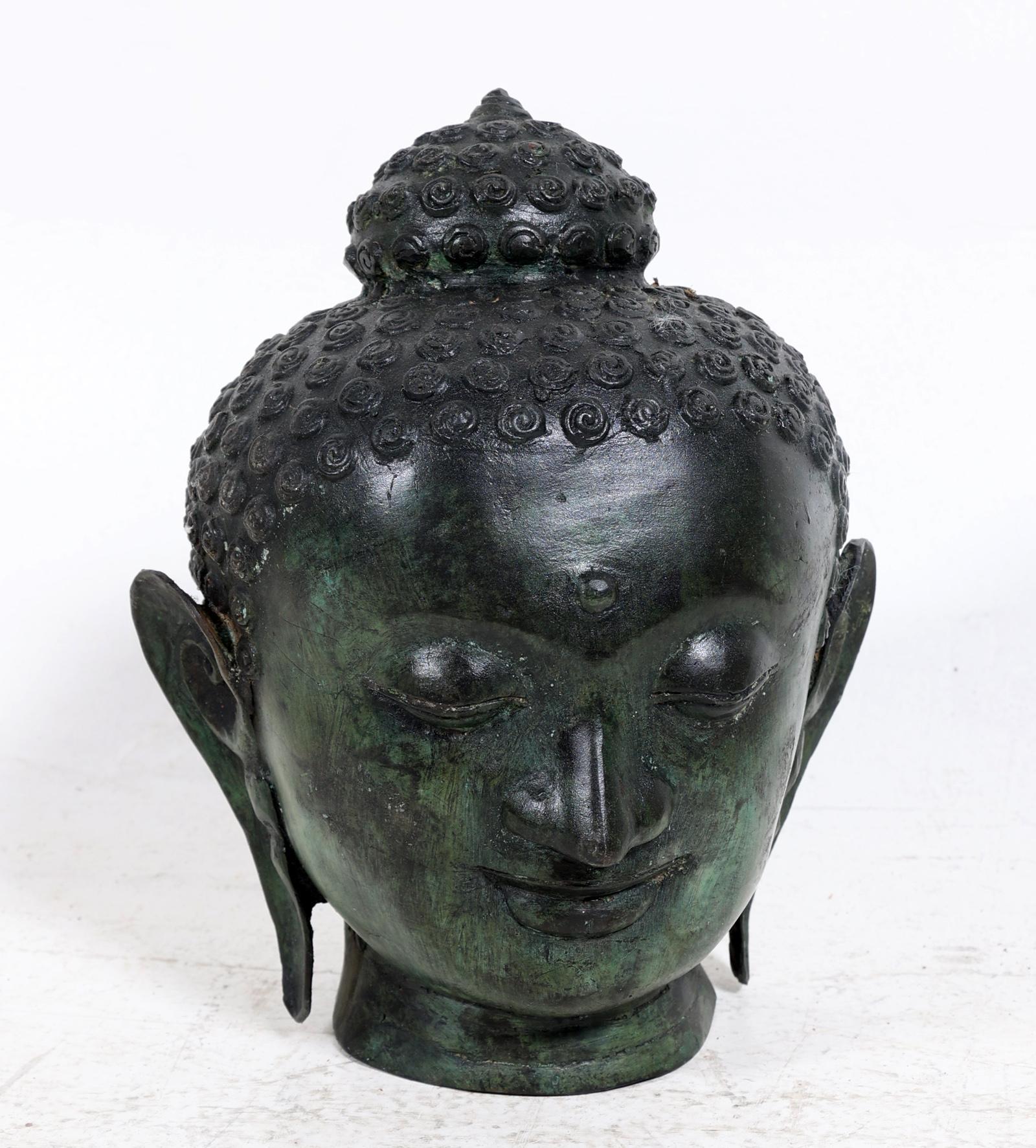 Groen gepatineerd bronzen Boeddha hoofd, h.26 cm.
