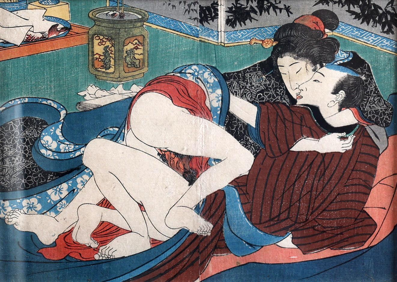 Kuniyoshi (1797-1861), Erotische voorstelling van man en vrouw, houtsnede, 15 x 21 cm.