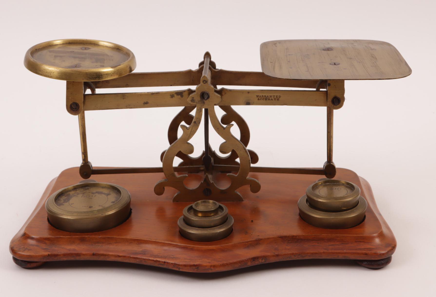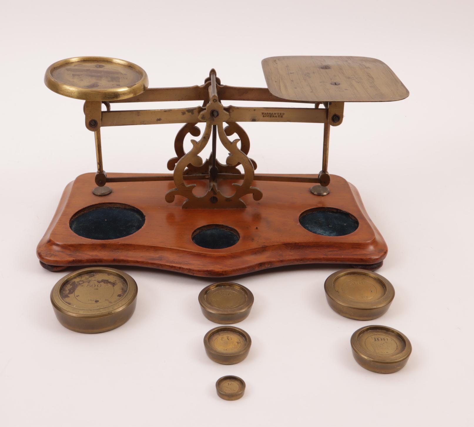 Weegschaal op houten standaard met gewichten
