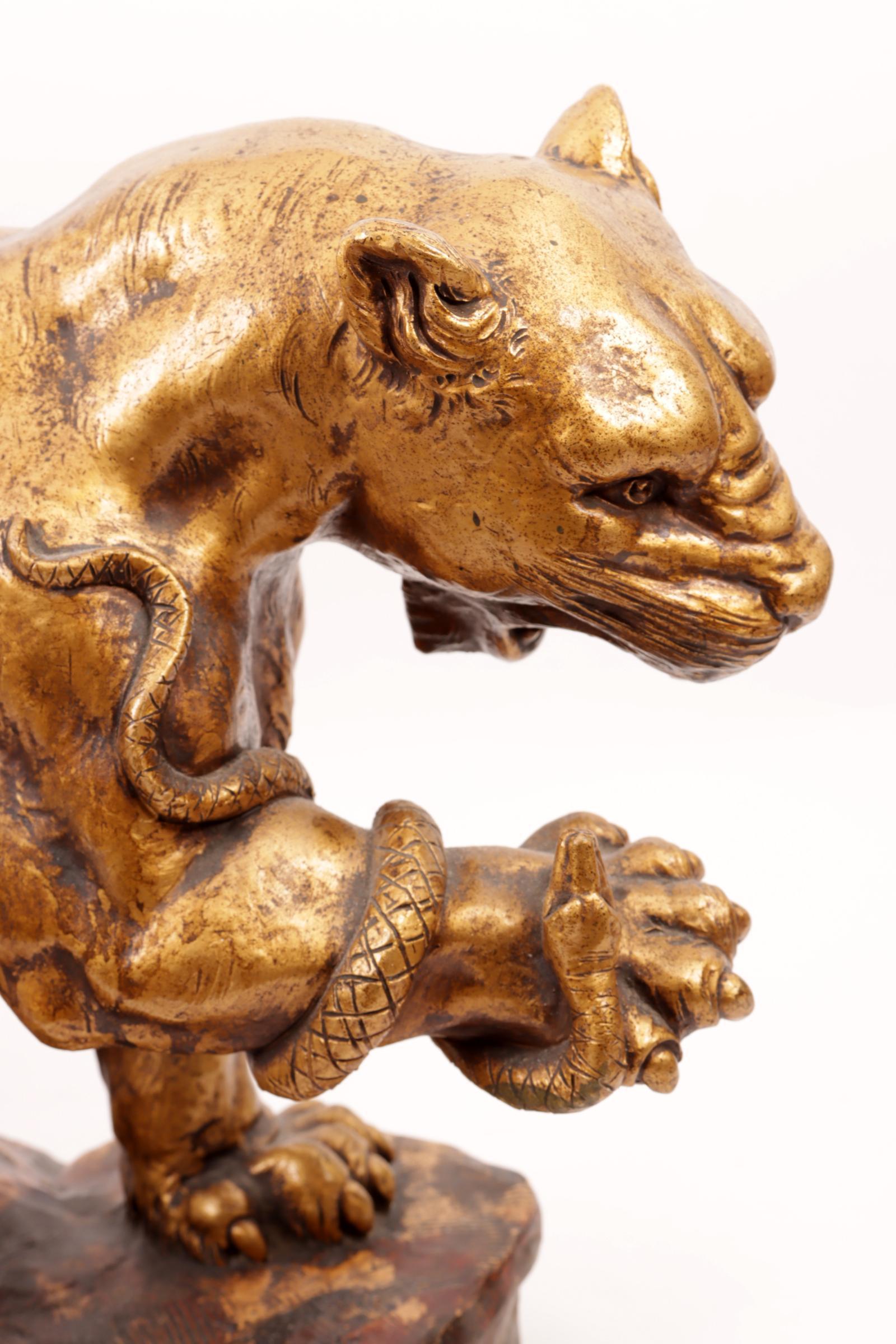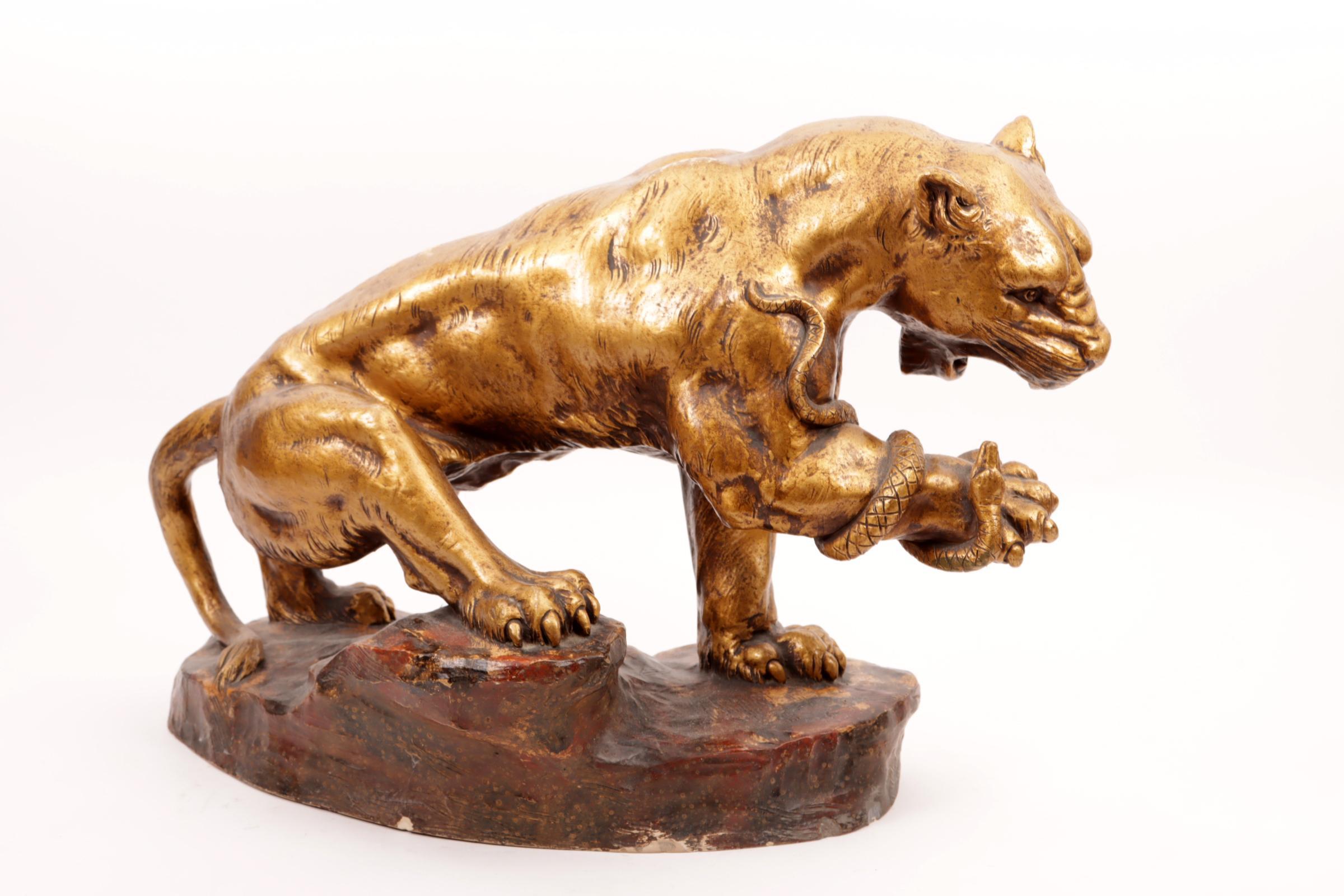 Goudkleurig aardewerken beeld van een tijger naar A. Sagetto, h.37 x L.59 x d.23 cm.