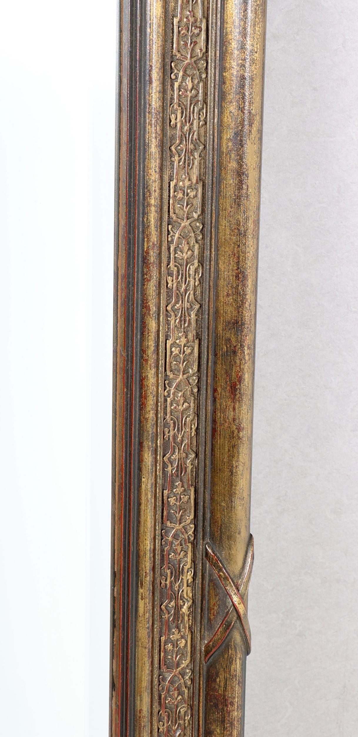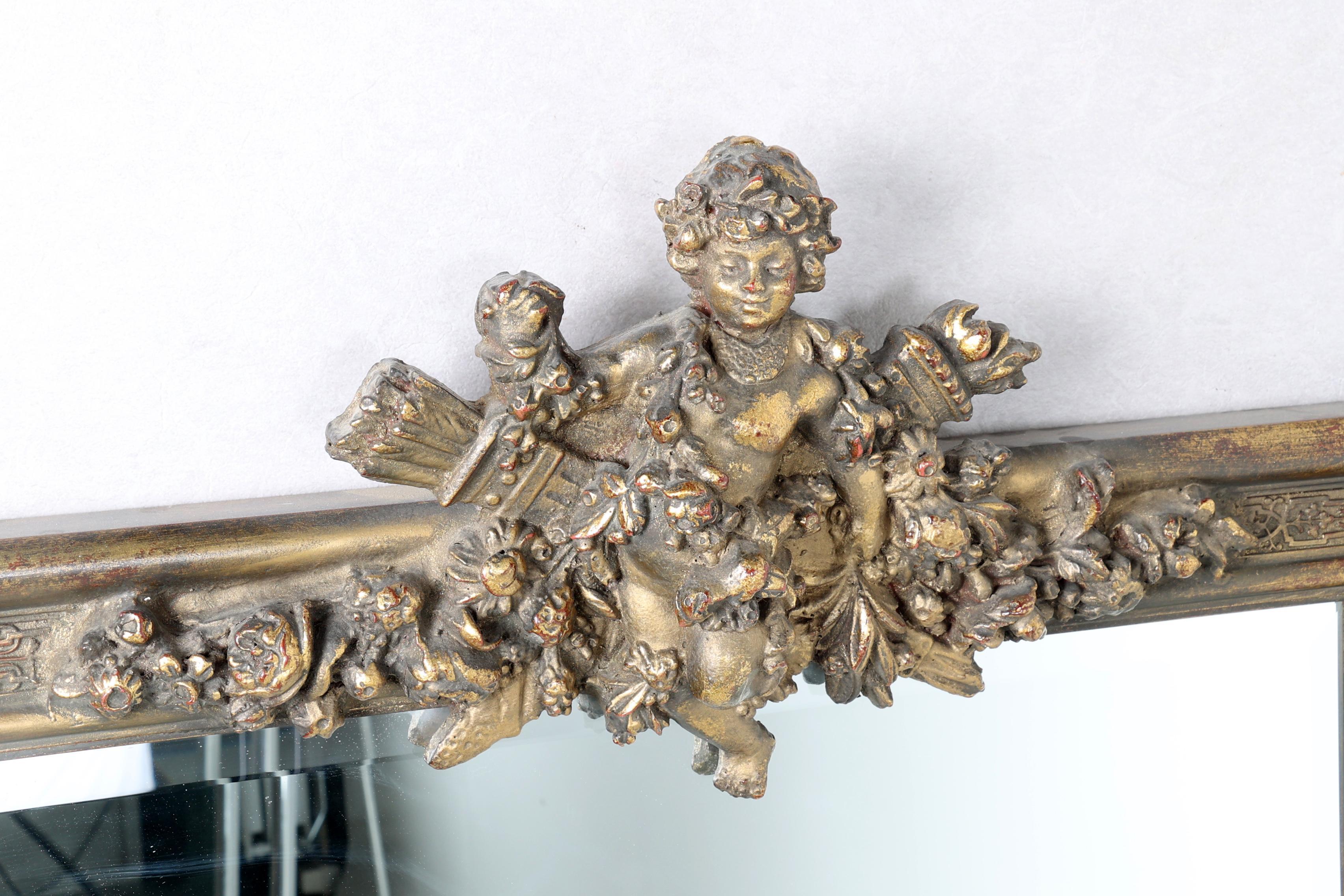 Geslepen spiegel in met engelen gedecoreerde goudkleurige kuiflijst, h.132 x b.88 cm.