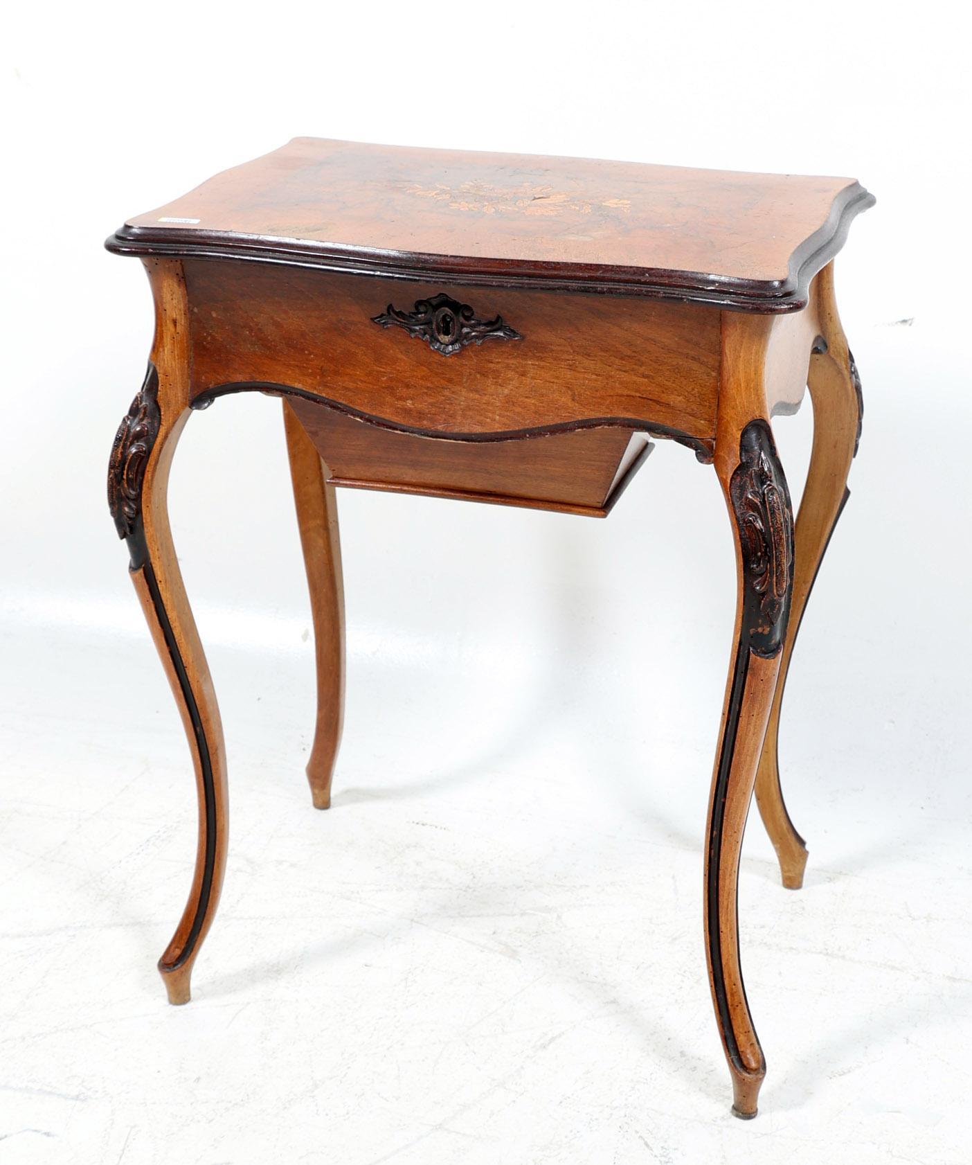 Met diverse houtsoorten ingelegde noten met wortelnotenhouten werktafel, h.73 x b.55 x d.40 cm.