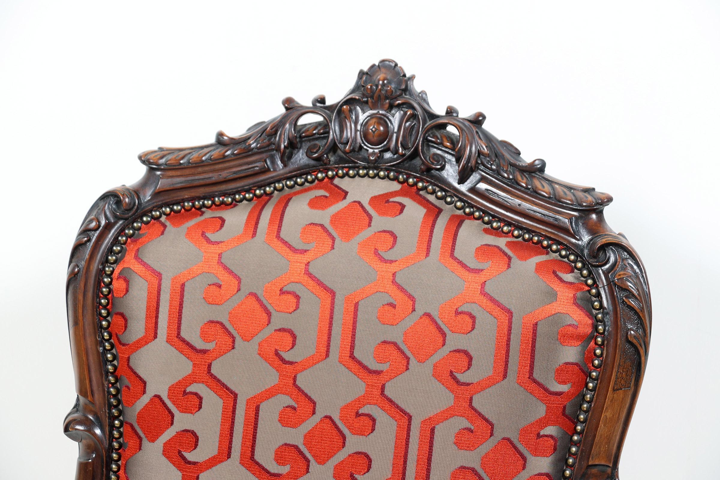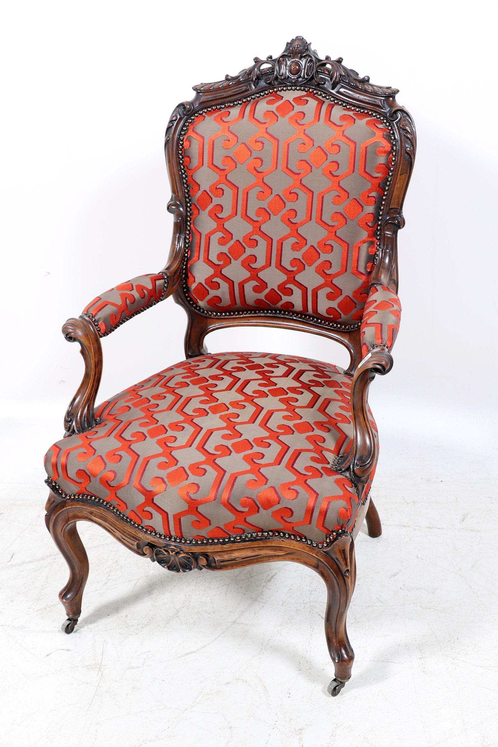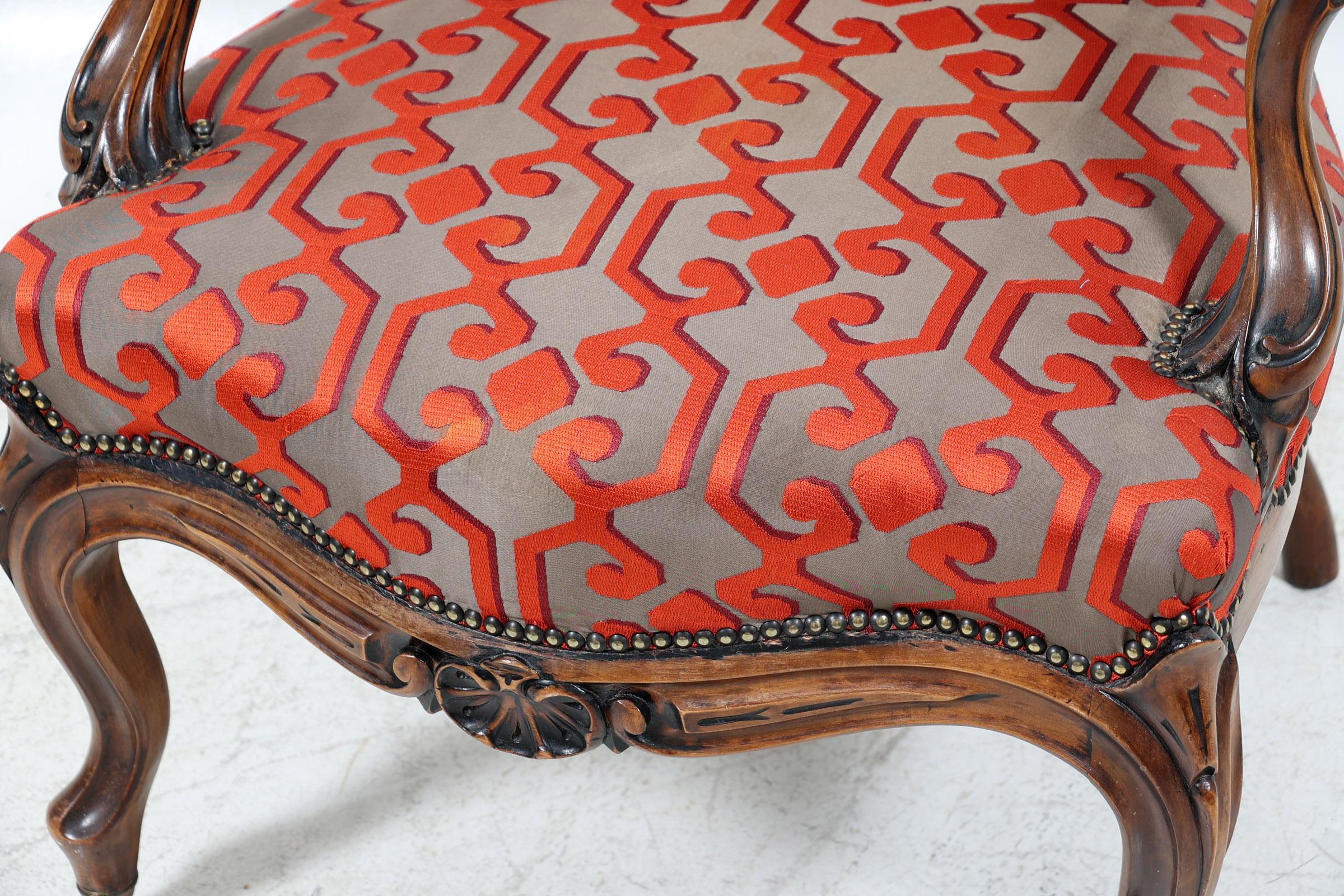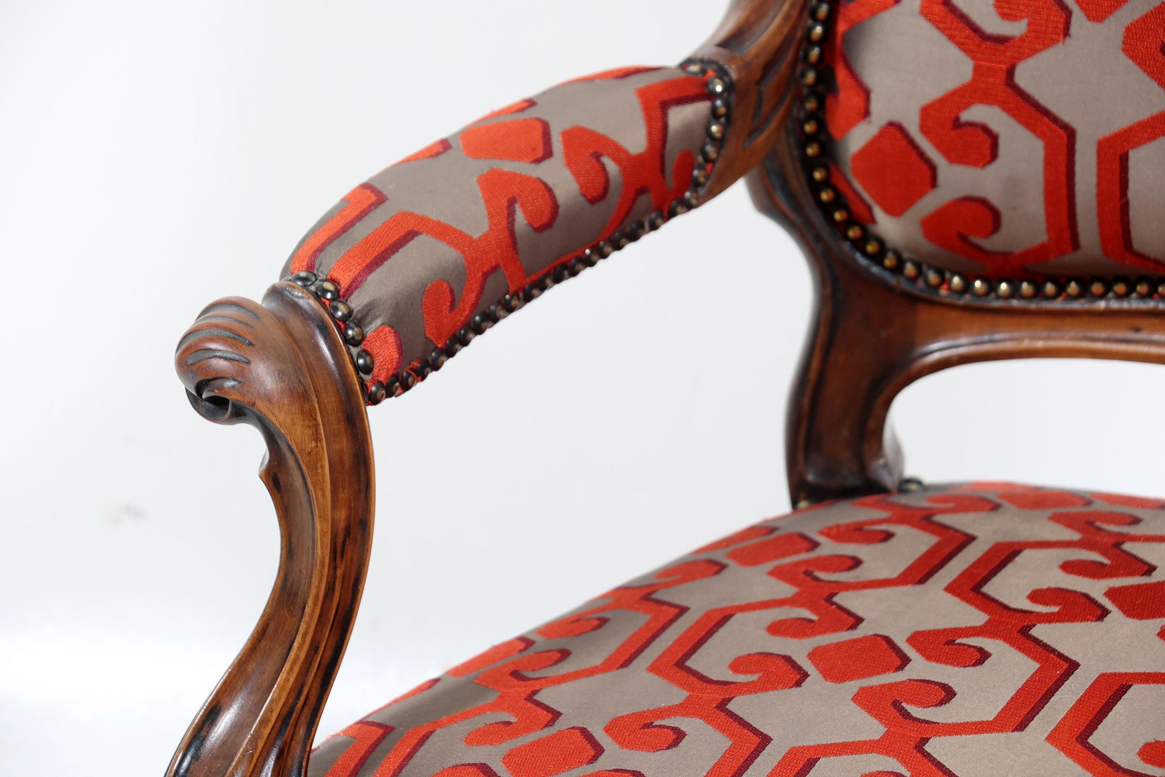 Notenhouten armstoel met moderne rood/grijze stof bekleed