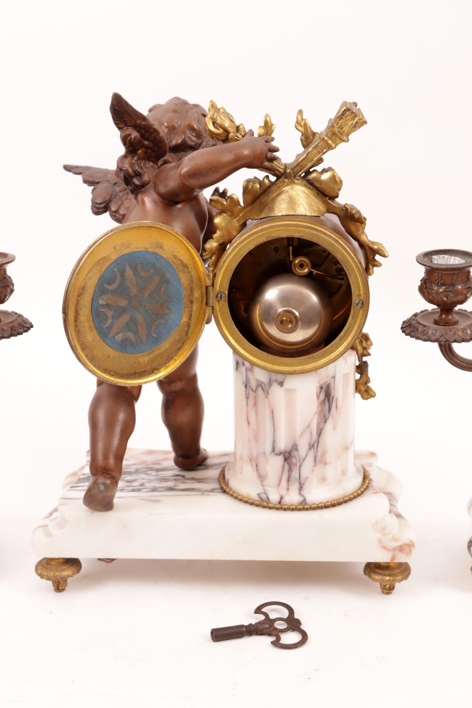 Marmeren 3-delig klokkenstel met naast het uurwerk een bronskleurige engel, h.30 cm.