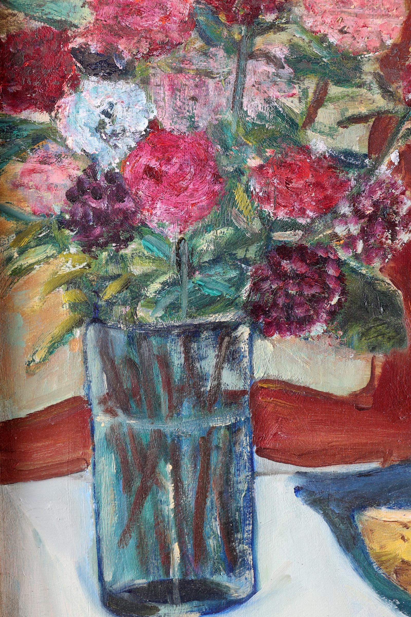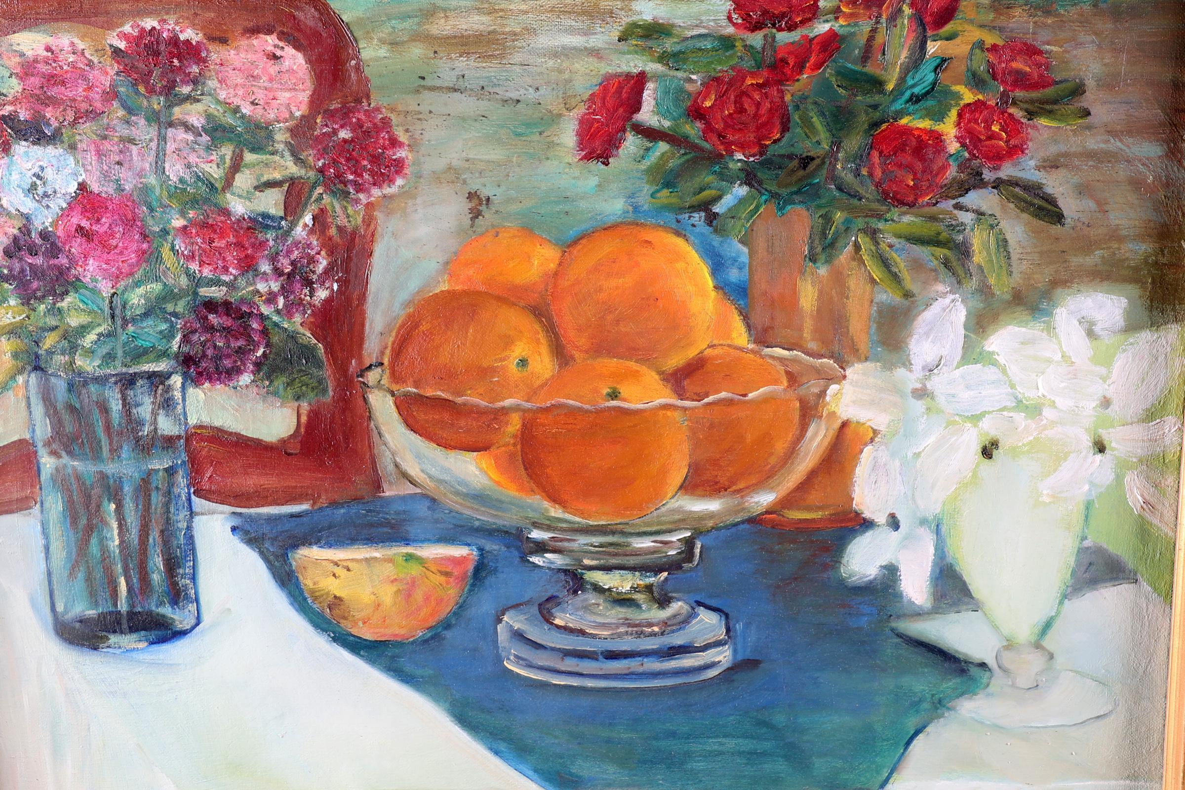 Onb. meester, Stilleven met bloemen en fruit, olieverf op doek, 49,5 x 59 cm.