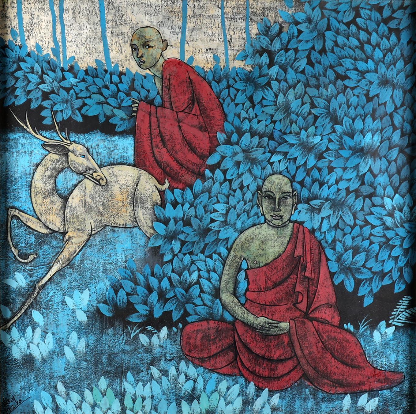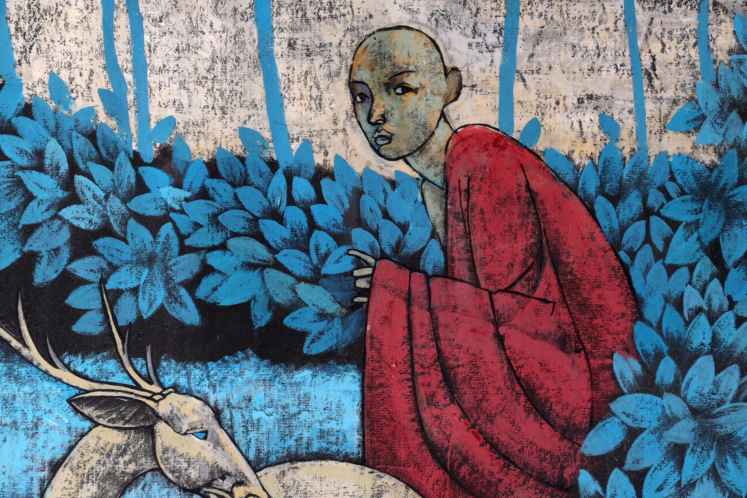 Chinese school, Twee Boeddhistische monniken in landschap met hert, acryl op papier achter glas, gedateerd 1992, 78 x 78 cm.