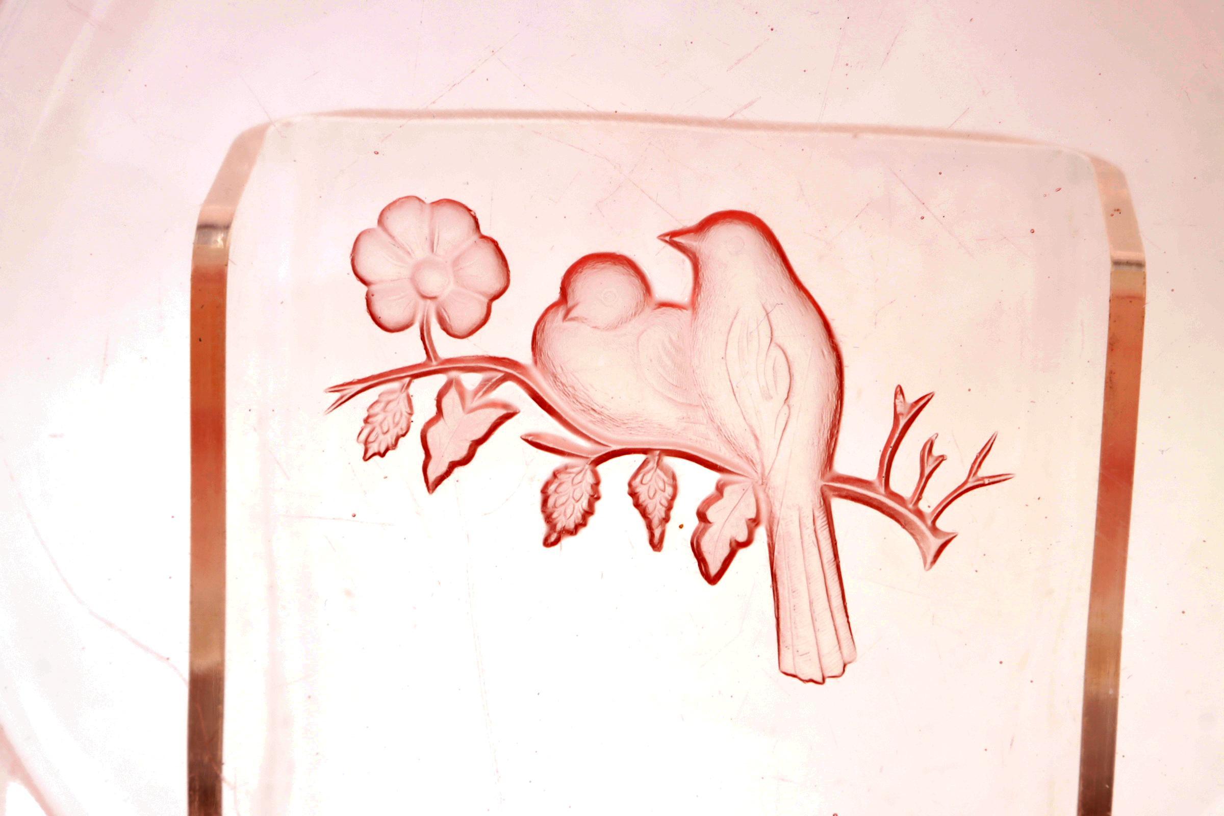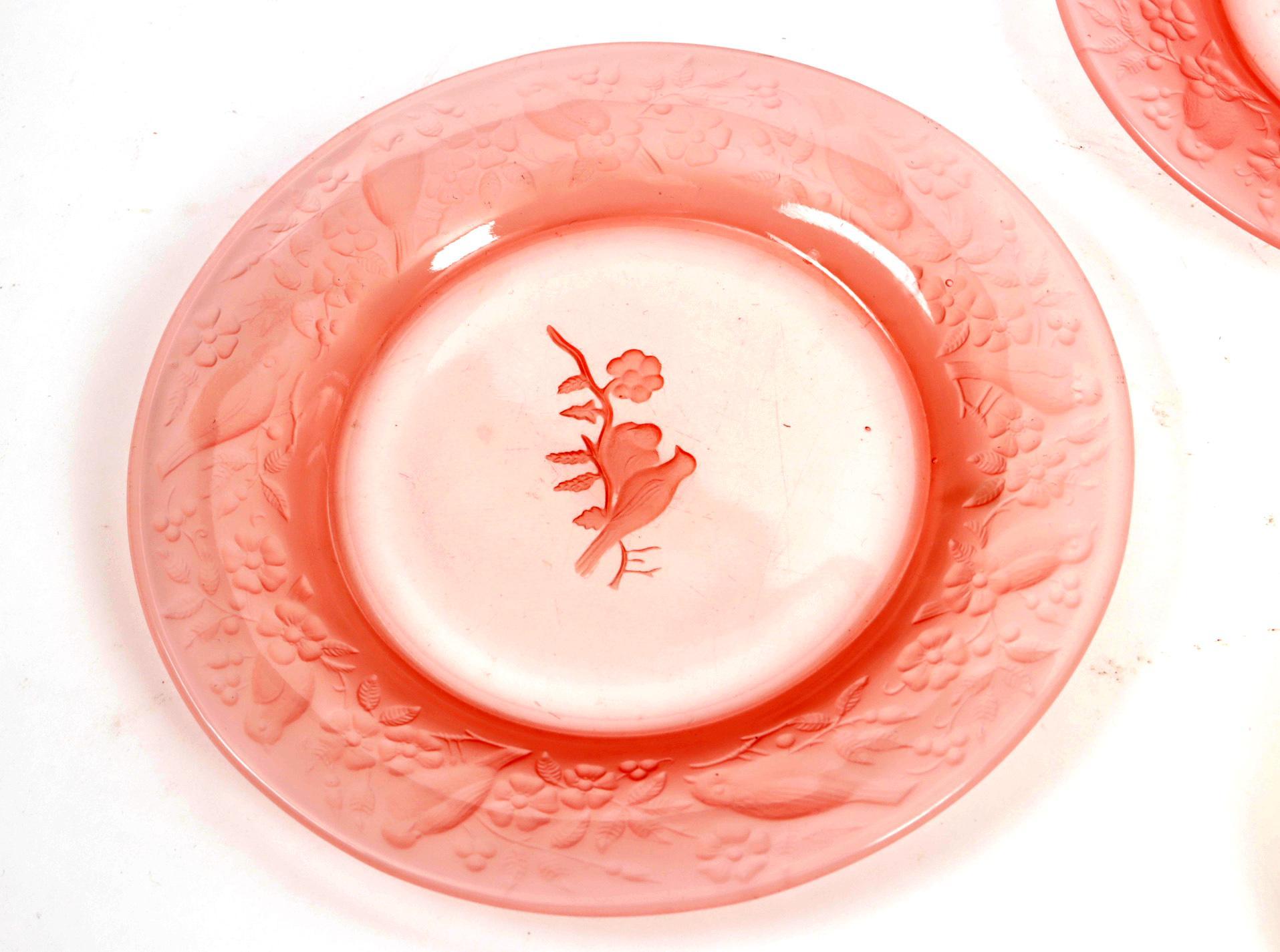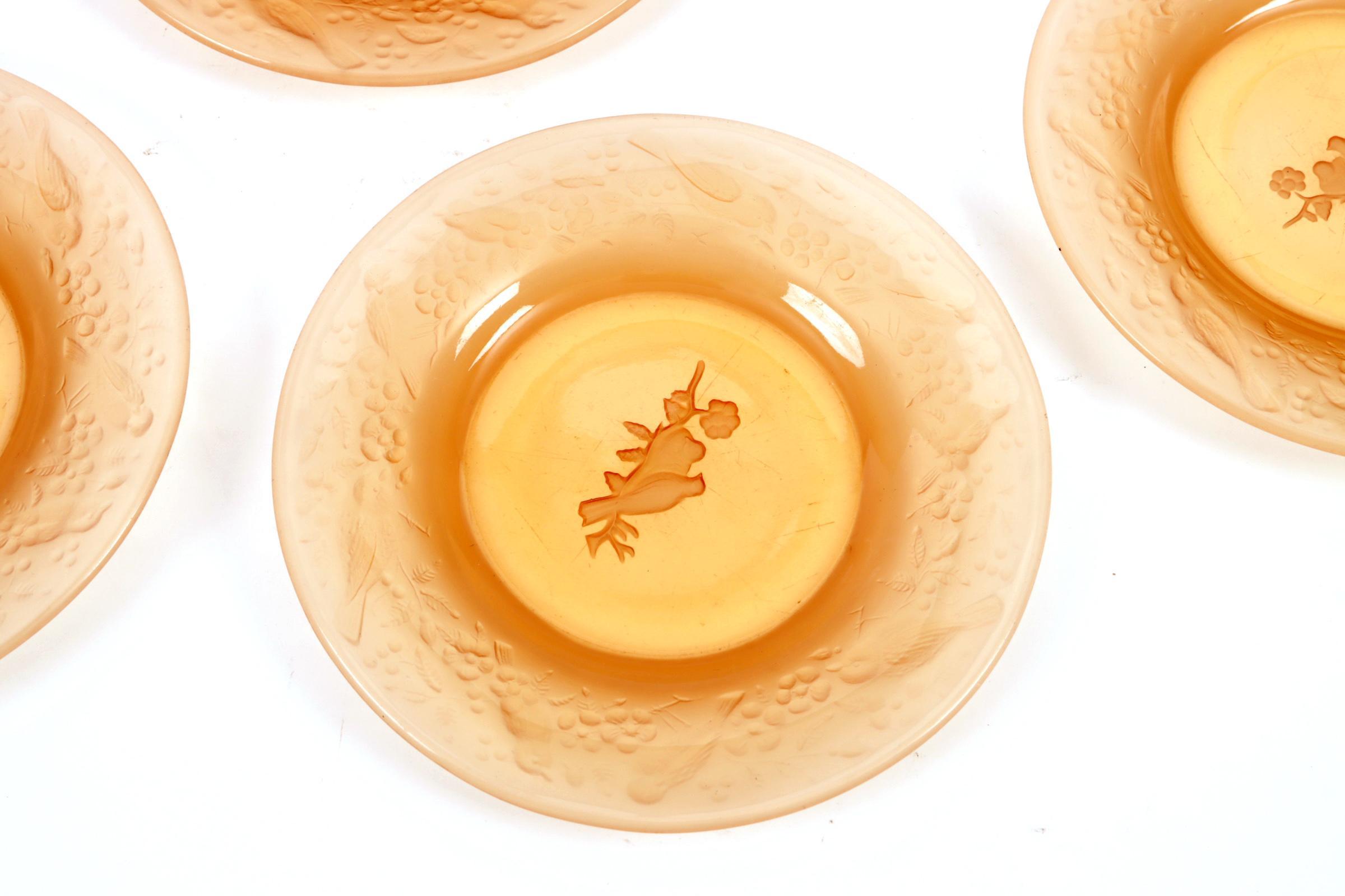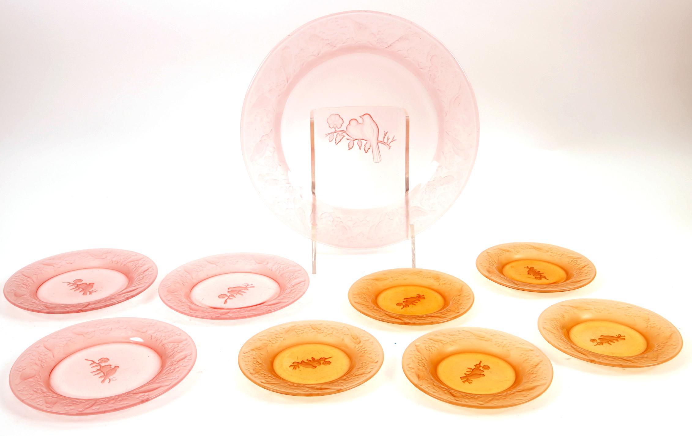 Geëtste glazen Art Deco gebakstel bestaande uit en grote schaal en 7 bordjes (3 bijpassend en 4 afwijkend)