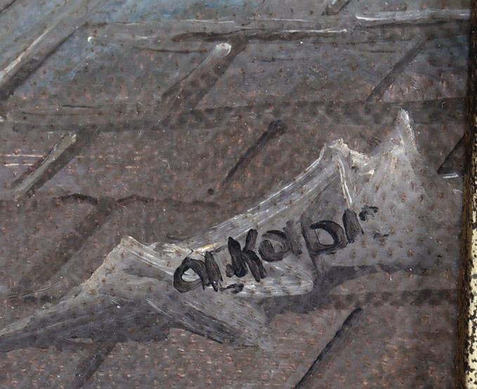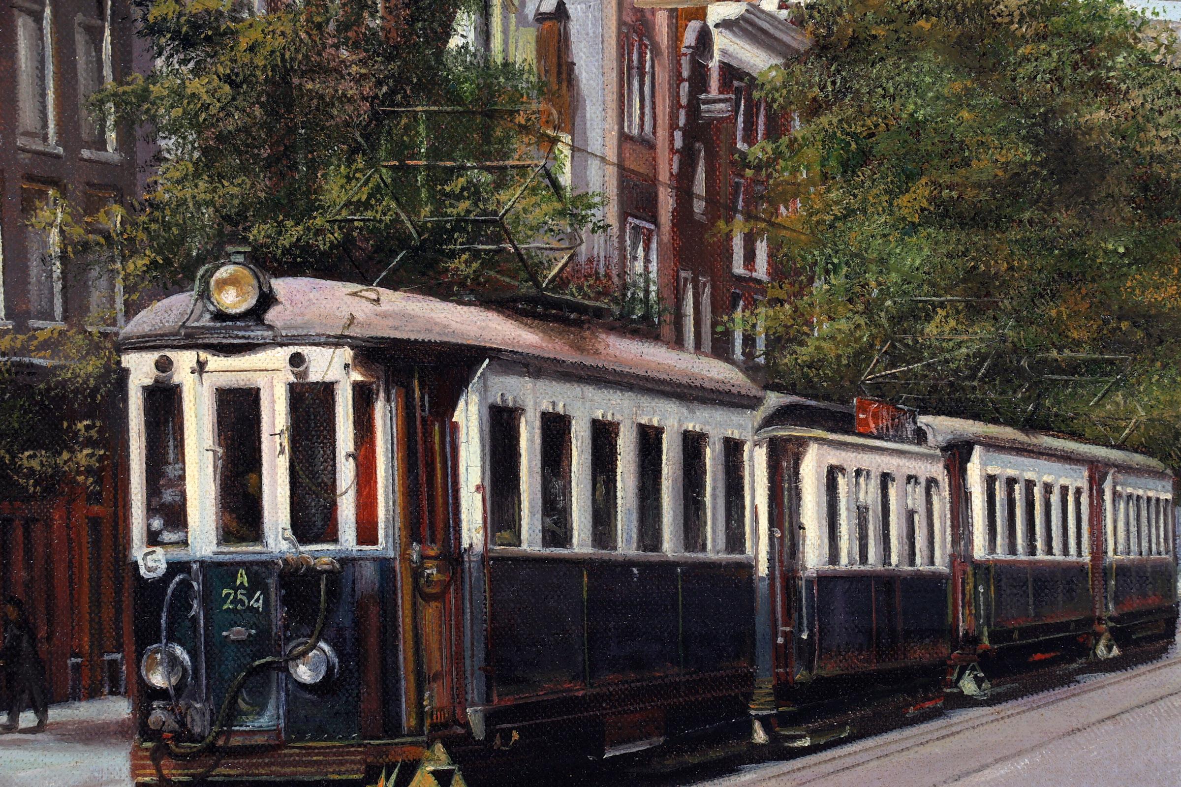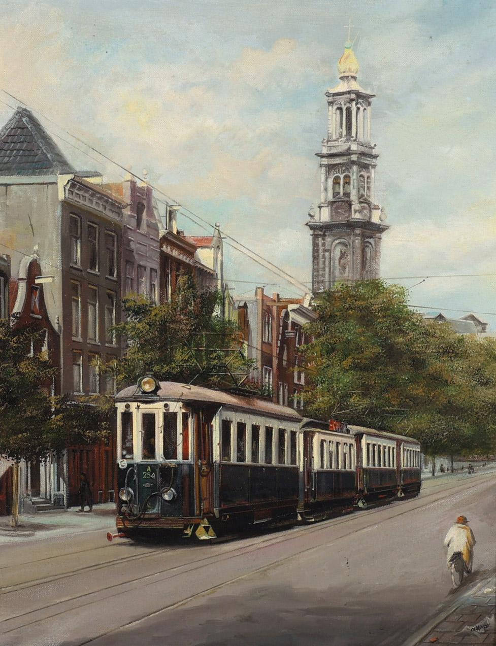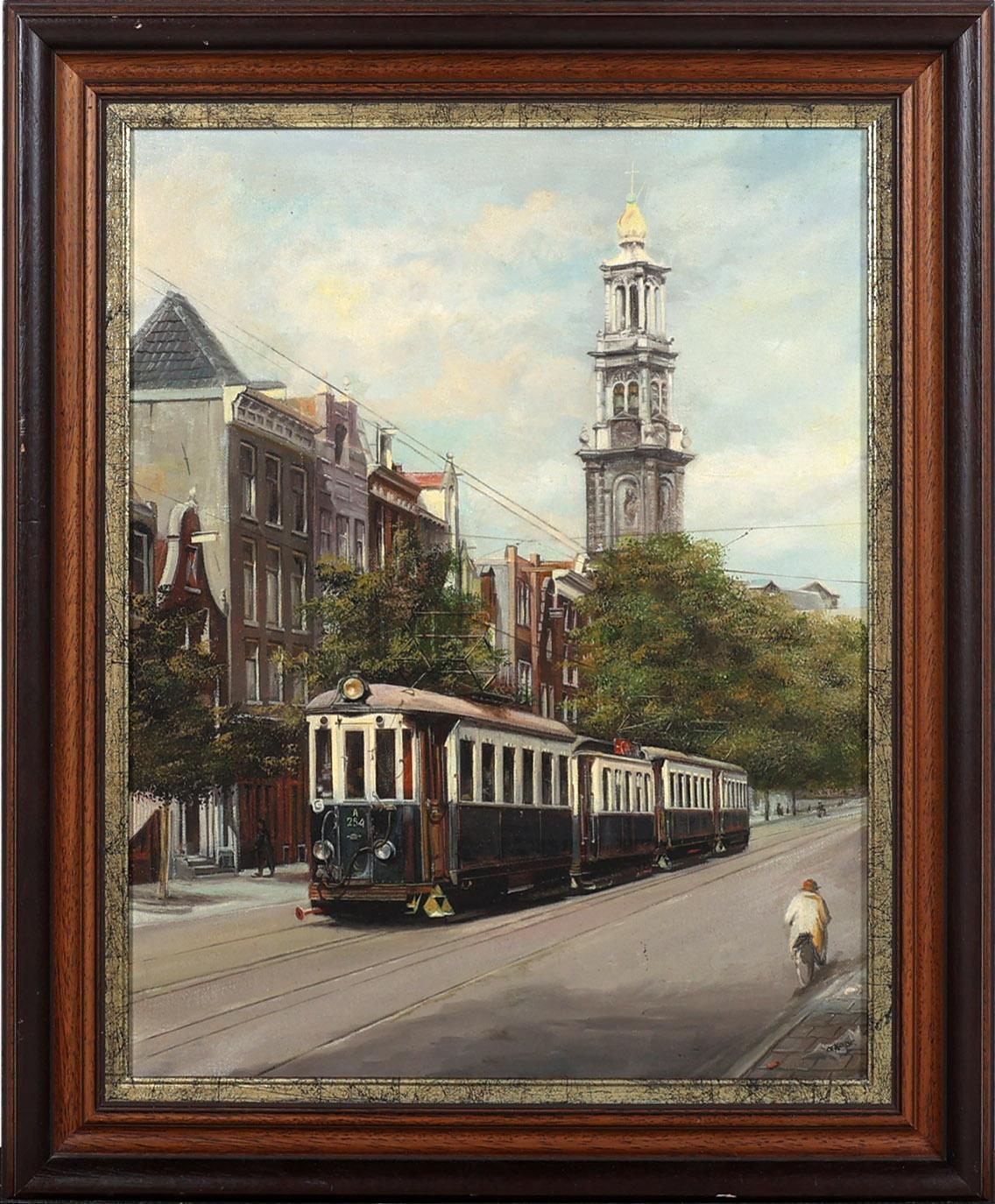 A. Kapr, Tram te Amsterdam, olieverf op doek, 50 x 40 cm.