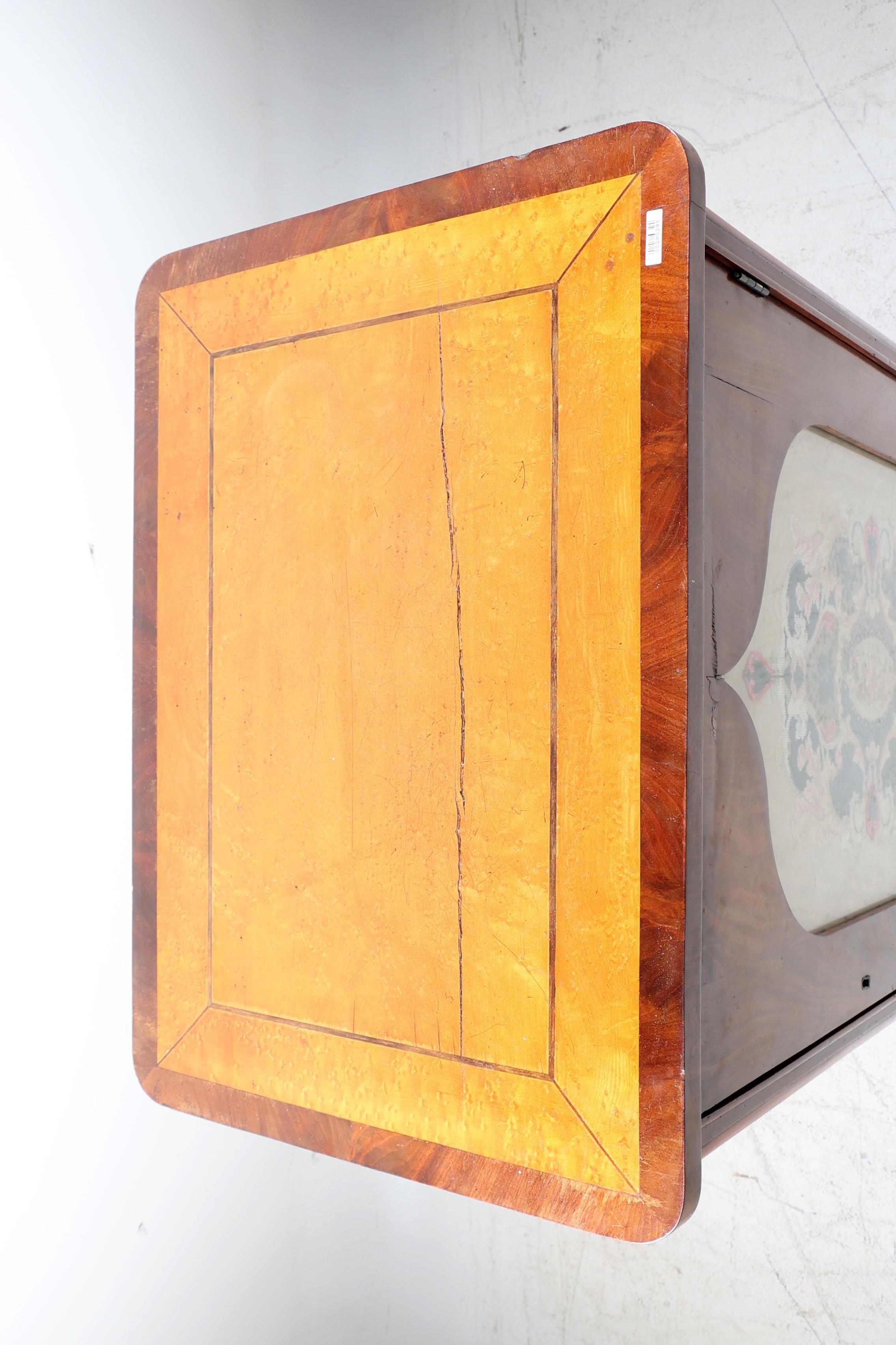 Antieke wortelnoten/mahoniehouten 1-deurs kast met geborduurde stoffering achter glas, h.83 x b.67 x d.48 cm.