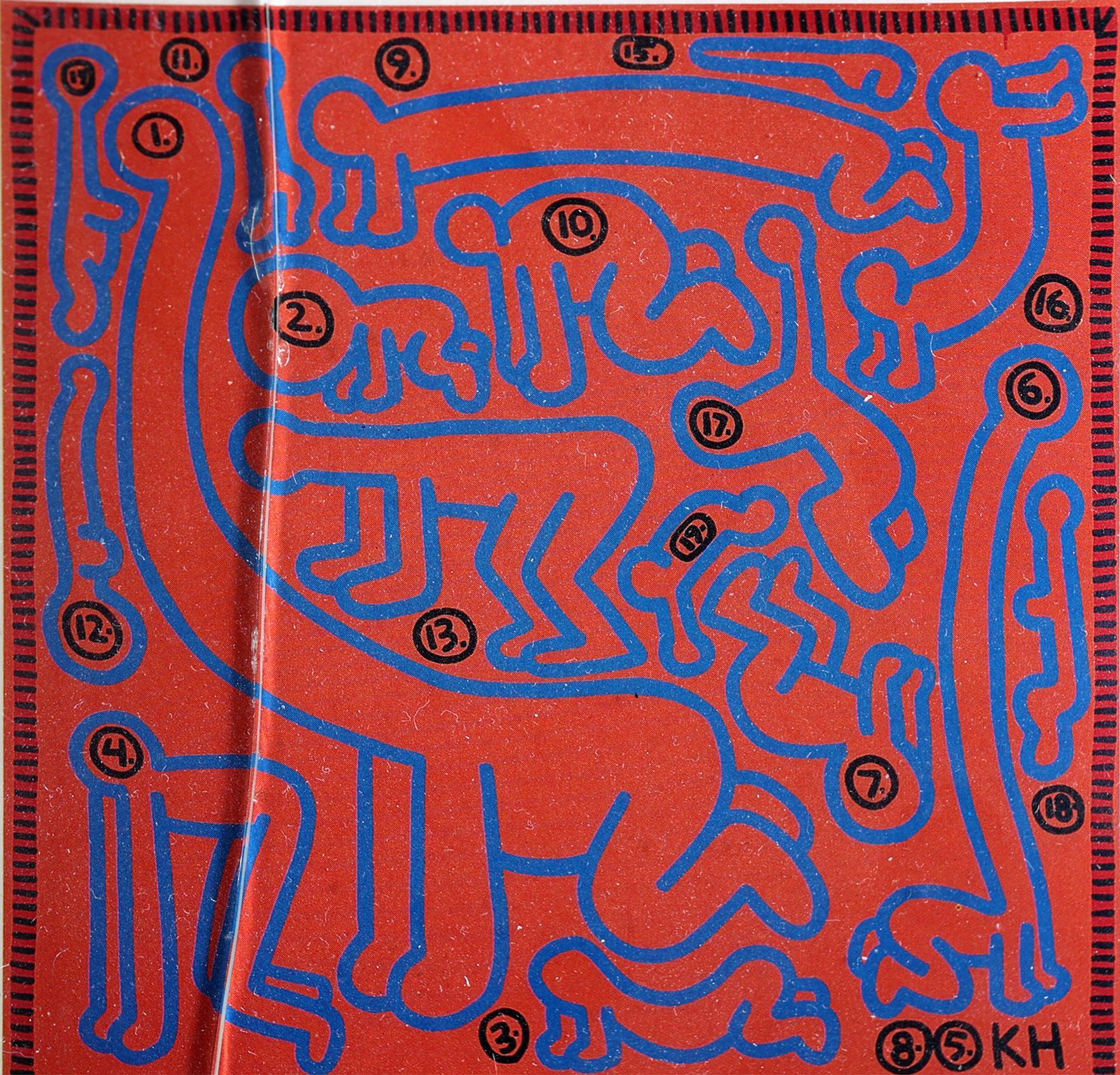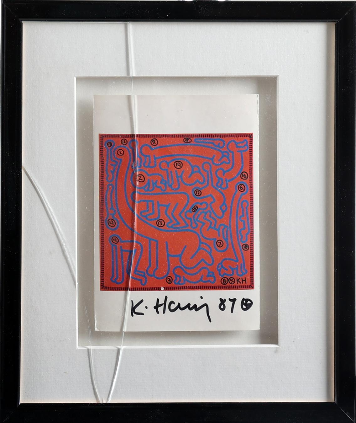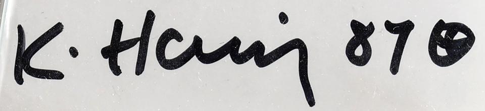 Handgesigneerde ansichtkaart van Keith Haring, 15 x 10,5 cm. (glas defect)