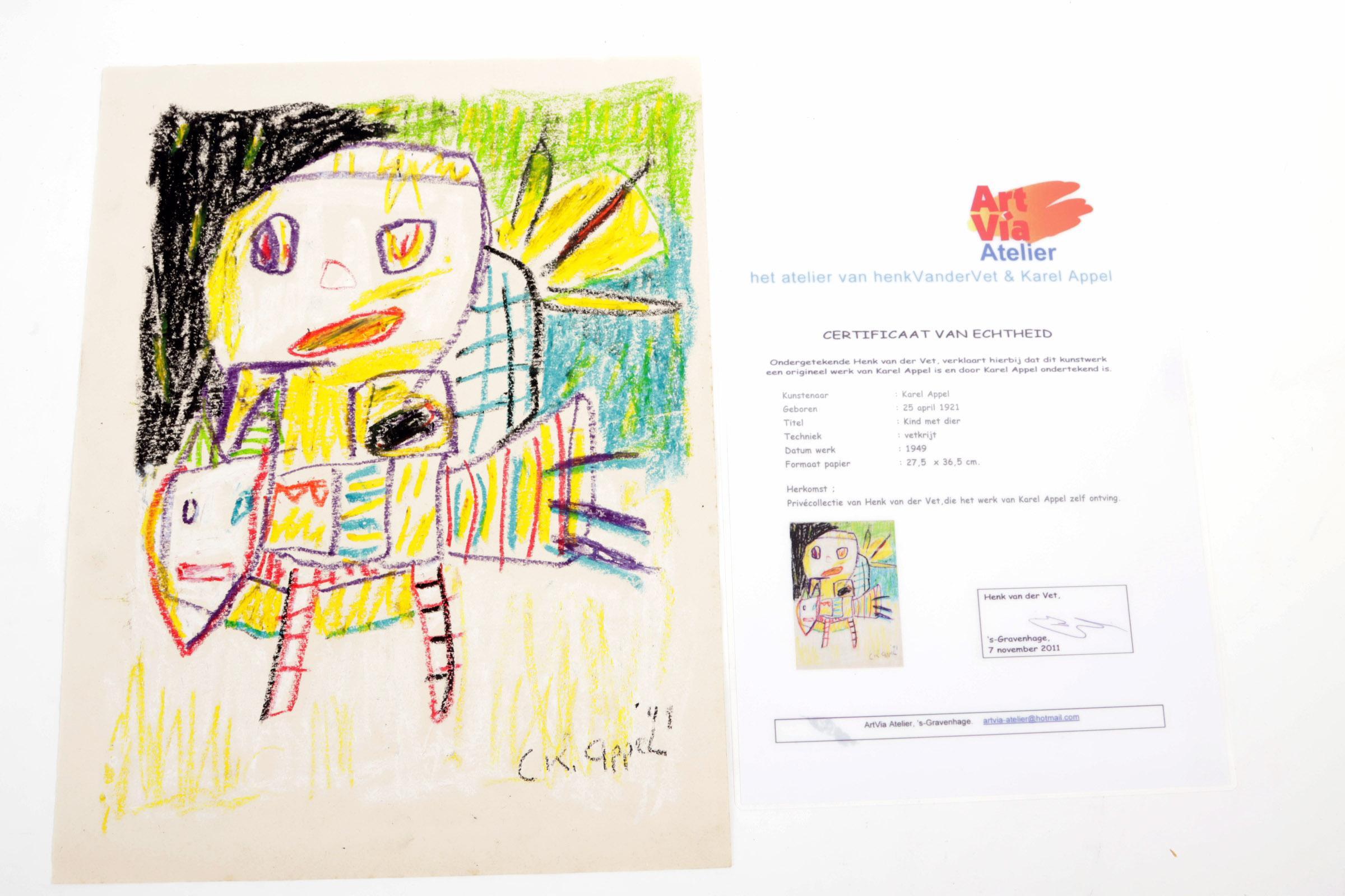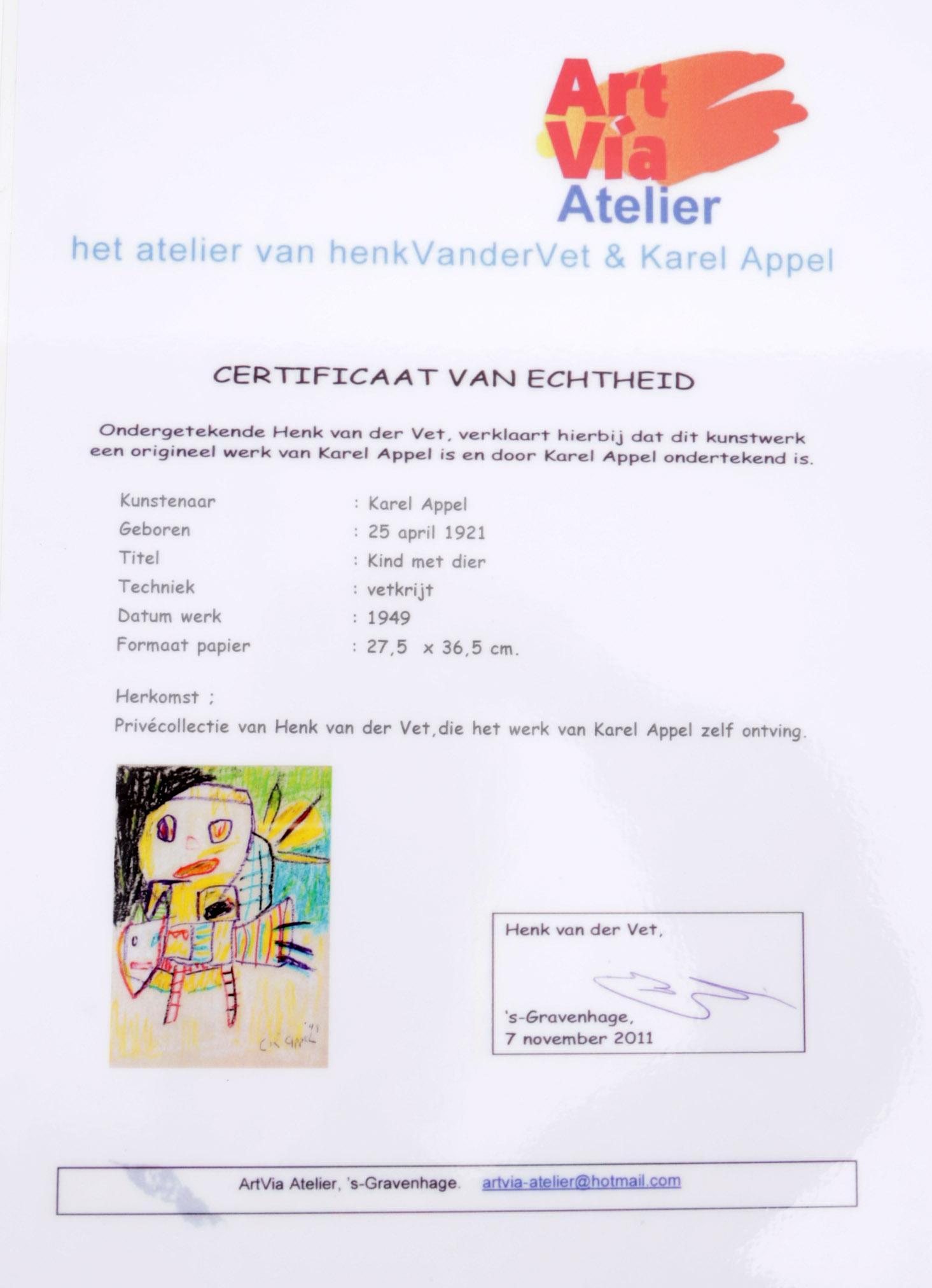 Christiaan (Karel) Appel (1921-2006), Kind met dier, krijttekening, gesigneerd en gedateerd 1949, inclusief certificaat van Henk van der Vet die de tekening rechtstreeks van de kunstenaar kreeg, 36,5 x 27,5 cm.
