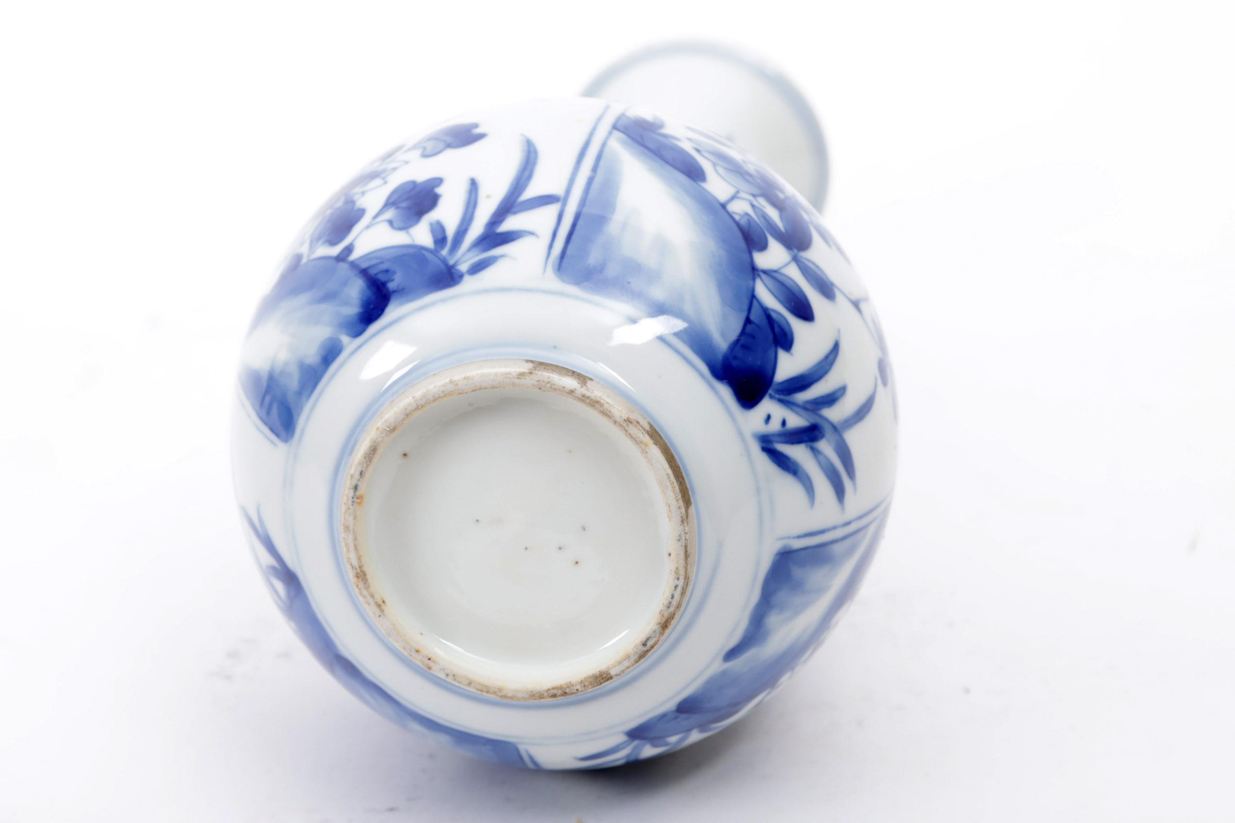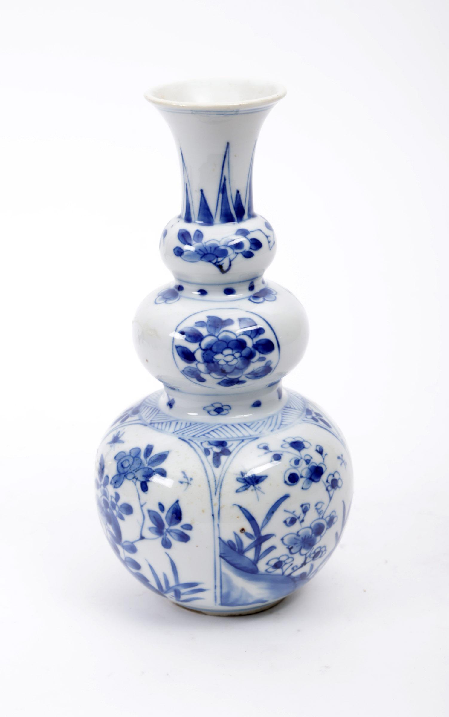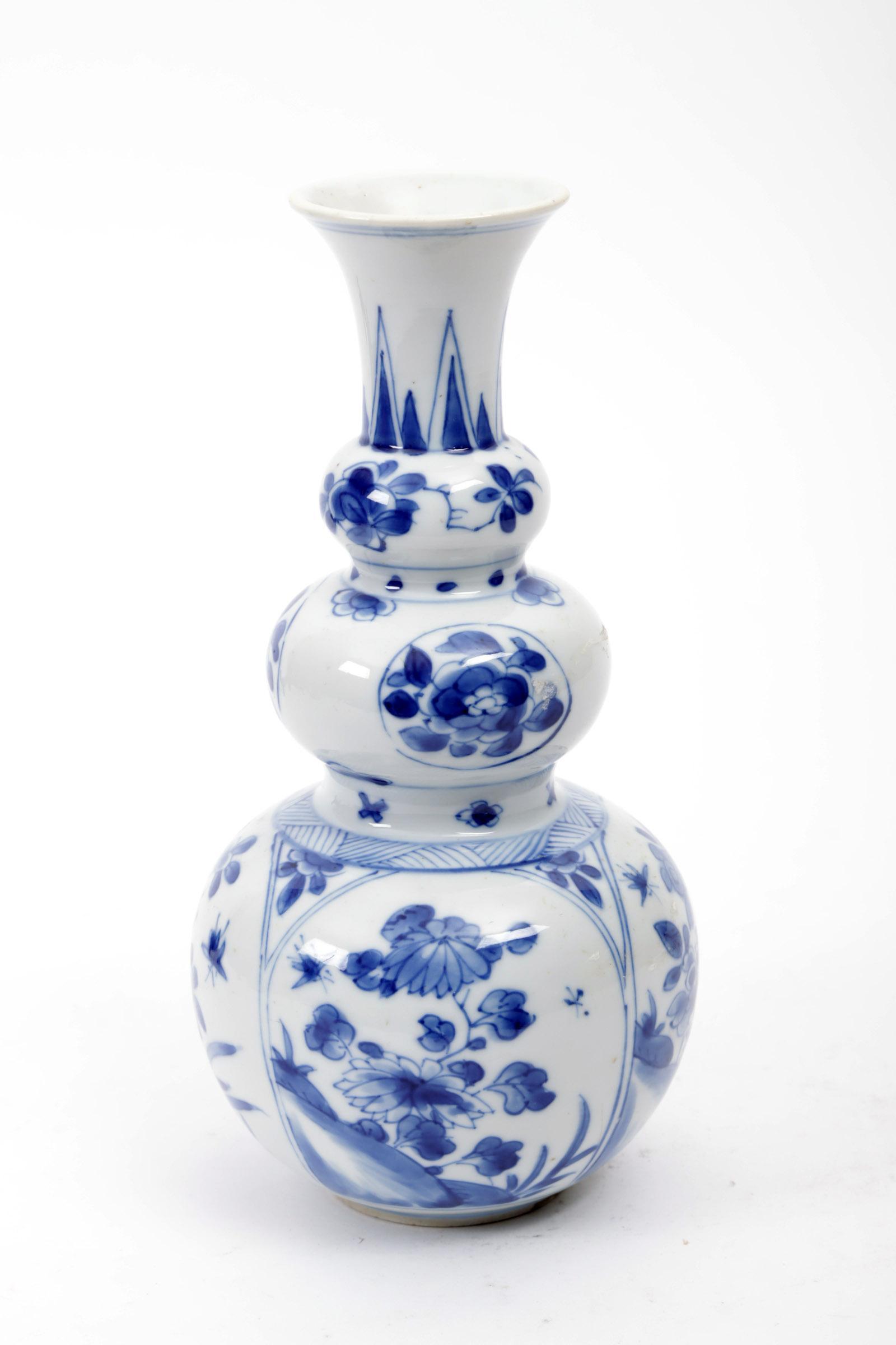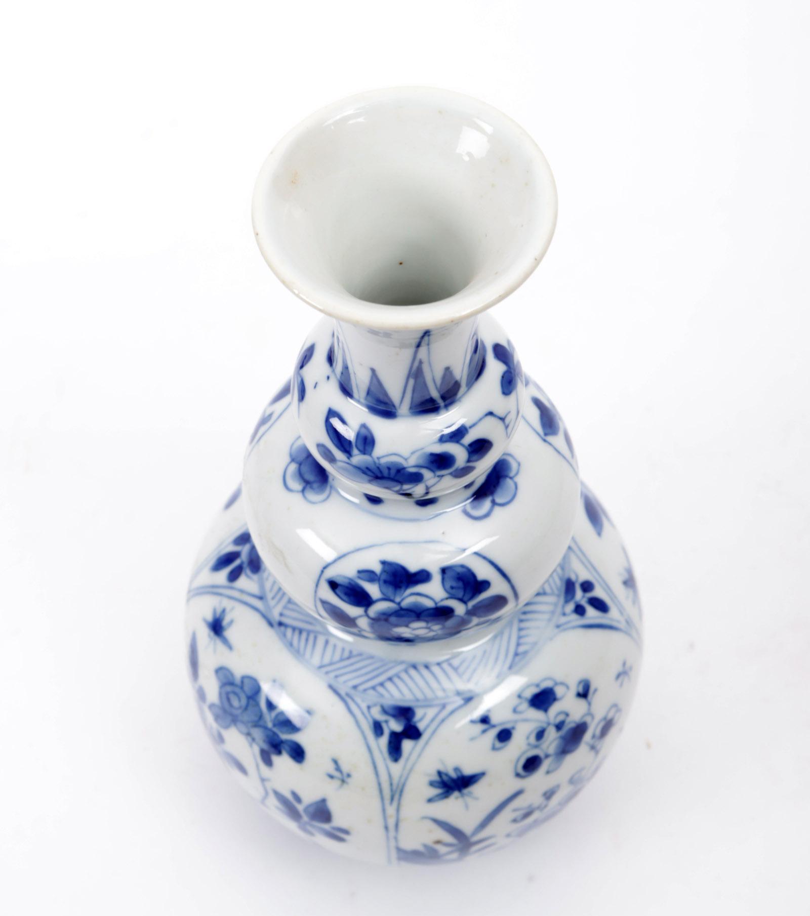 Antieke blauw/wit met bloemen gedecoreerde Chinees porseleinen kalebasvaas, h.22 cm.