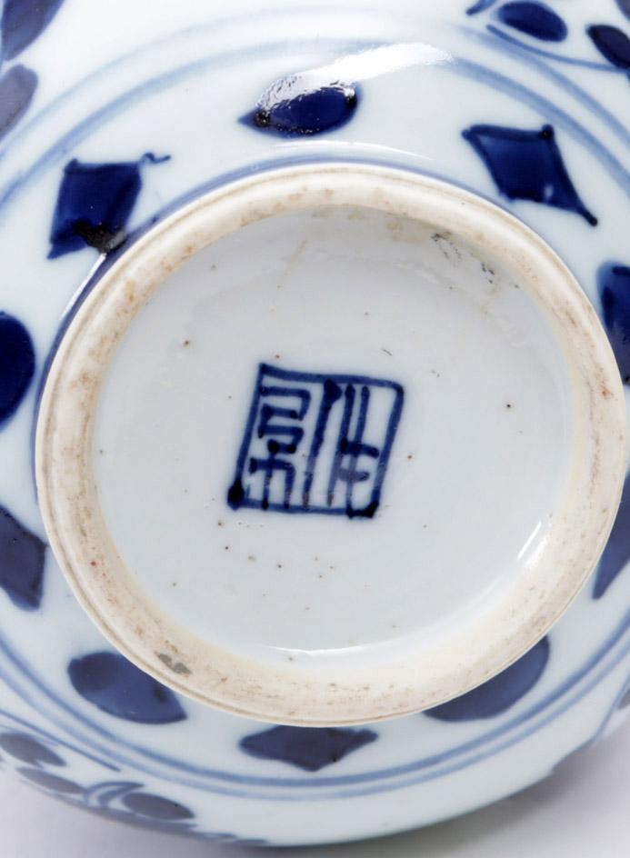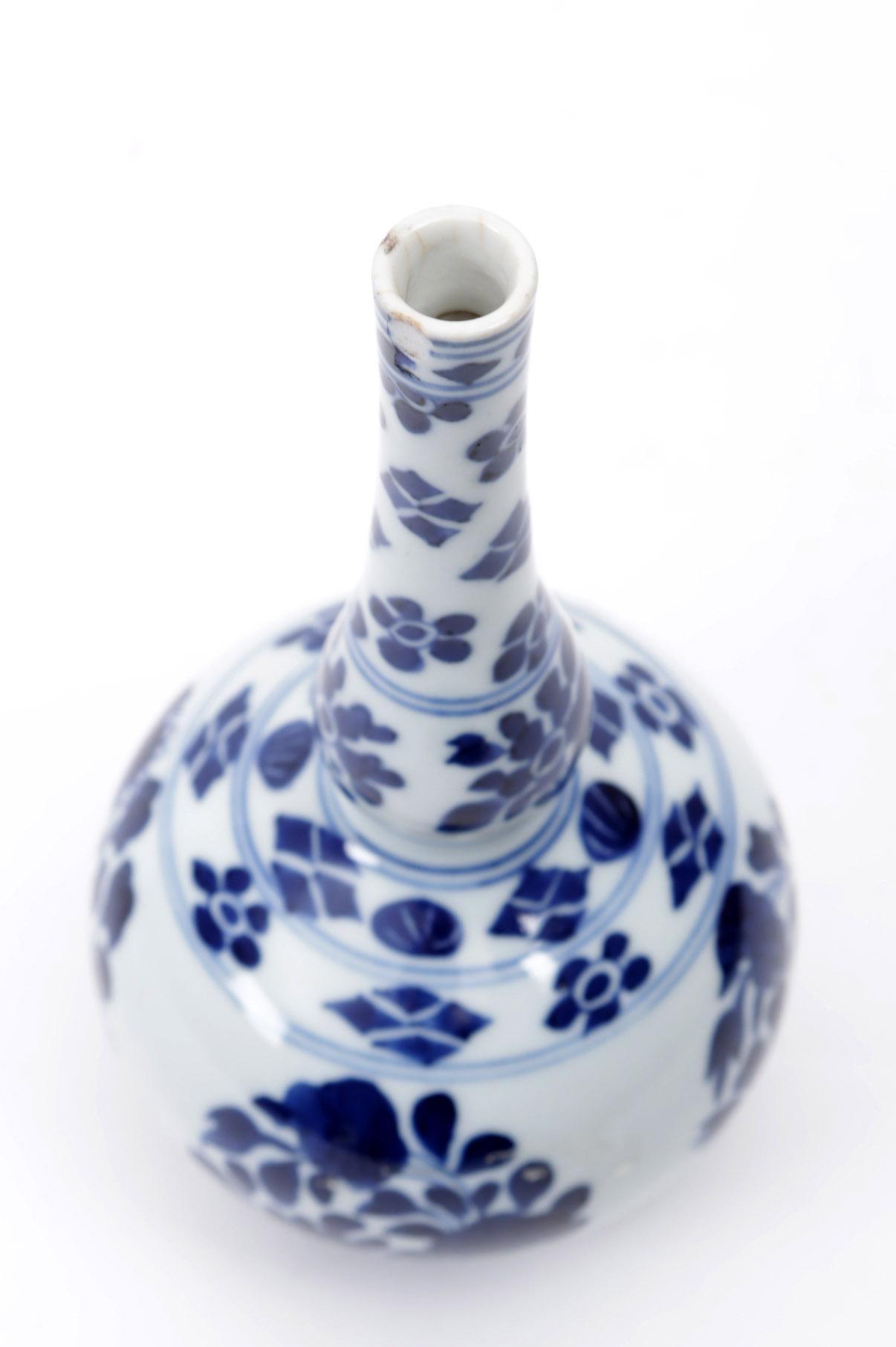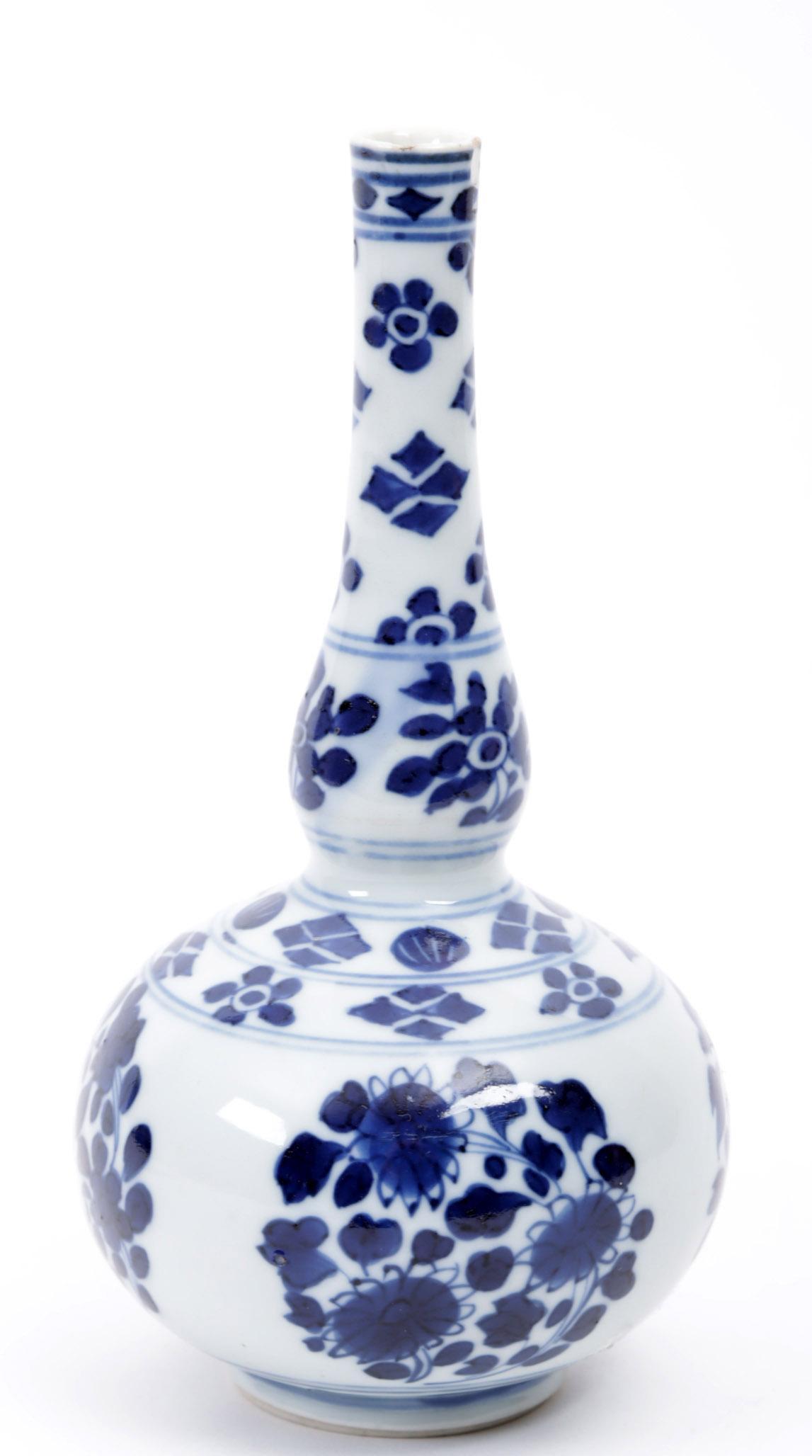 Antieke blauw/wit gedecoreerde Chinees porseleinen steelvaas, h.15 cm.