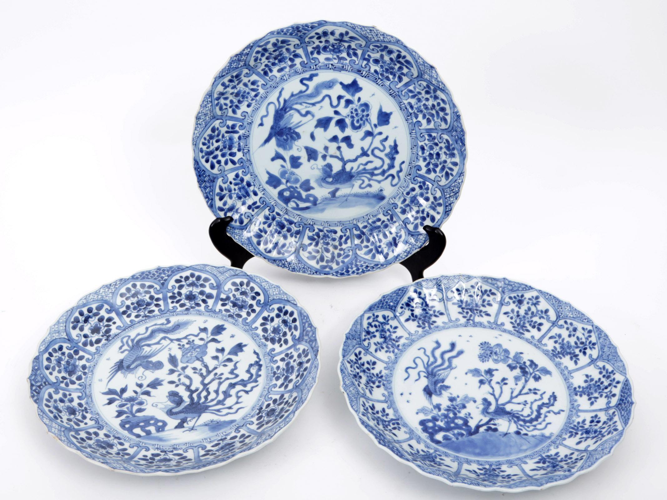 3 Met vogels en bloemen gedecoreerde Chinees porseleinen borden, diam.27 cm.