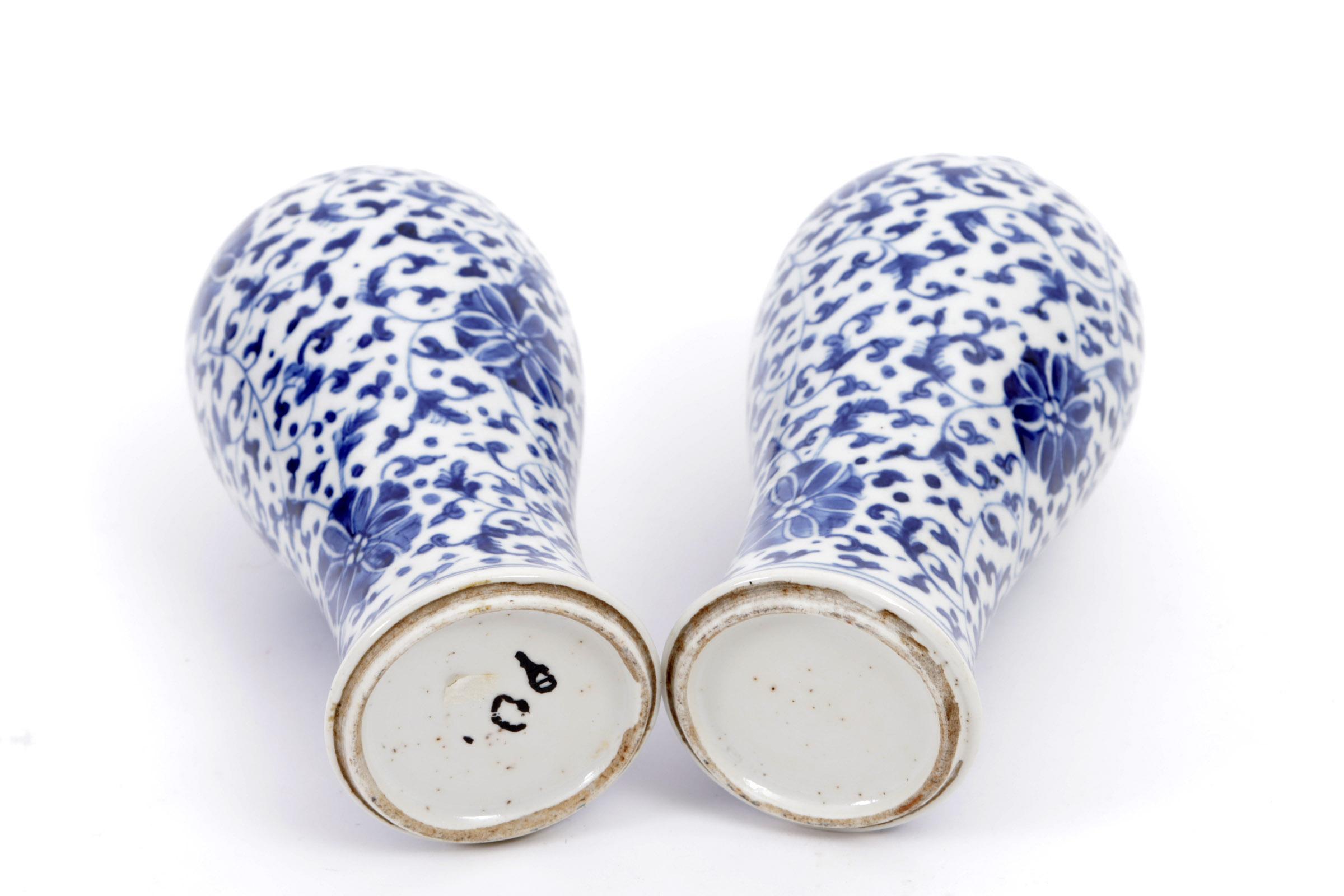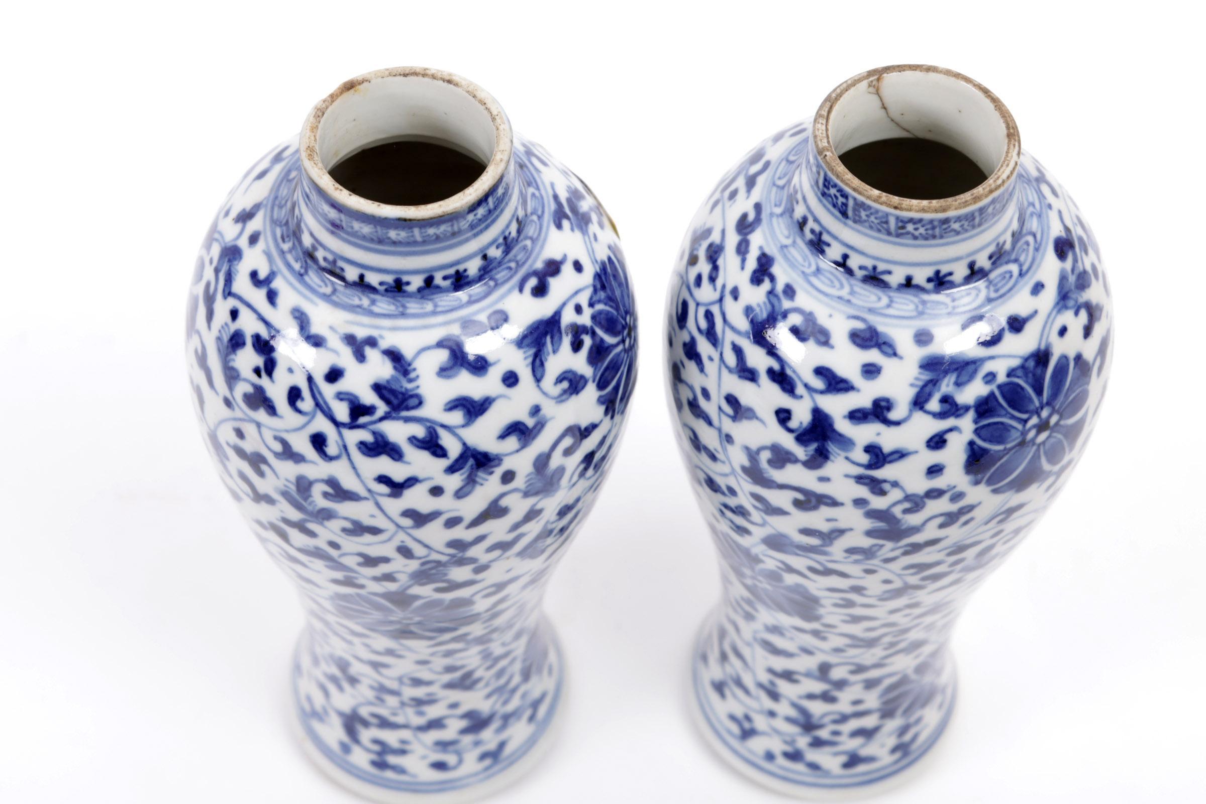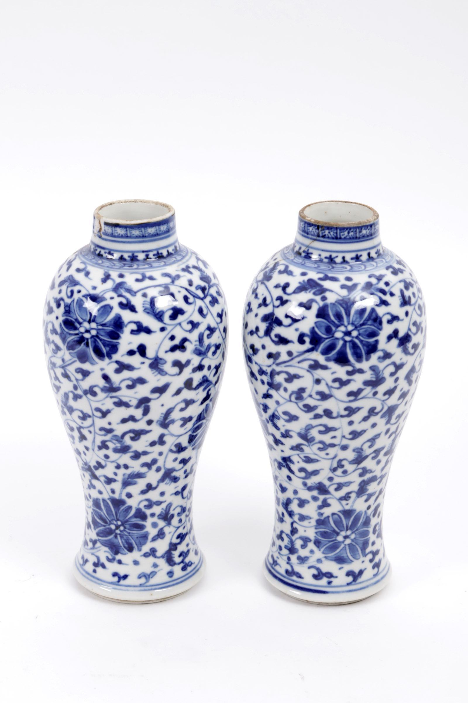 2 Blauw/wit met bloemen gedecoreerde Chinees porseleinen vazen, h.18 cm.