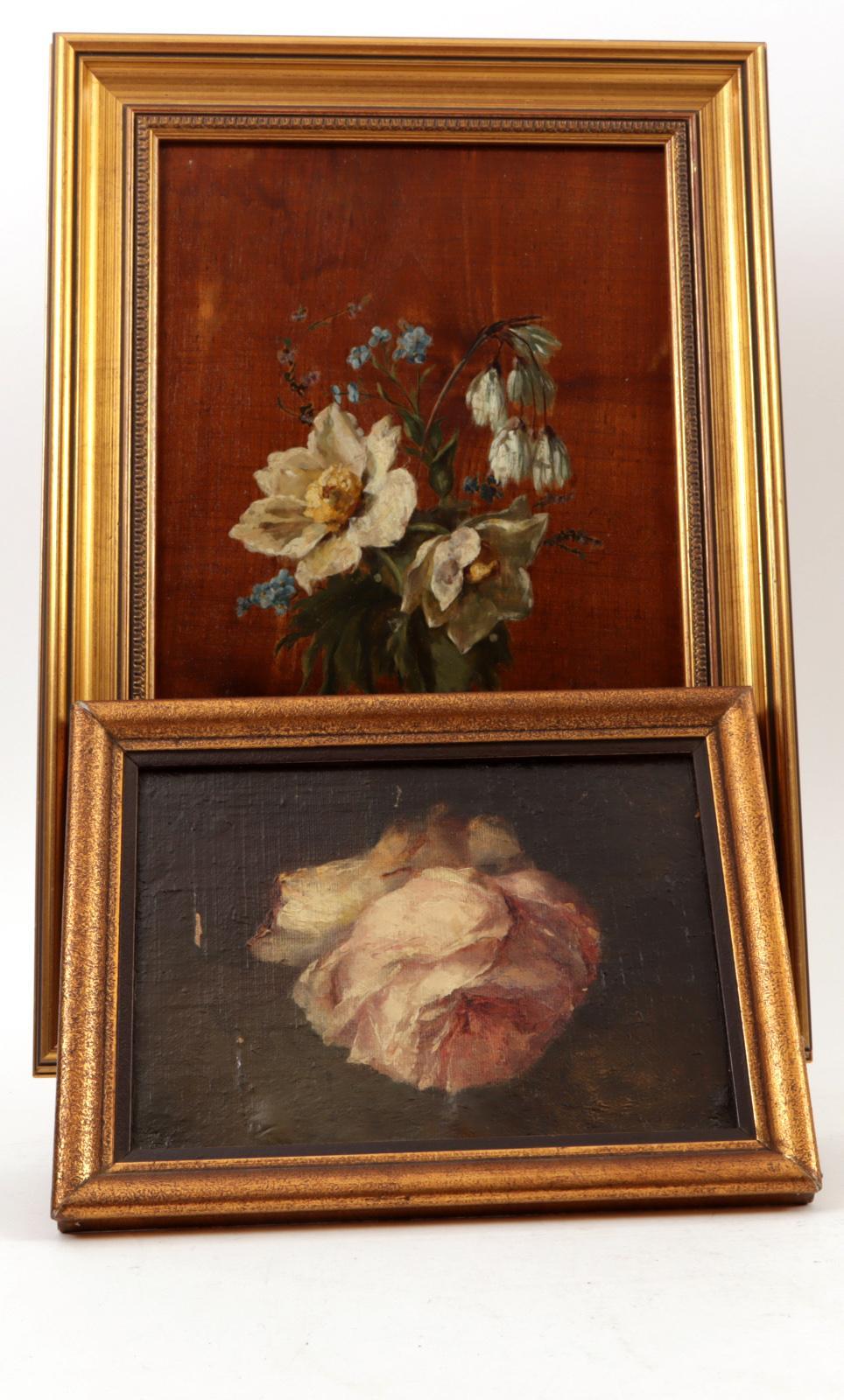 Onb.meester, Bloemstilleven, olieverf op board, 30 x 20 cm. en Onb.meester, Stilleven van een roos, maroefle