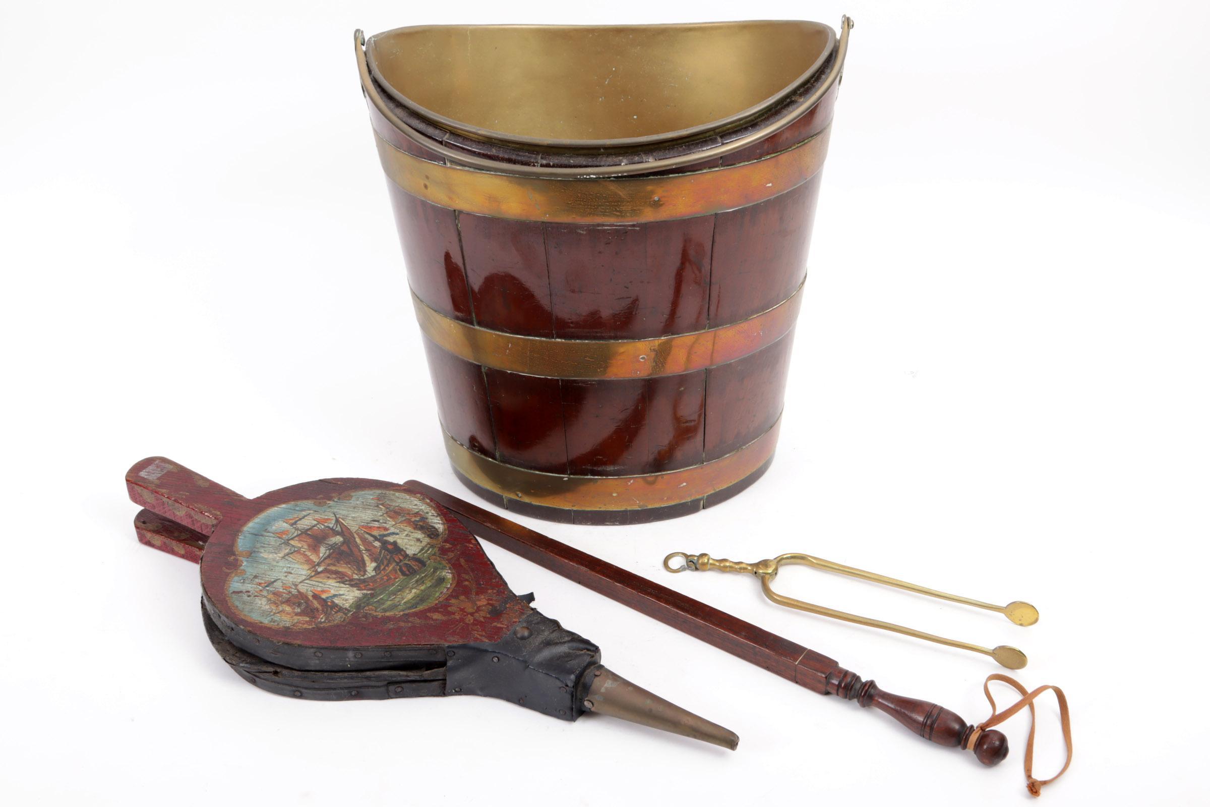 Koop van antieke Empire thee-emmer, ellenmaat, kolentang en beschilderde blaasbalg