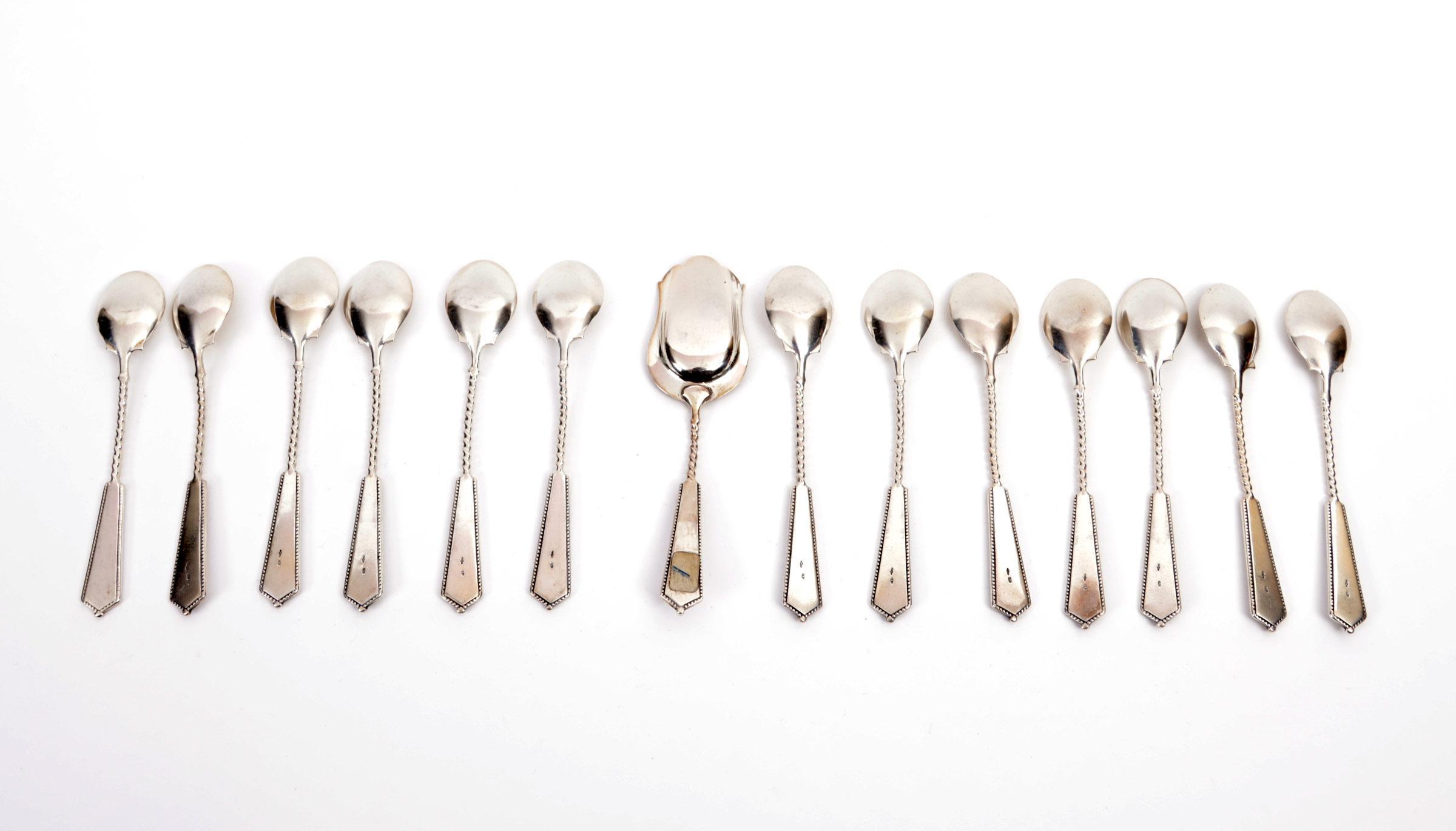 Dertien 2e gehalte zilveren koffielepels en een suikerschep, 216 gram