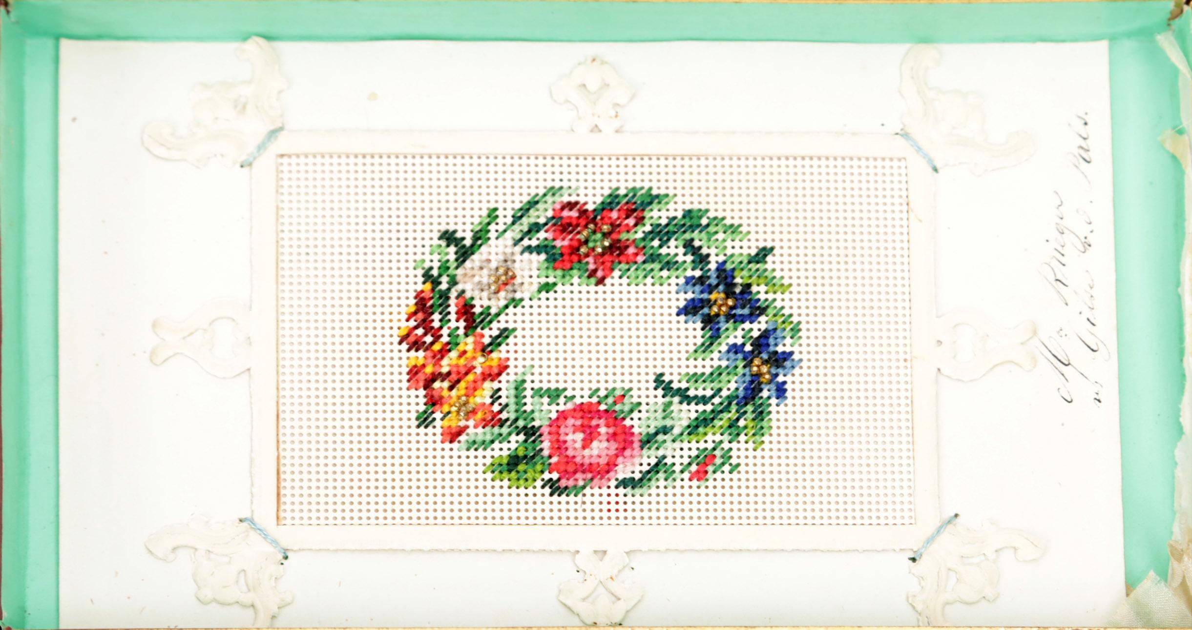 Antiek album, de Souvenier met diverse borduurwerkjes, etc.