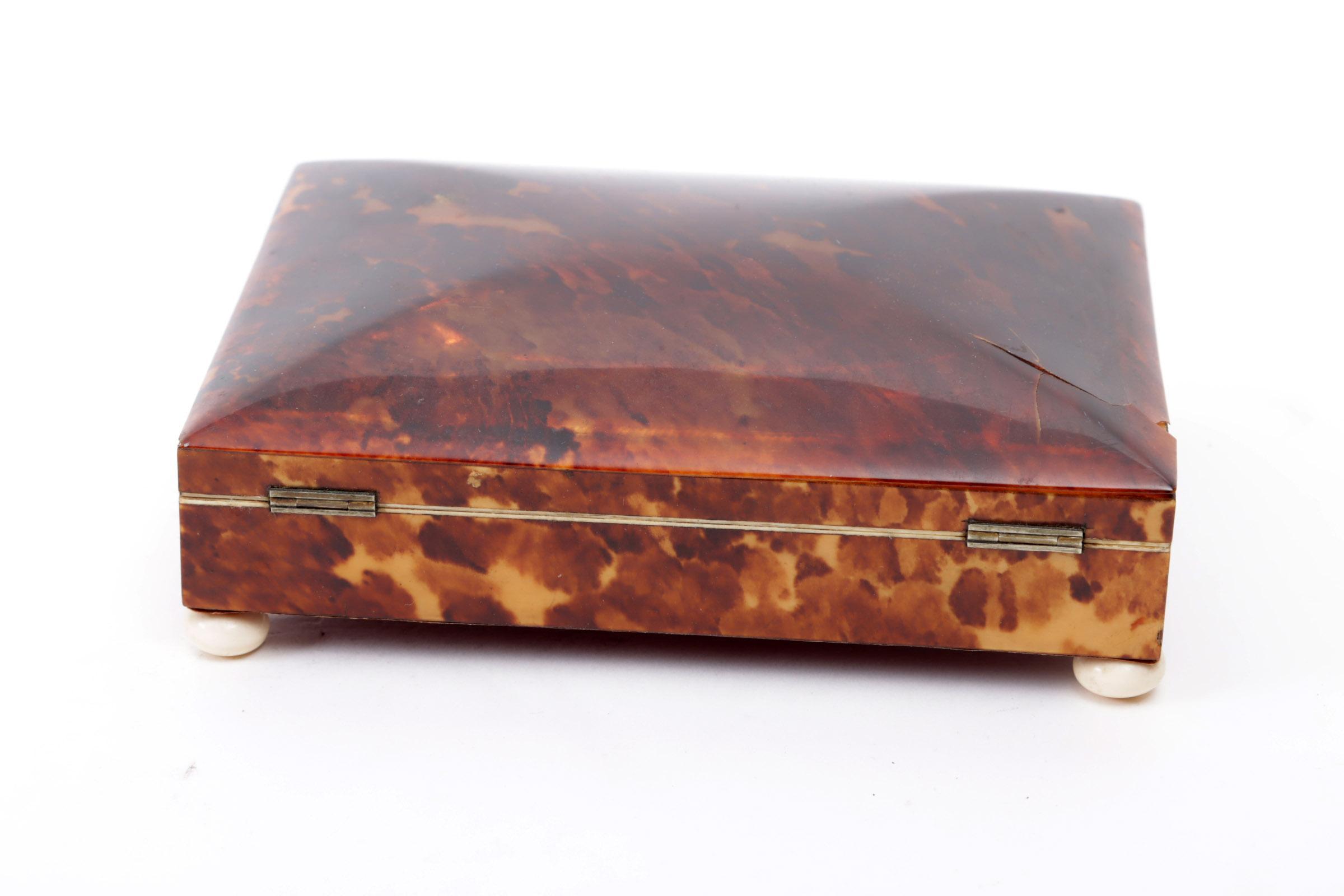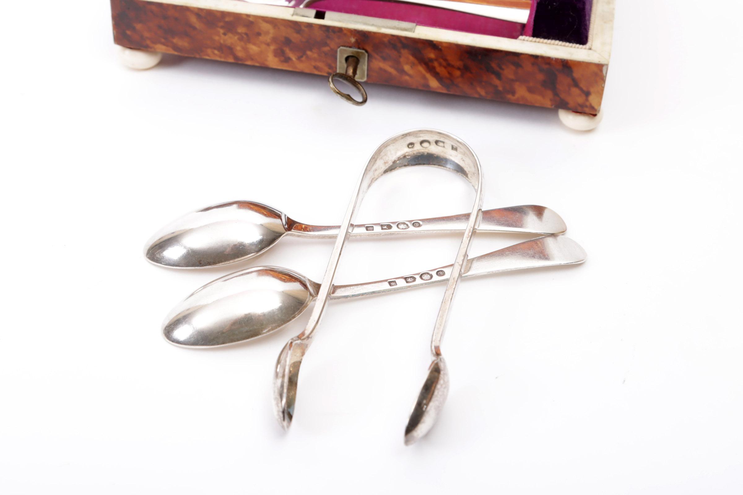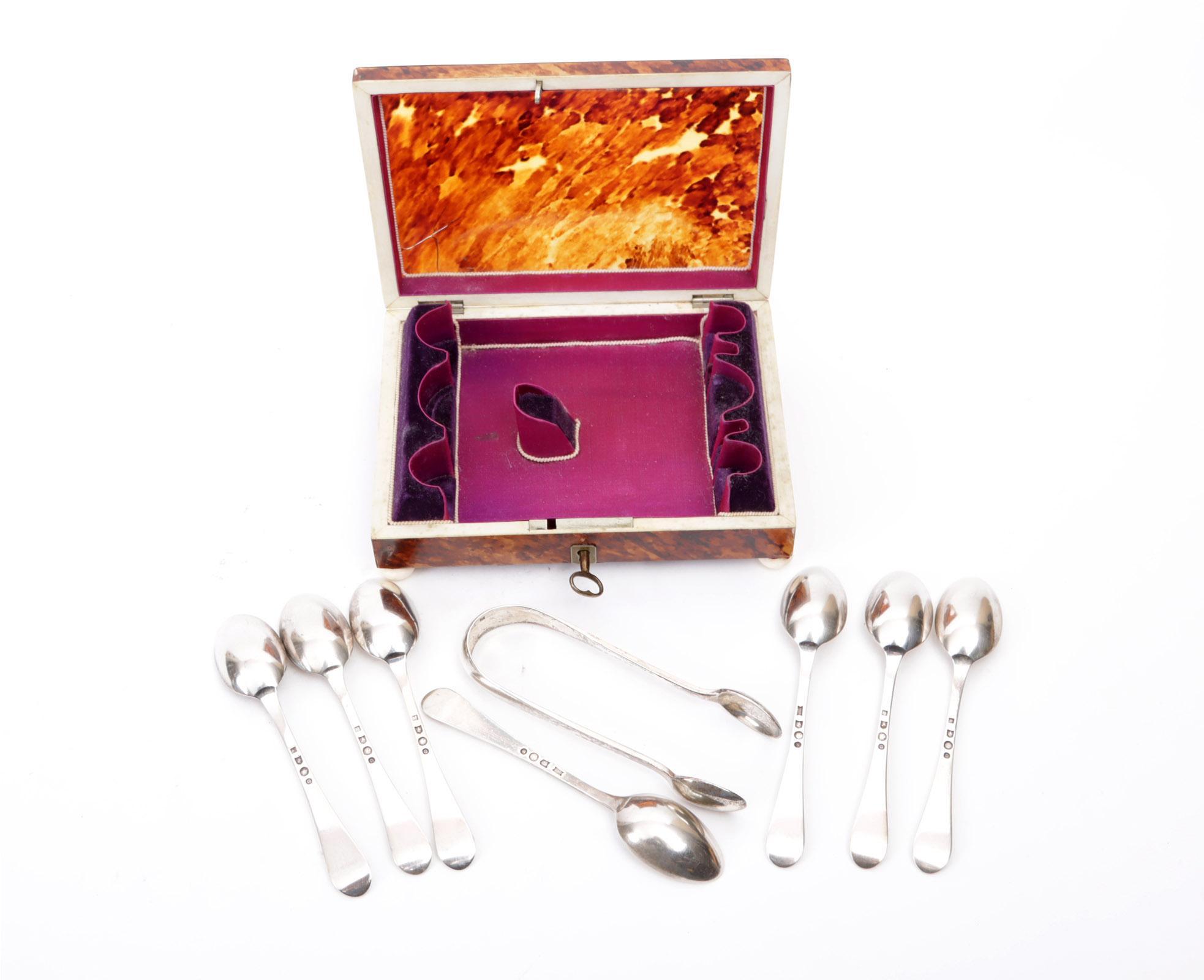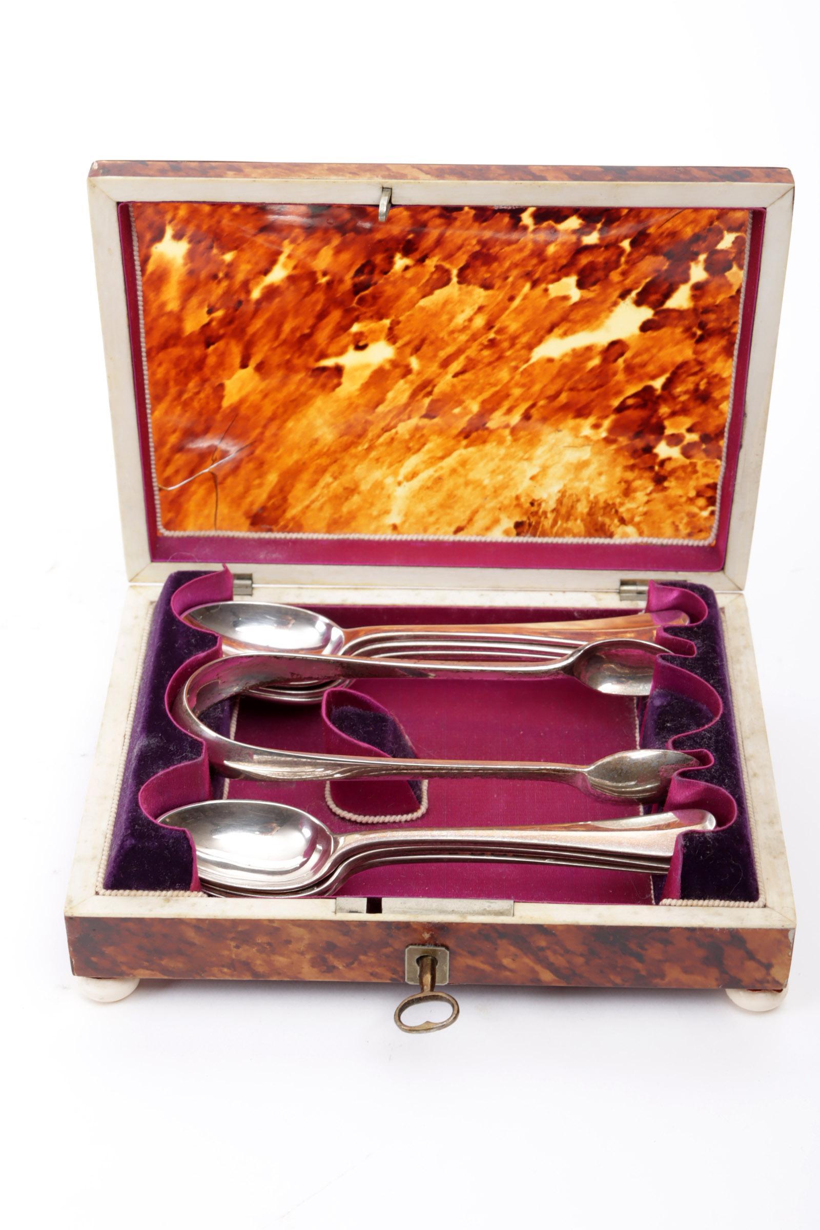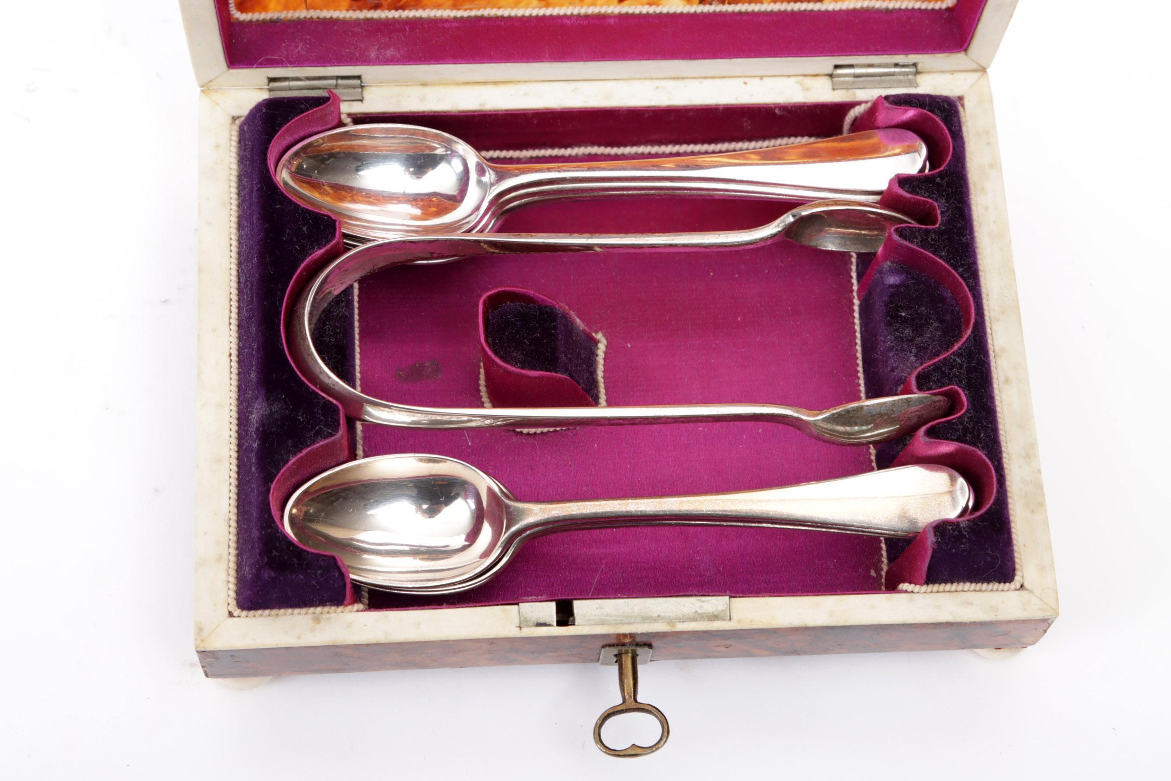 Antiek schildpad lepeldoosje met inhoud van zeven 1e gehalte lepels en een suikertang, zilvergewicht 188 gram