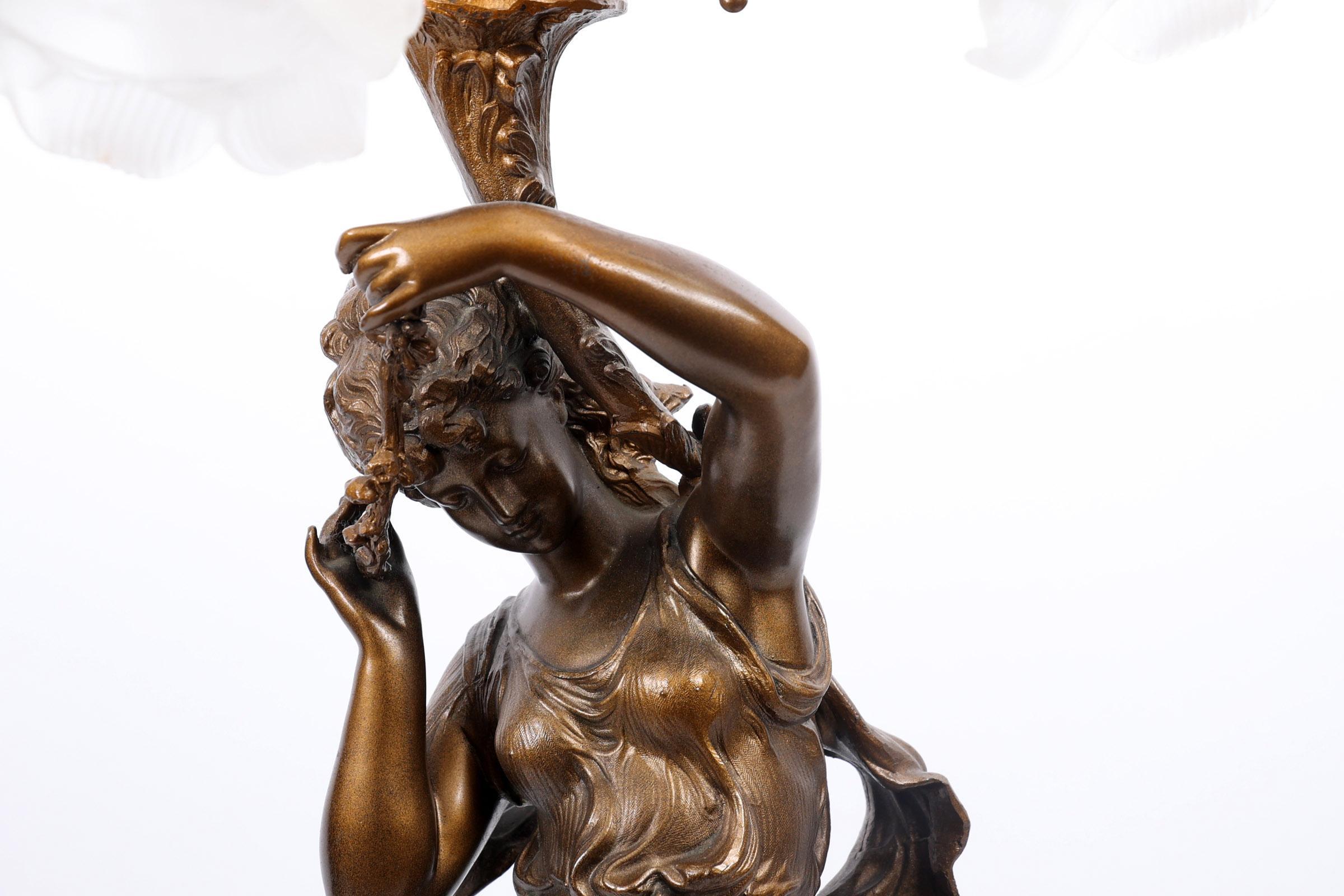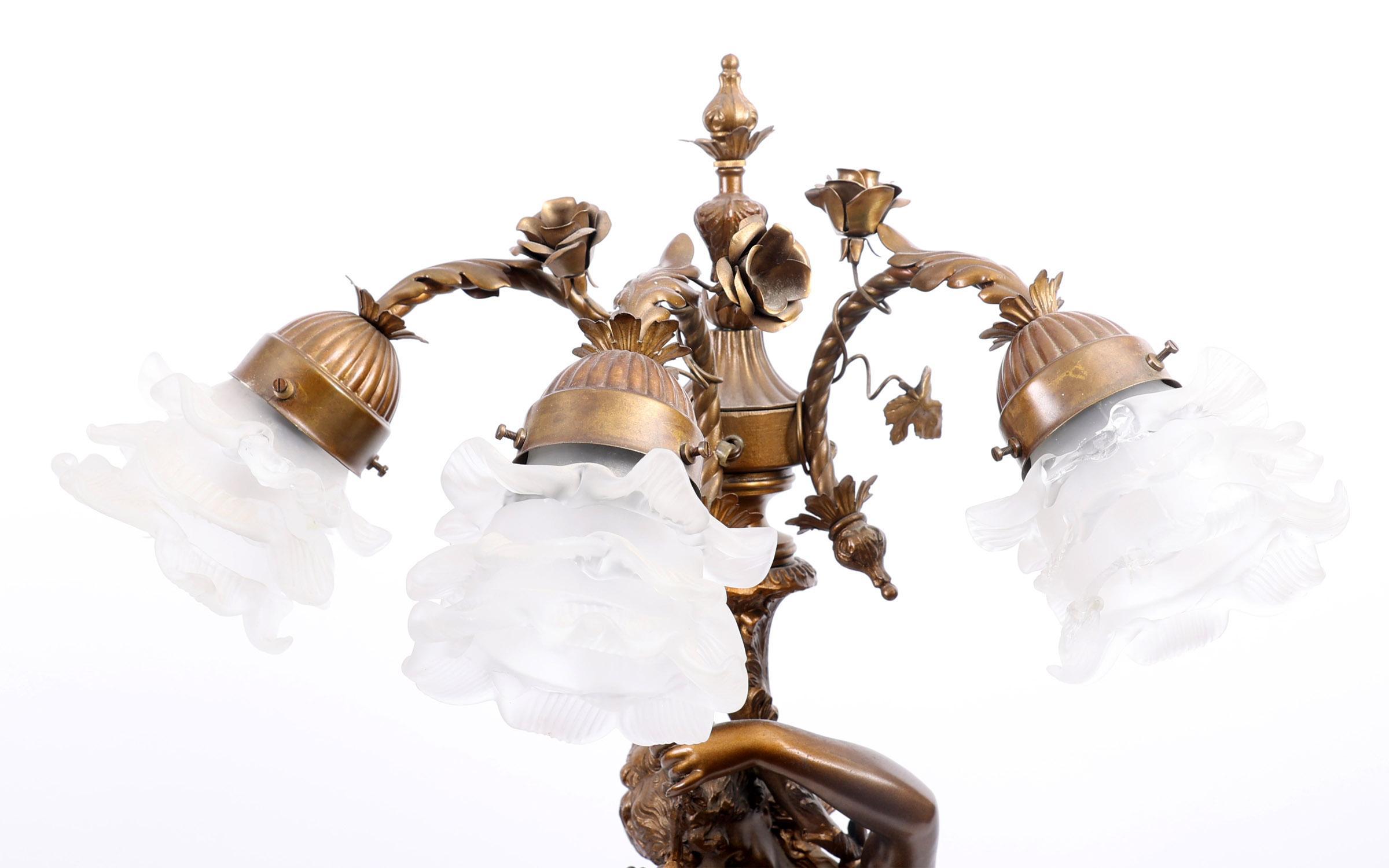 Bronskleurig legering lamp met 3 kristallen kelken met voorstelling van moeder en kind rustend op marmeren basement, ca. h.77 cm.