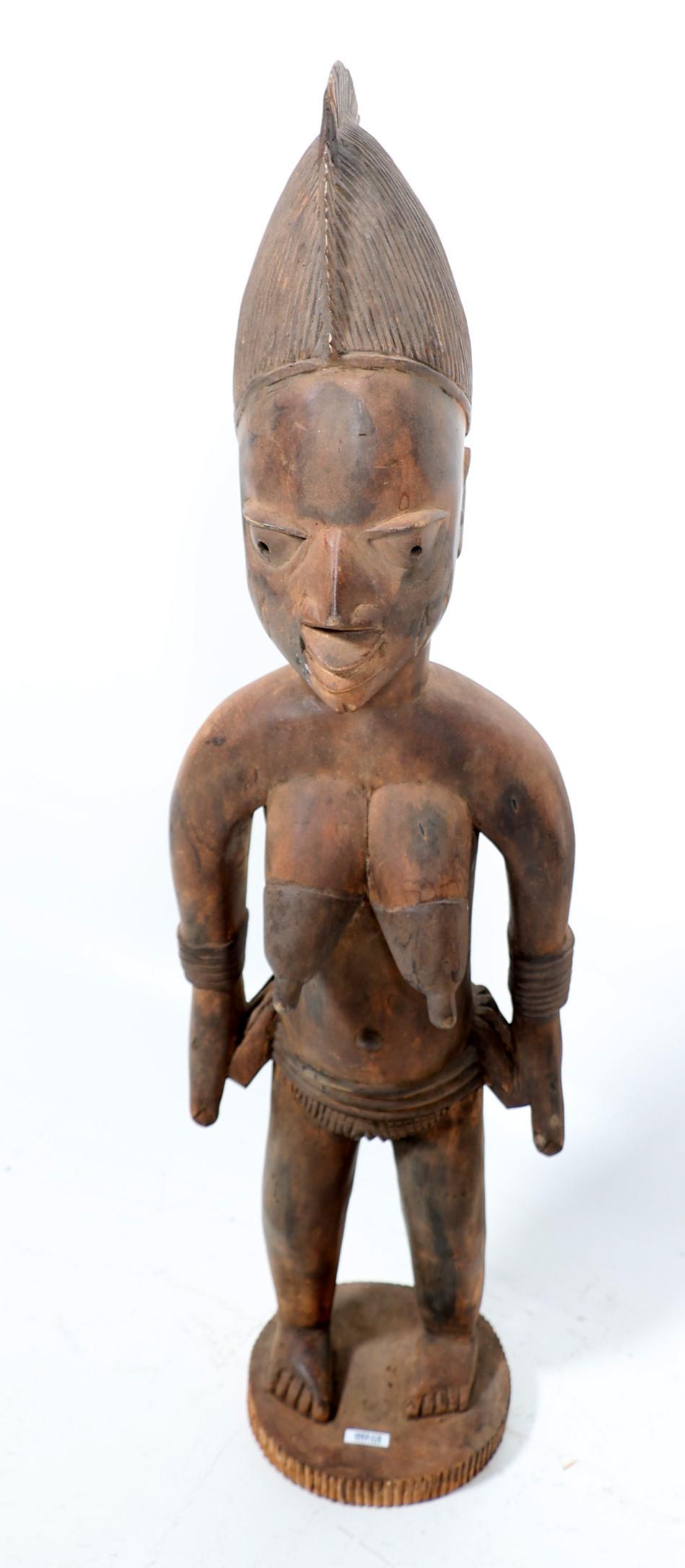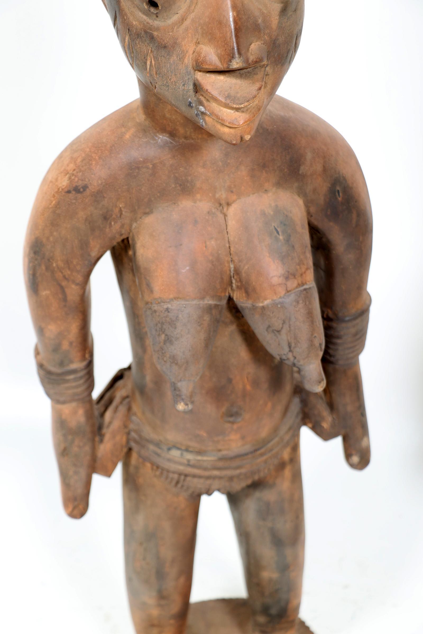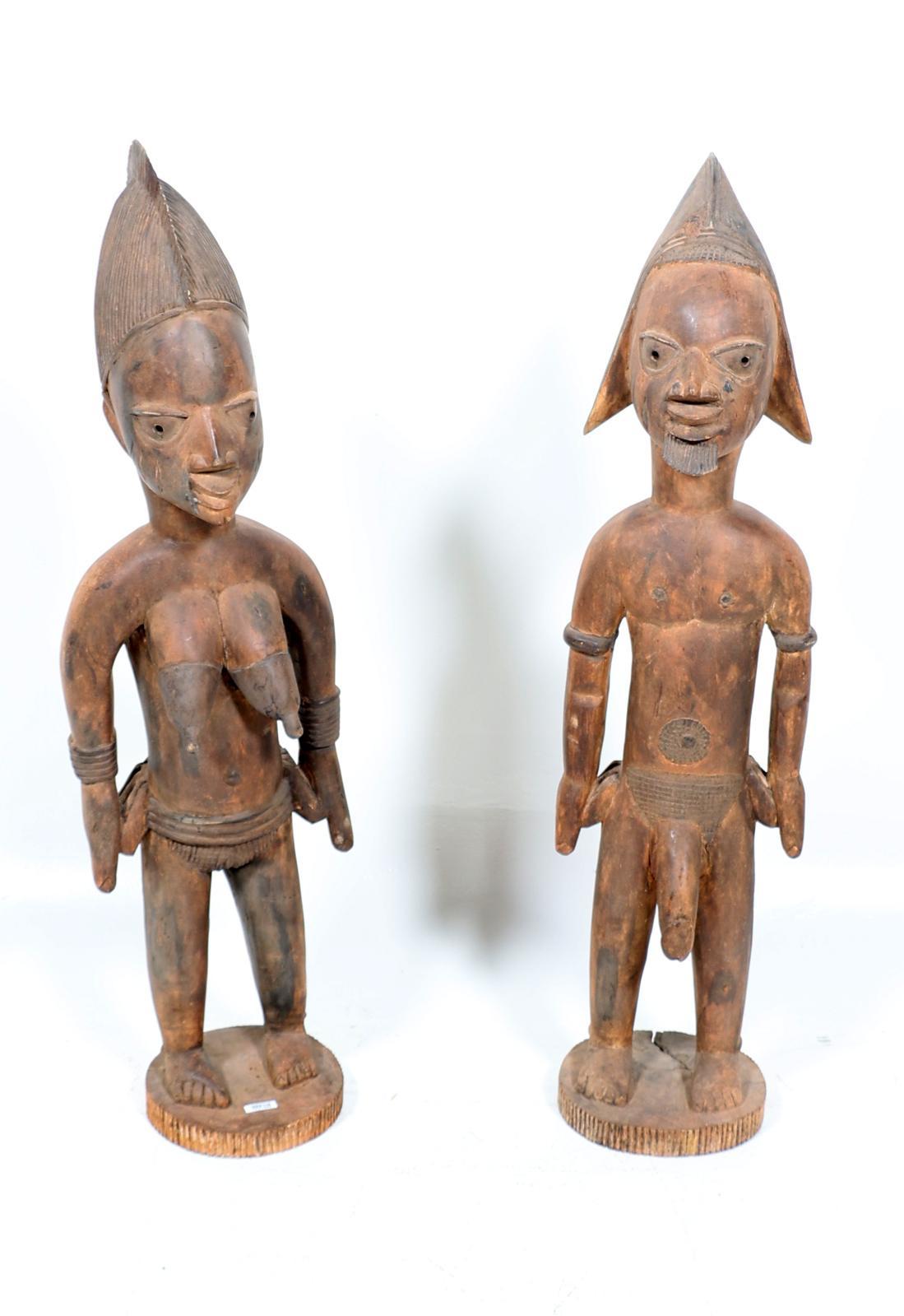 Twee oude tribale Afrikaanse sculpturen van een man en vrouw, h.100 en h.98 cm.
