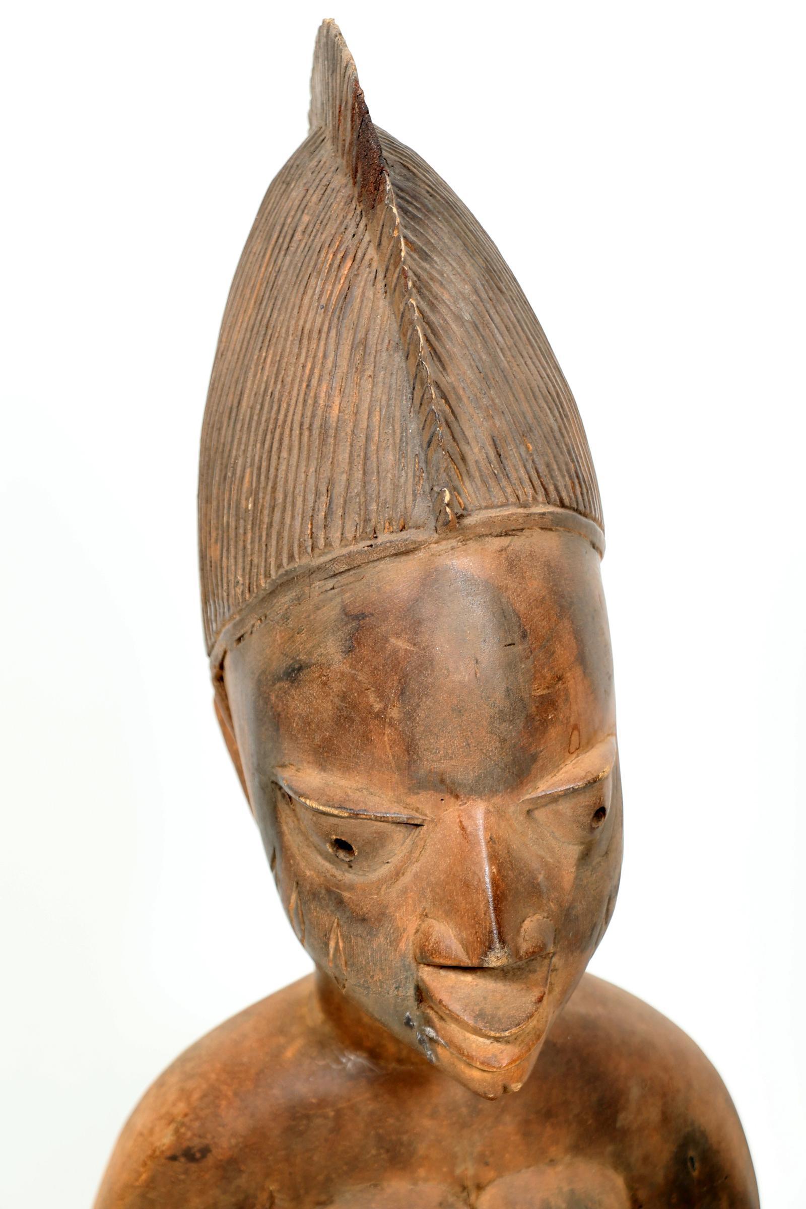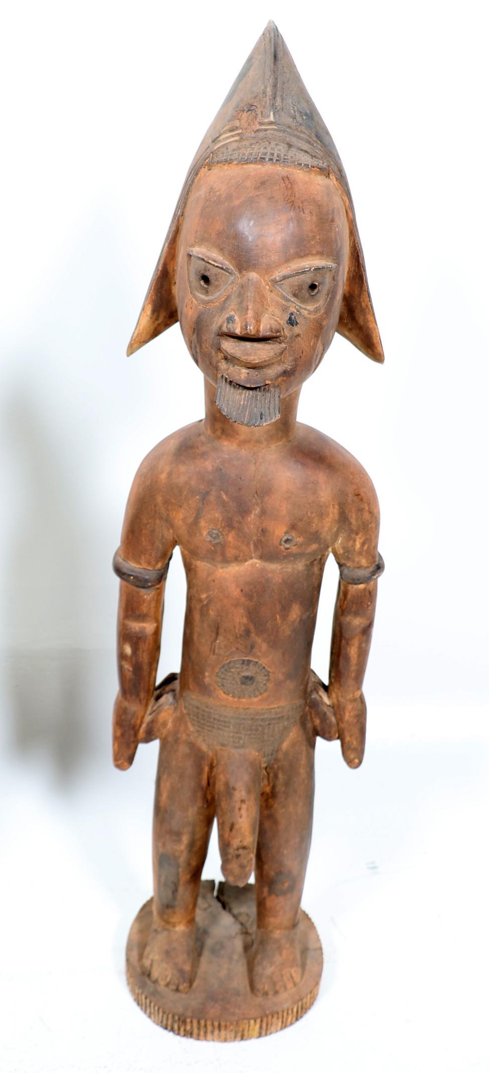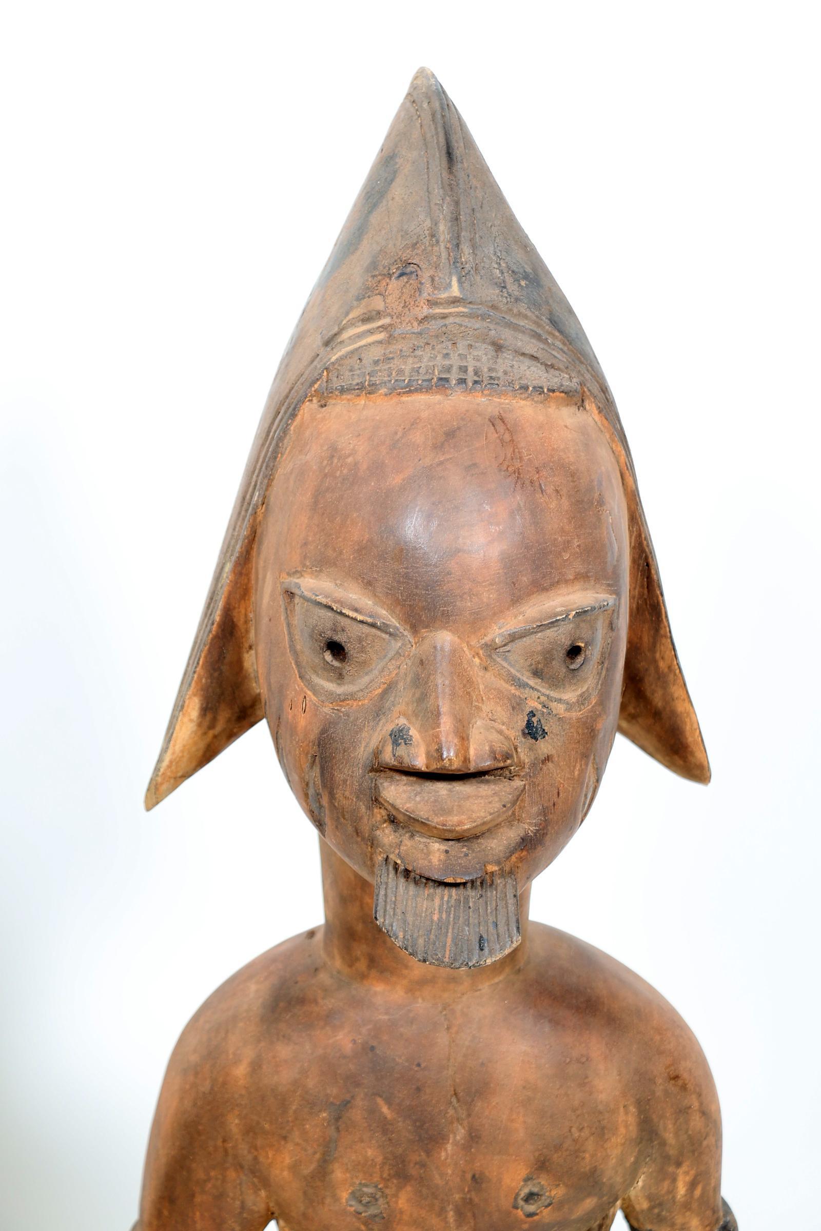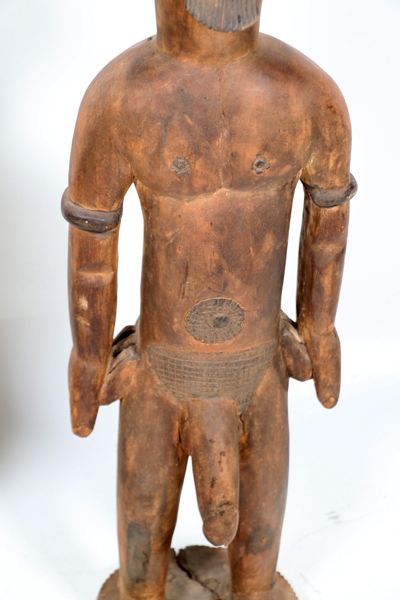 Twee oude tribale Afrikaanse sculpturen van een man en vrouw, h.100 en h.98 cm.