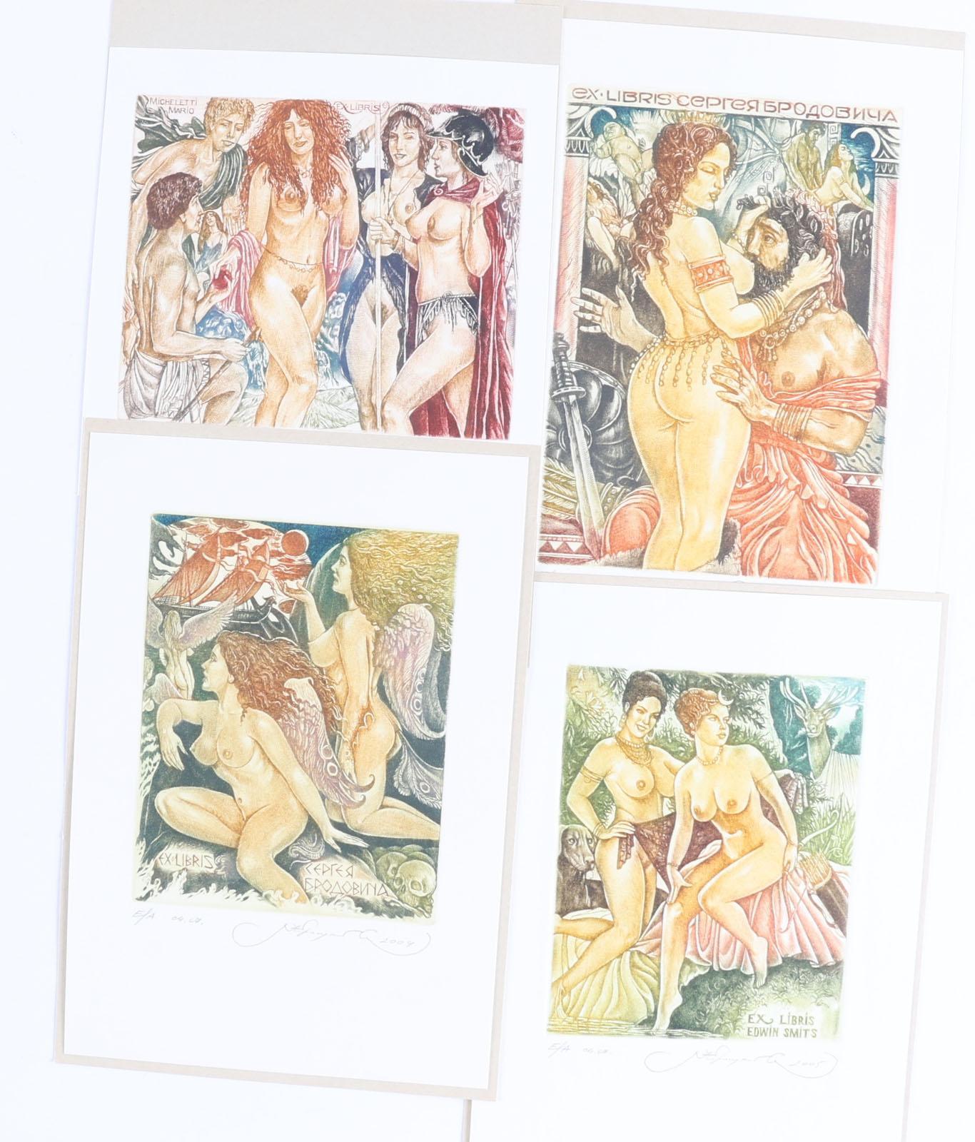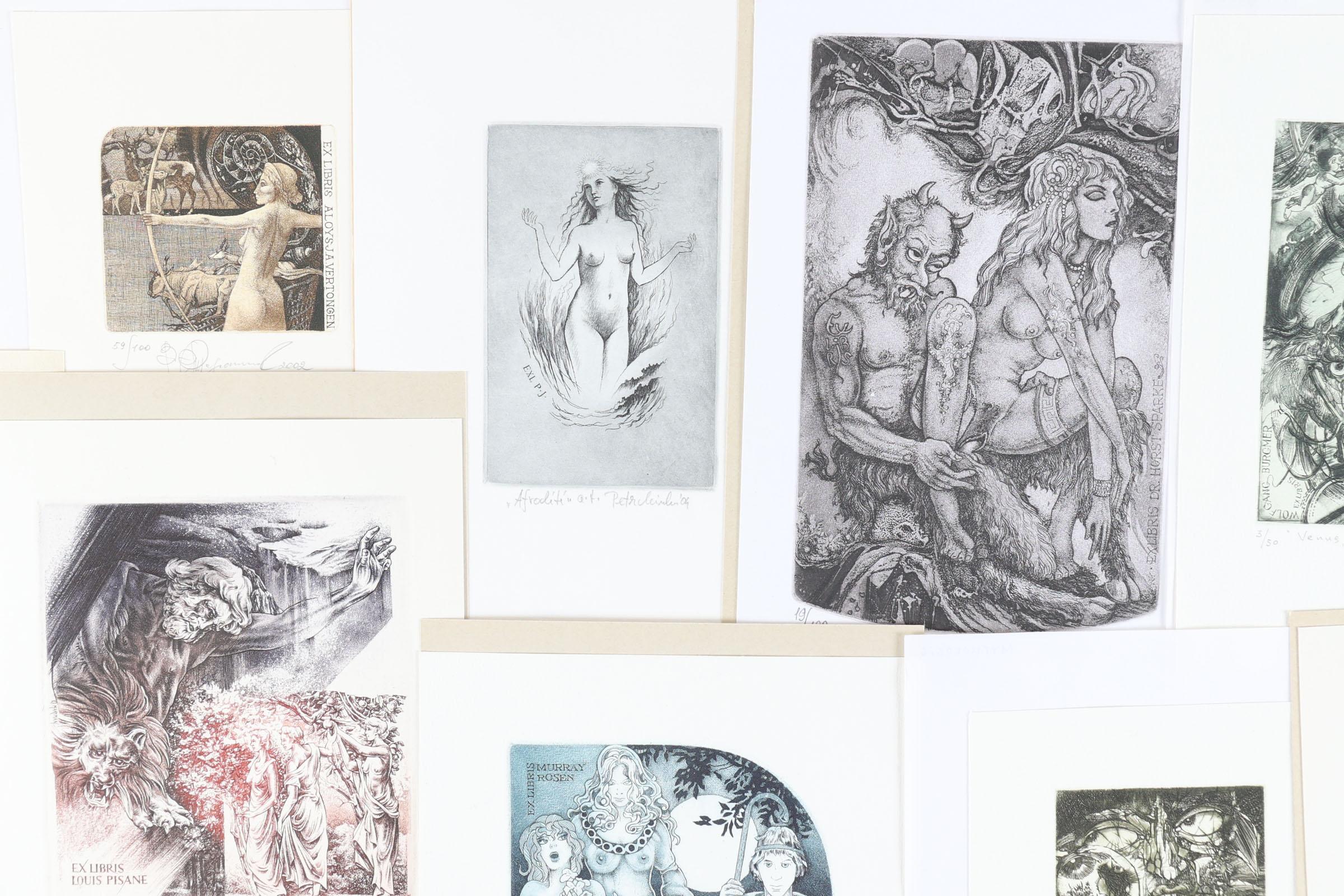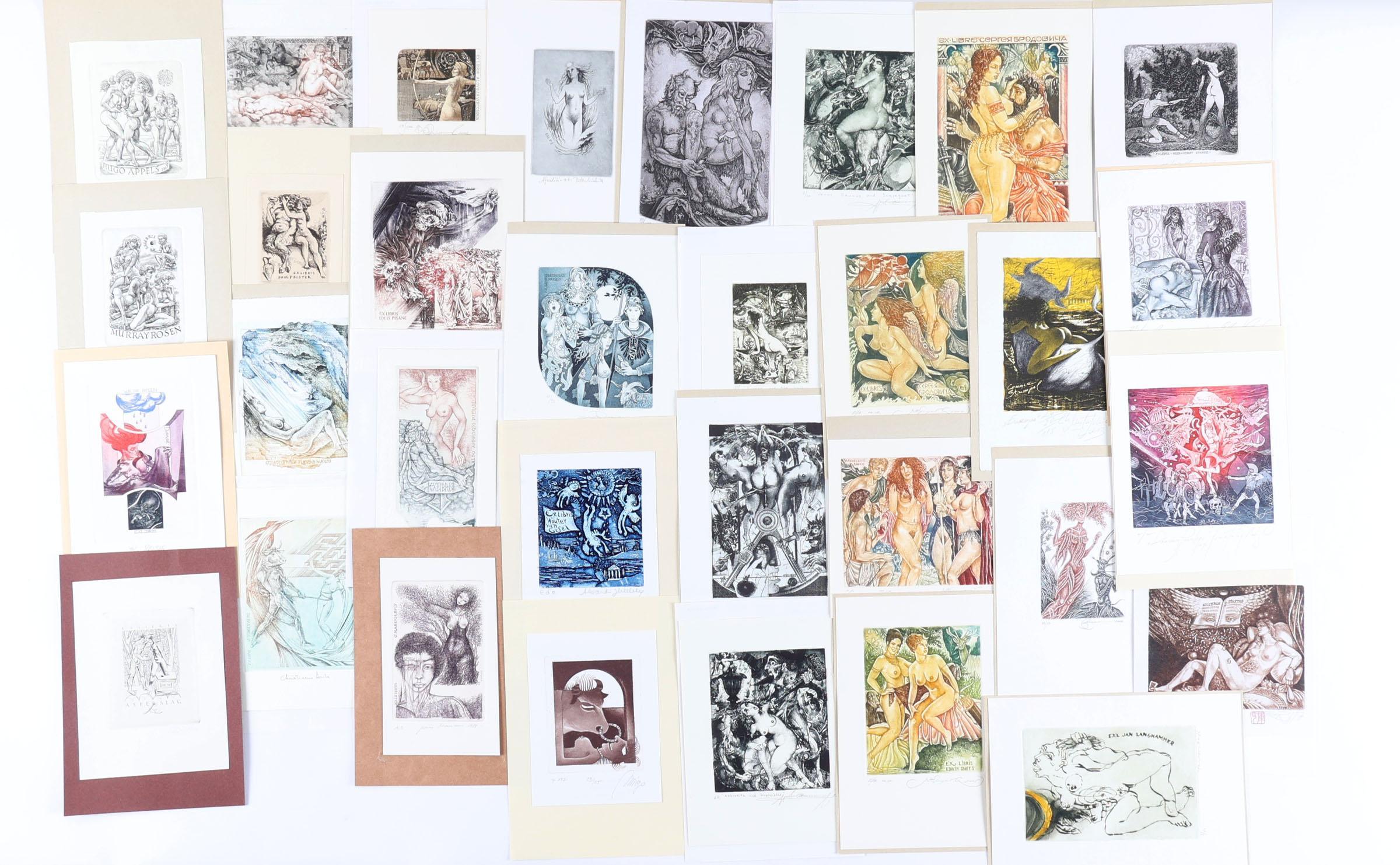 collectie van plm. 30 exlibris, thema: mythologie / naakt. Diepdrukken, alle gesigneerd, opgeplakt. Bevat werk van o.a. Ivanov, Kirnitsky, Dajc, Chernetsova, Kvartelny, Kocak, Mutafchef, Agirba, Parastiouk, Minka, Agirba, Balon, Van Damme, Mariman, Stevens, Mommen, Zwiers, Rovegno.