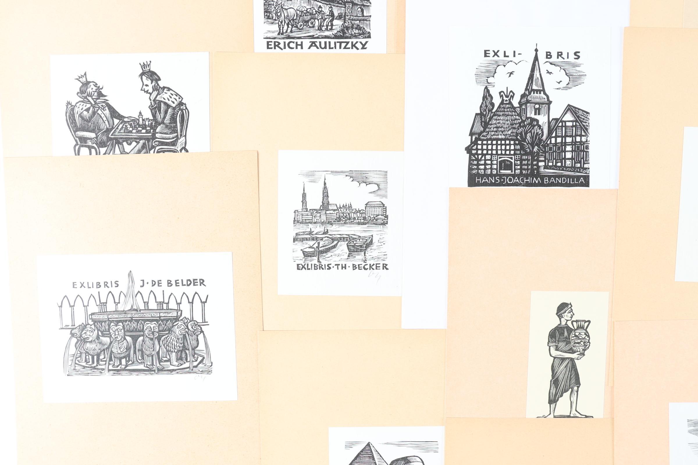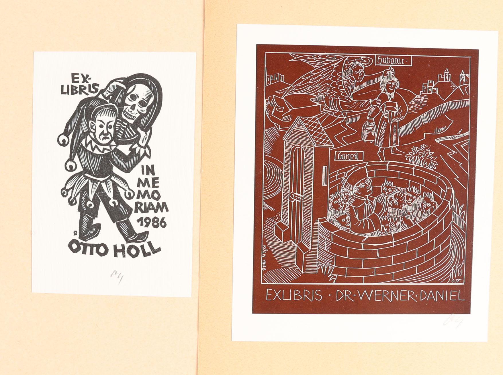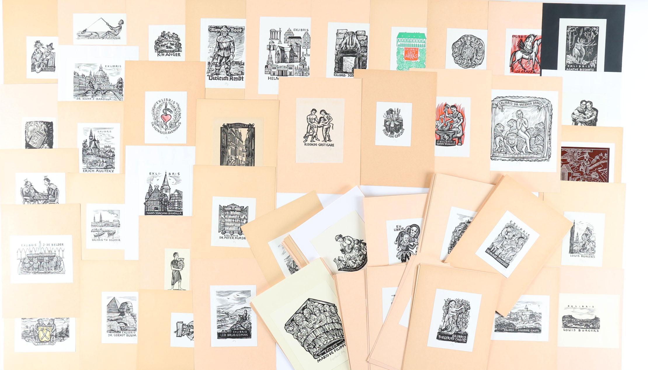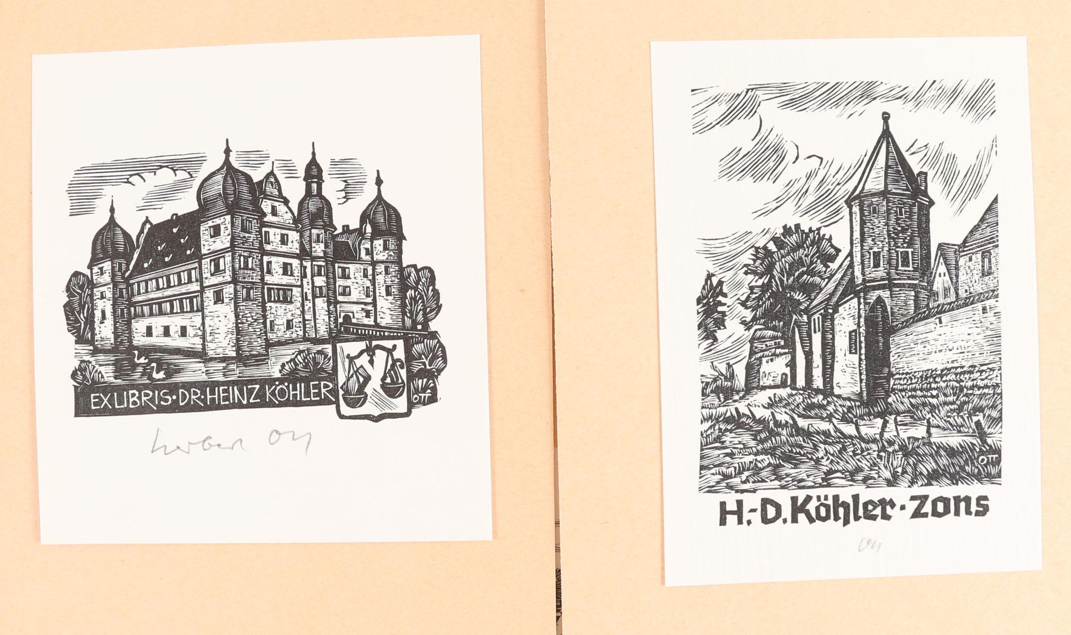 Ott, H., plm. 150 exlibris, 6 diepdrukken, rest hoogdruk. deels gesigneerd, opgeplakt. Voor eigenaars A t/m K.