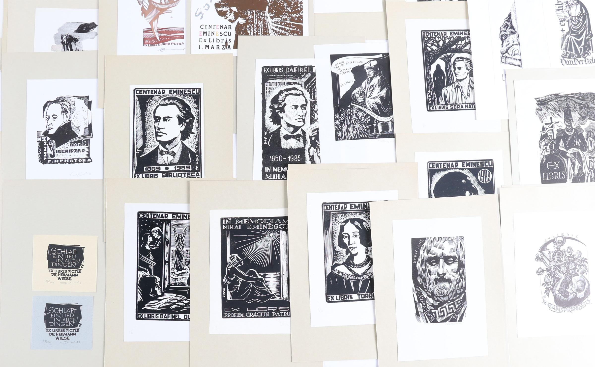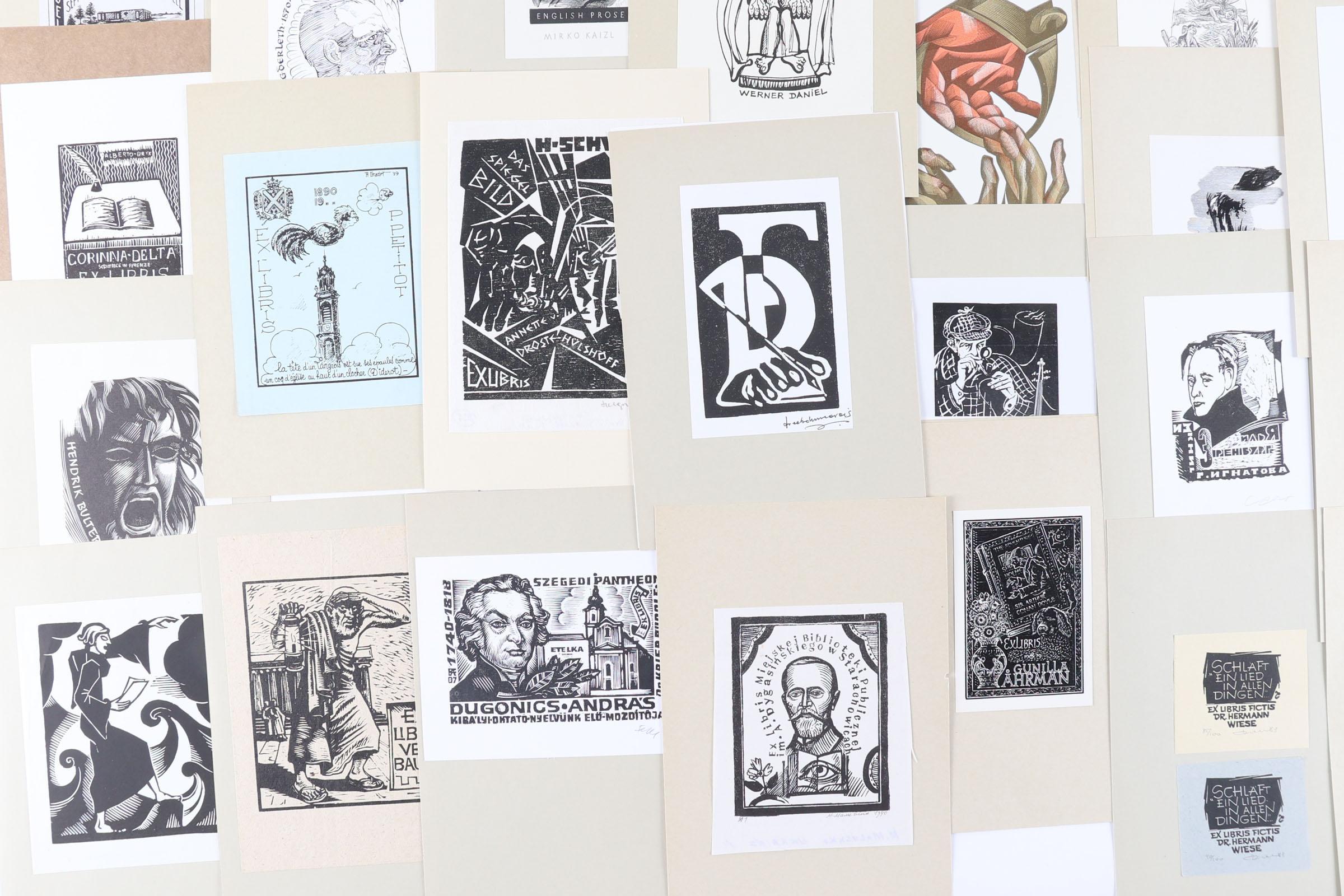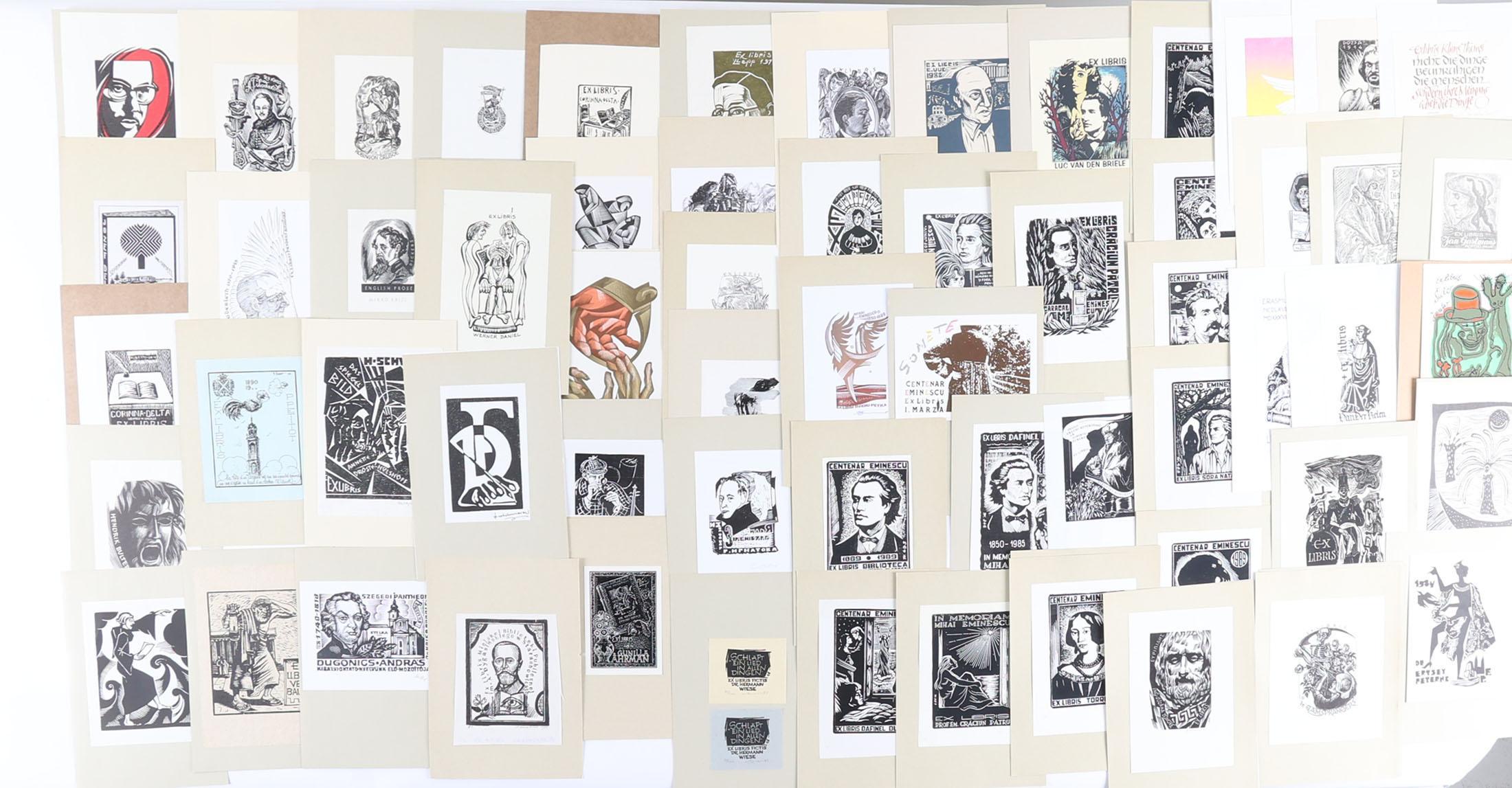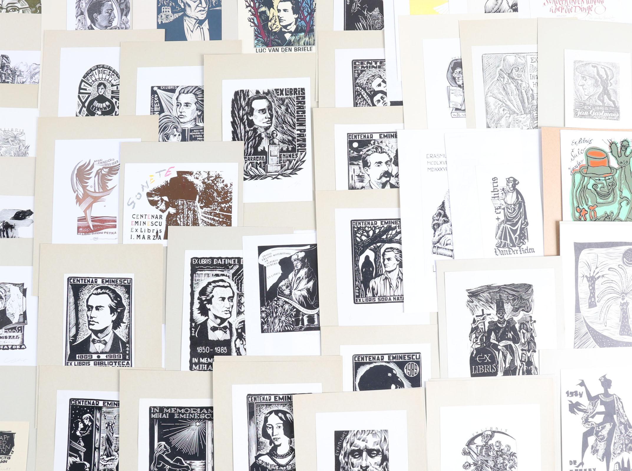 collectie met plm. 75 exlibris / kleingrafiek, thema: literatuur / schrijvers (met de letter D en E). Hoogdruk / vlakdruk, deels gesigneerd, opgeplakt. Afgebeeld o.a. Dumas, Doyle, Defoe, Dostojevsky, Dickens, Elsschot, Erasmus, Van Eden, Eminescu.