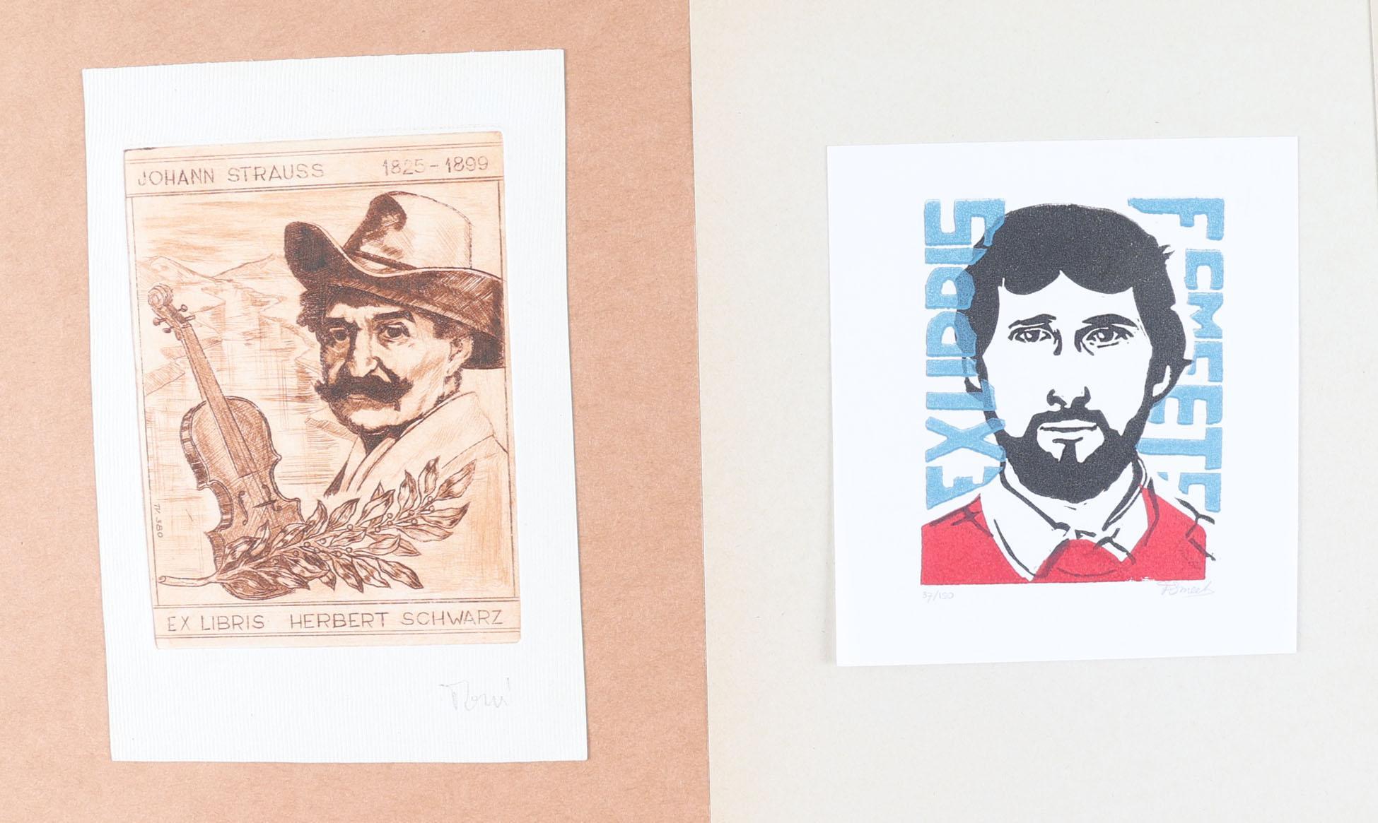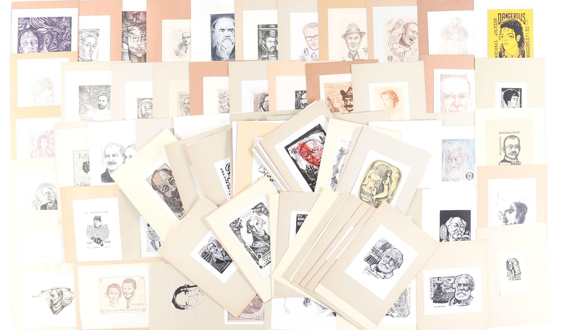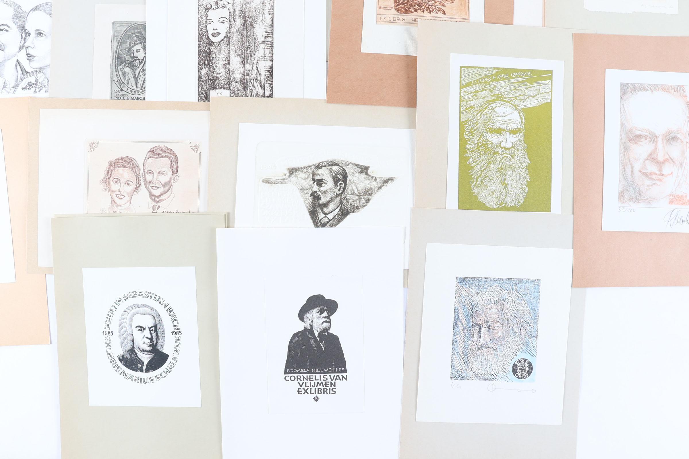 collectie van plm. 140 exlibris, thema: portretten. Gemaakt door kunstenaars met de letter R t/m Z. 30 x diepdruk, rest hoogdruk / vlakdruk. Deels gesigneerd, opgeplakt. Werk van o.a. Saez, Safar, Schmidt, Schroth, Siekman, Slavikova, Spronk, Tramontin, De Vries, Wuyts, Rueter, Terechov, Rumanski.
