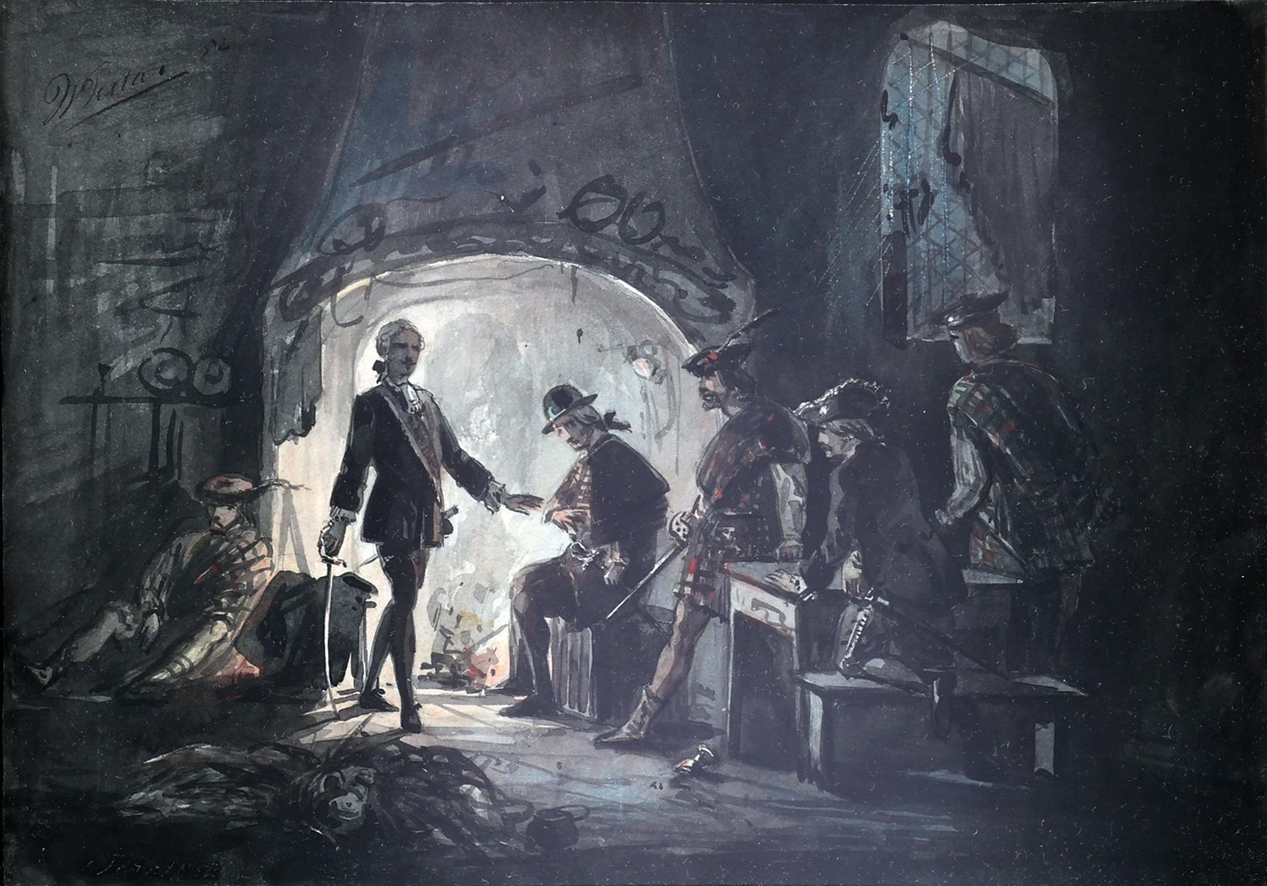 Willem de Famars Testas (1834-1896), Personen in interieur bij haardvuur, gemengde techniek, gedateerd februari 1852, 24 x 34 cm.