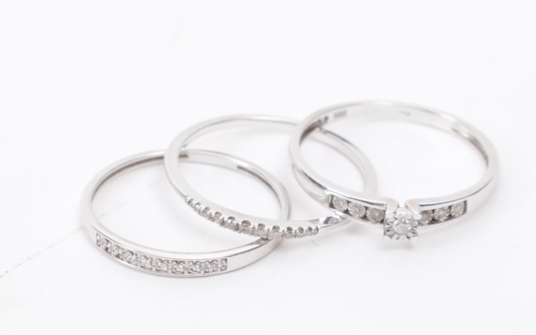 3 Diverse 14 kt. witgouden aanschuifringen bezet met briljant geslepen diamant, ringmaat 19 ,totaalgewicht 3,7 gram