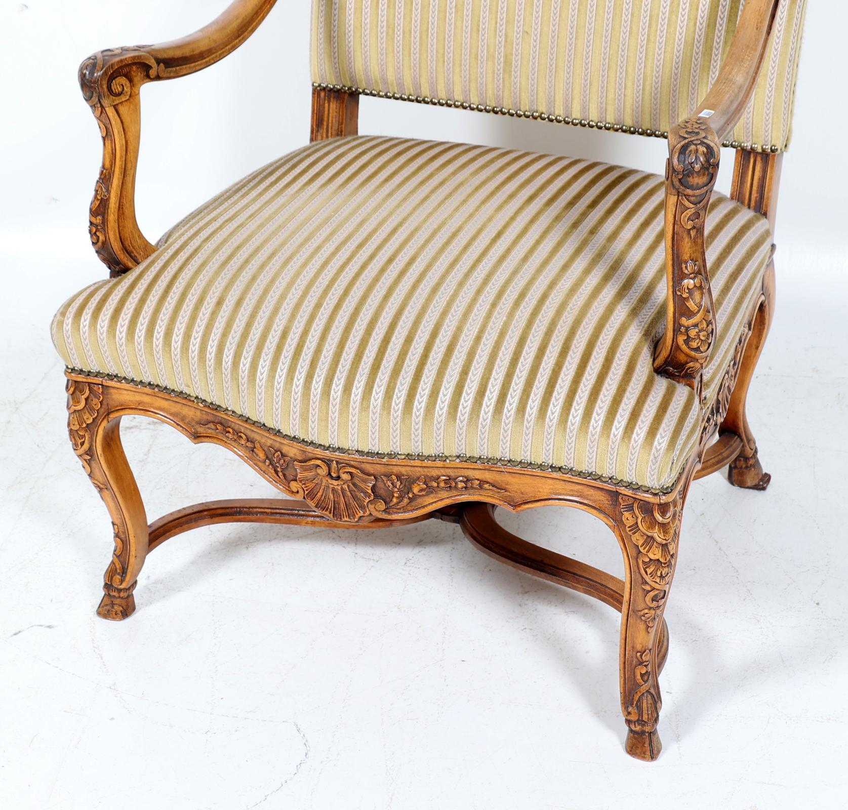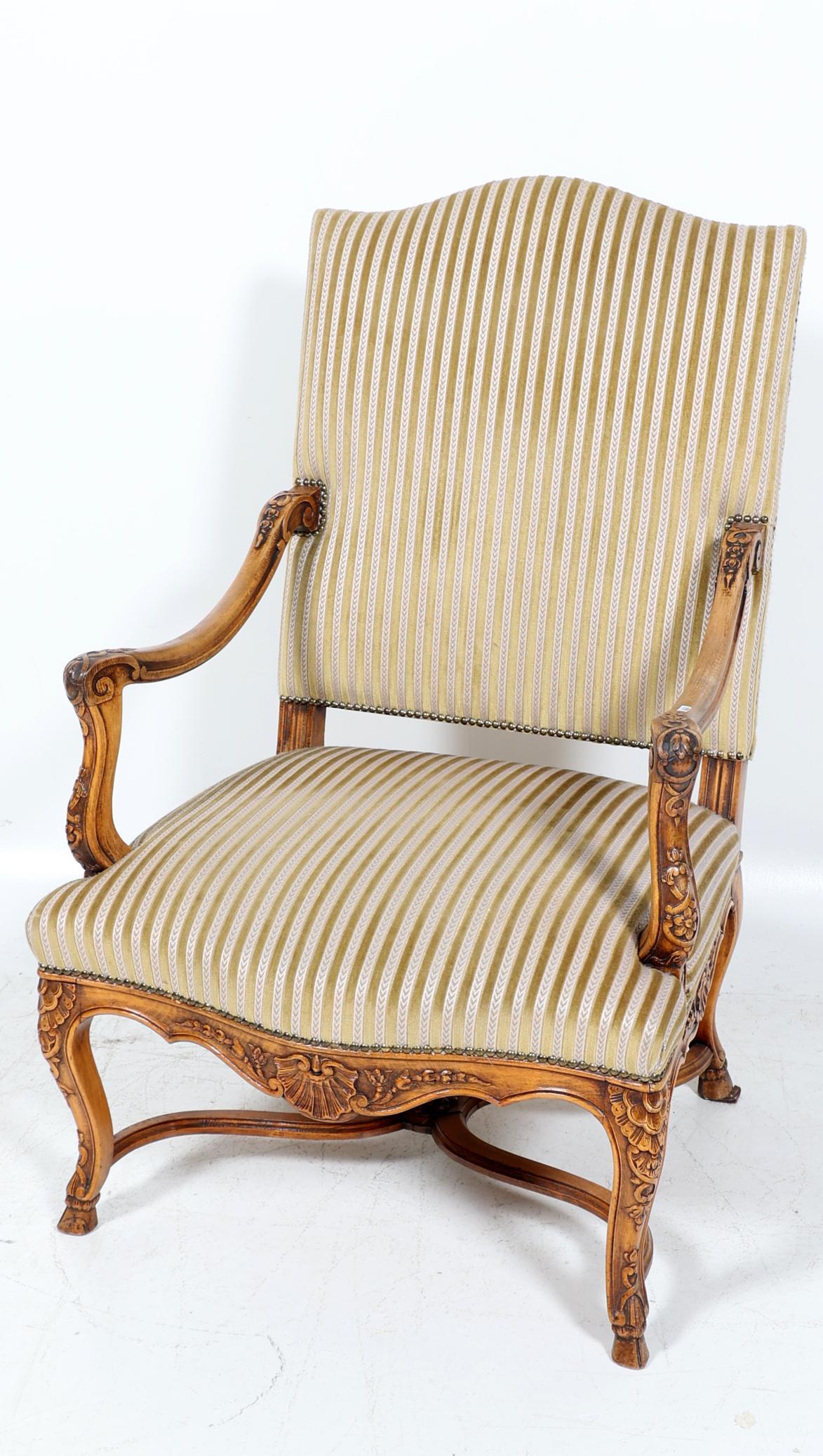 Antieke notenhouten armfauteuil met gestreepte stof bekleed