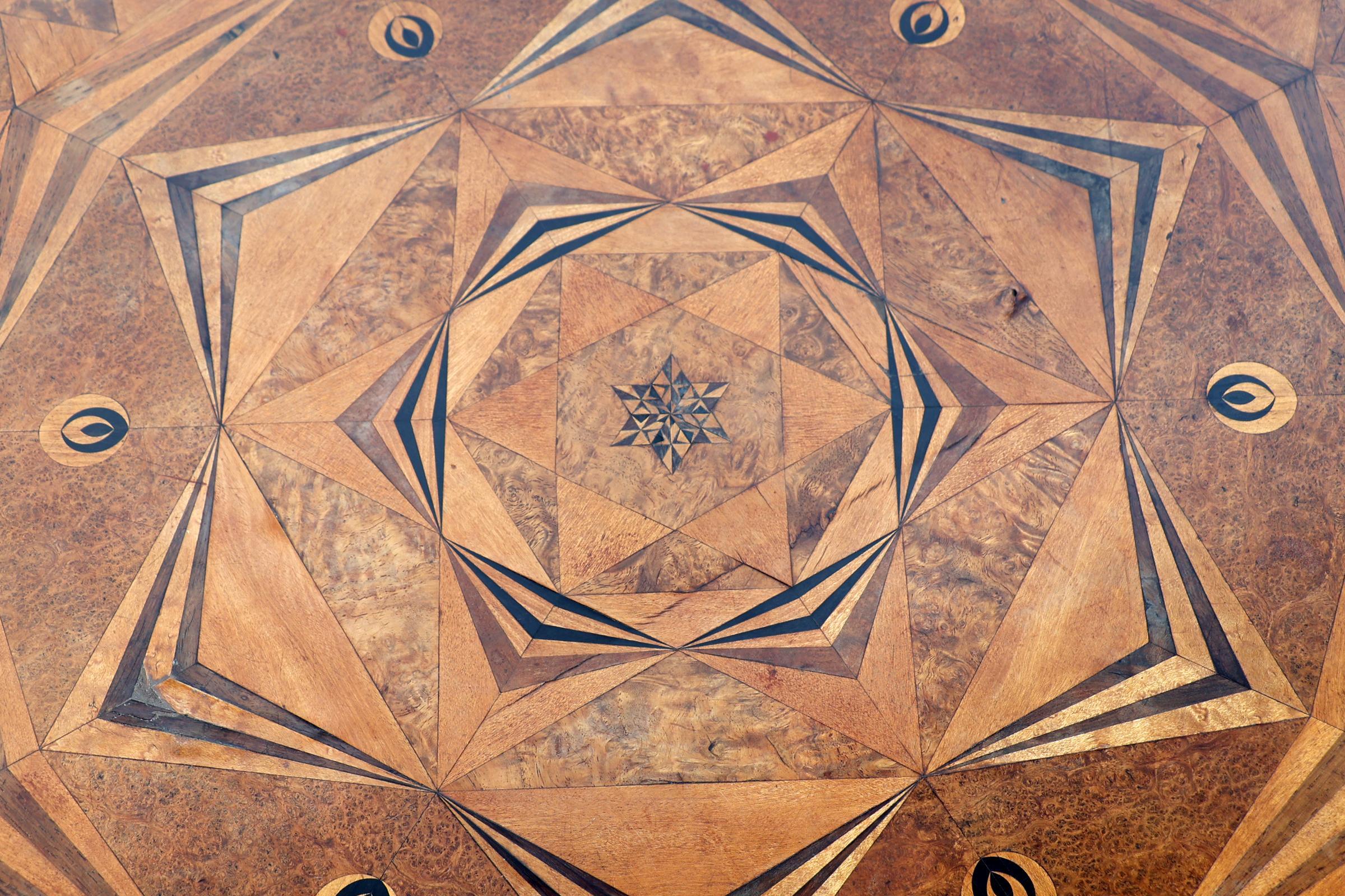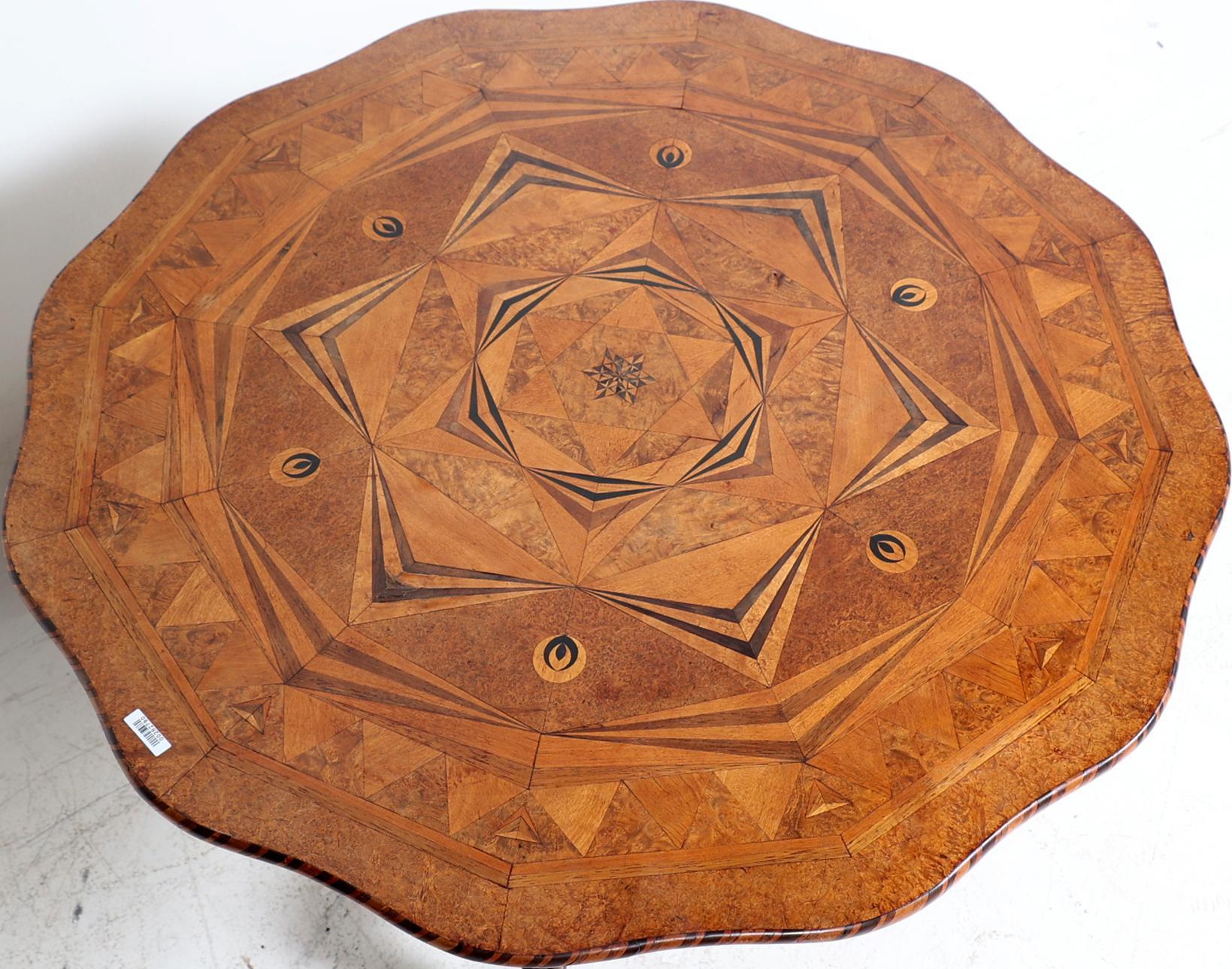 Antiek met diverse houtsoorten ingelegde tafel rustend op mahoniehouten 3-spanpoot, h.63 x diam.80 cm.