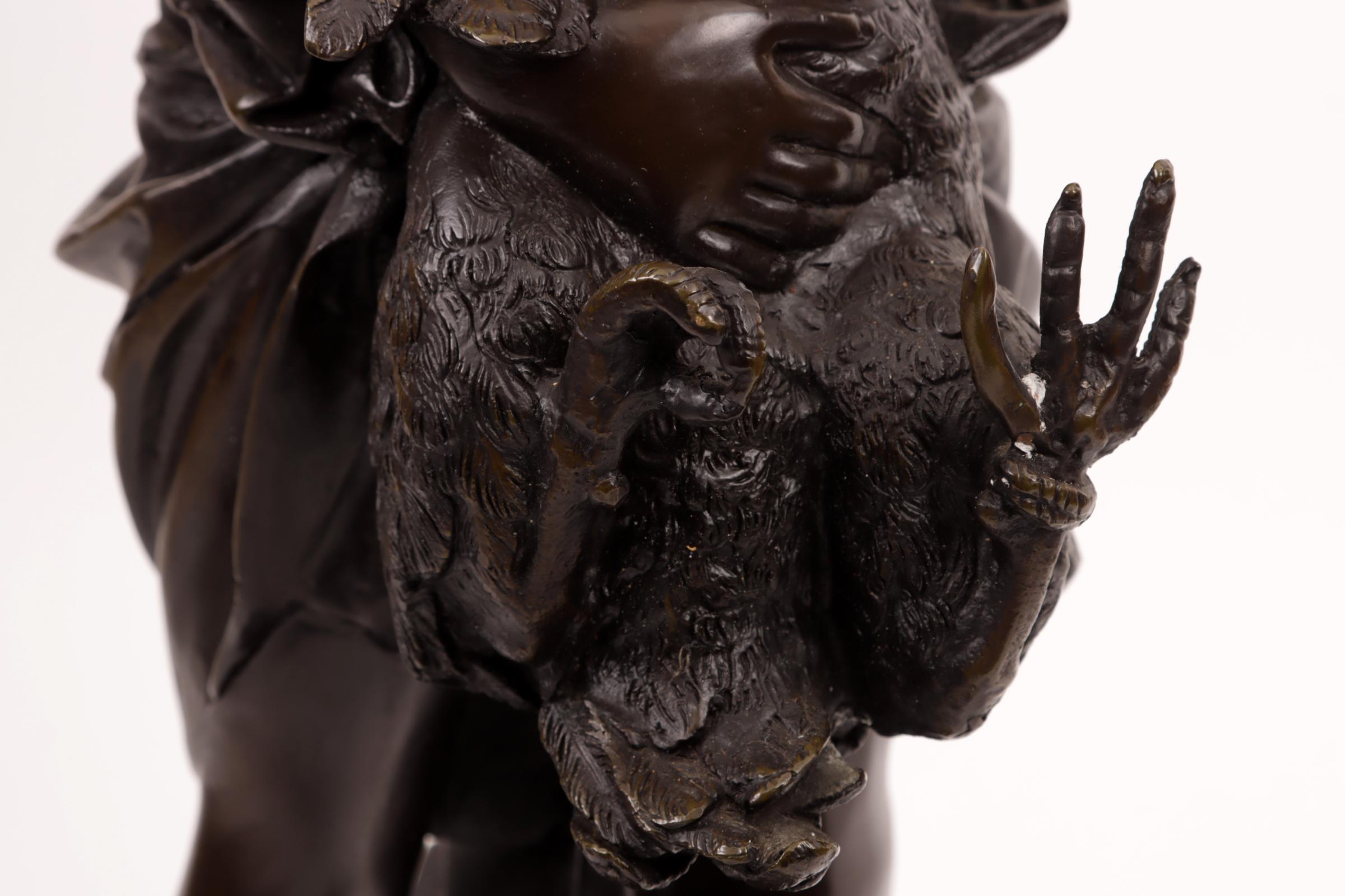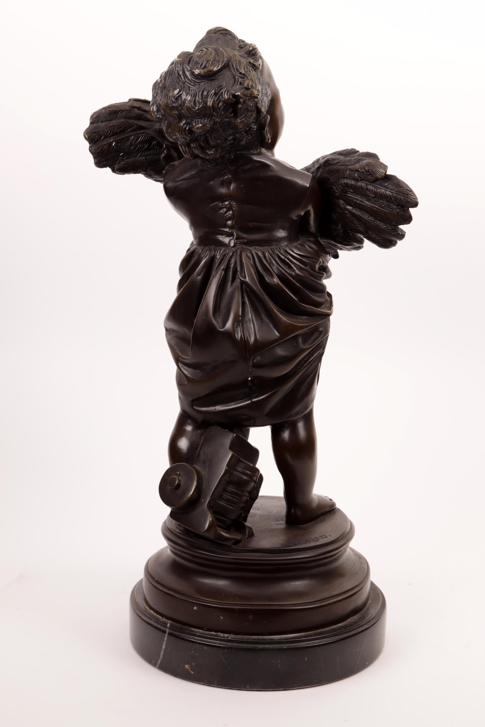 Bronzen sculptuur van kindje met haan rustend op marmeren voetstuk. h. 55 cm.