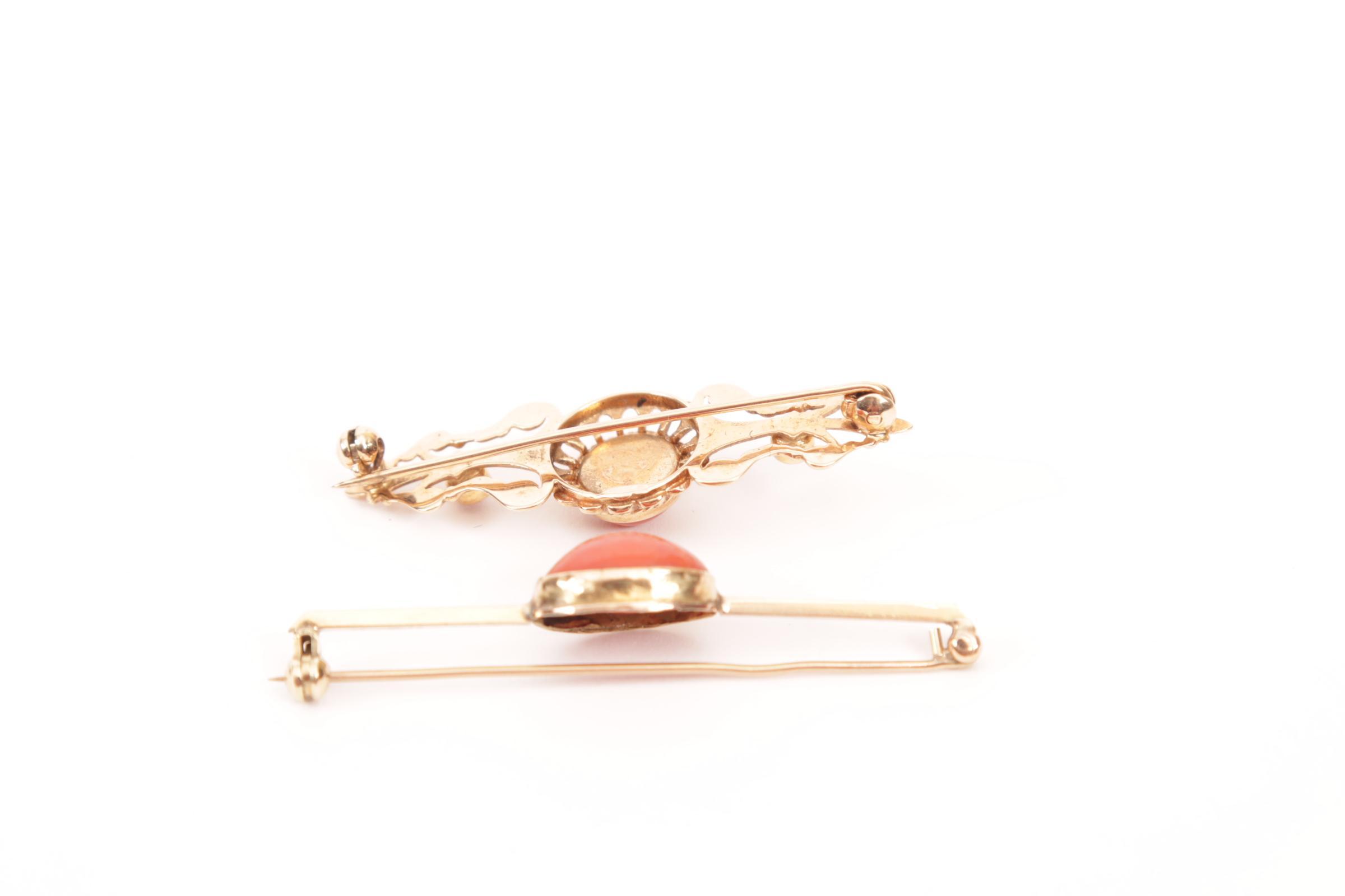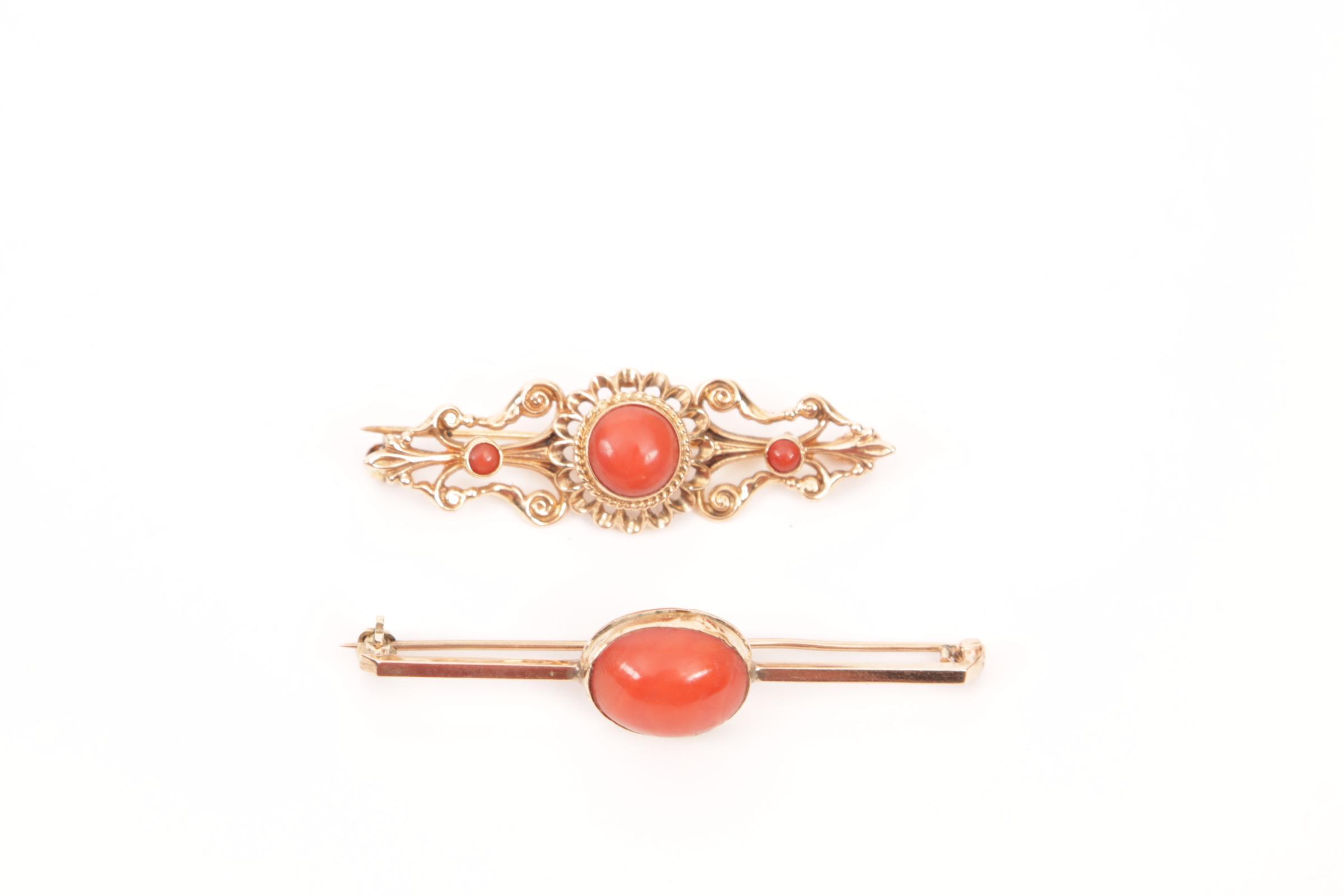 2 Diverse gouden broches bezet met bloedkoraal, 7,5 gram