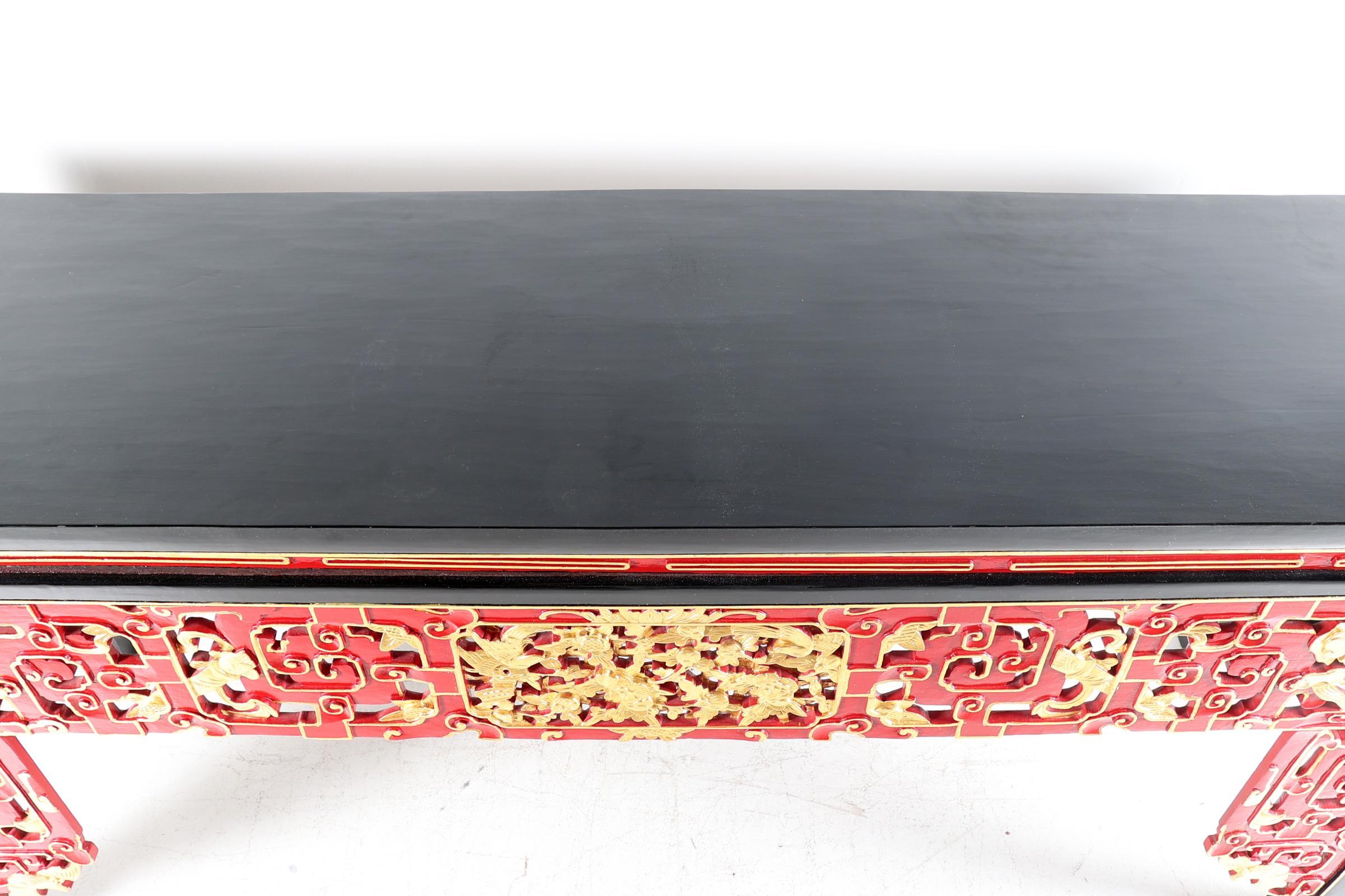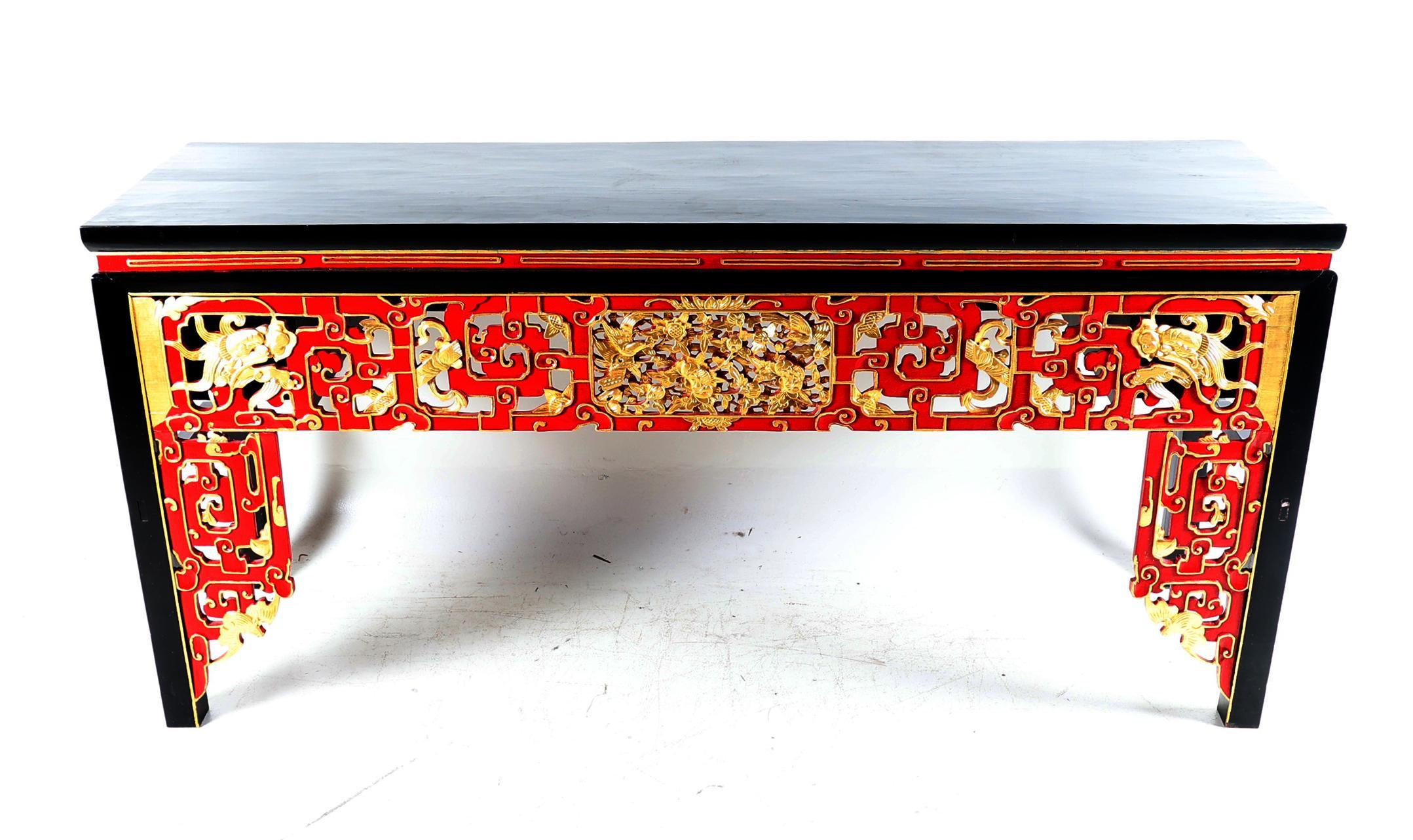Oude rijkbewerkte lakwerk Chinese sidetable, h.95 x b.197 x d.53.5 cm.