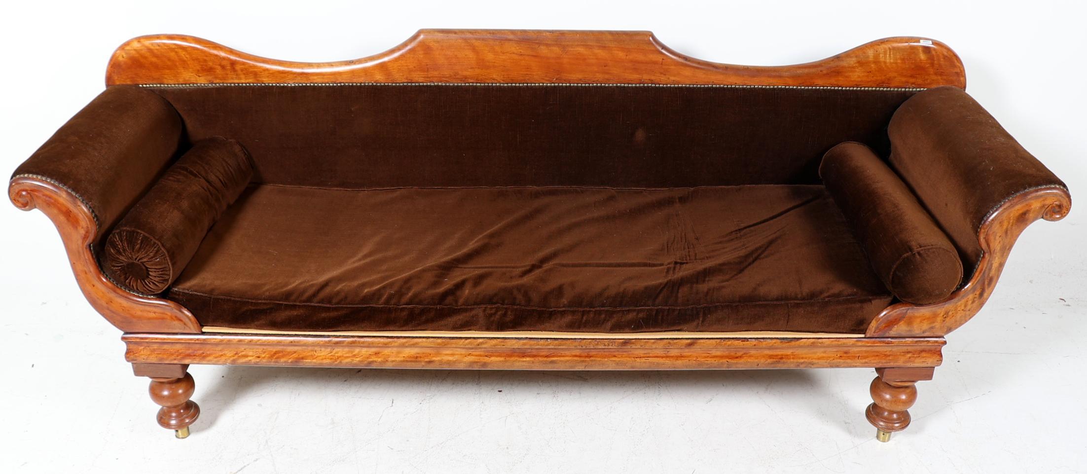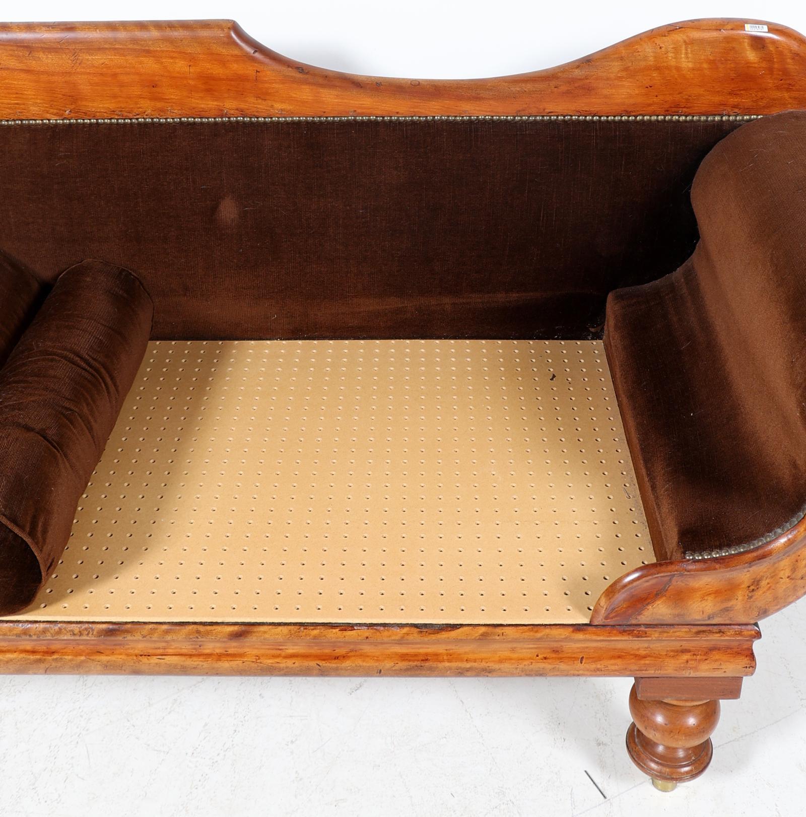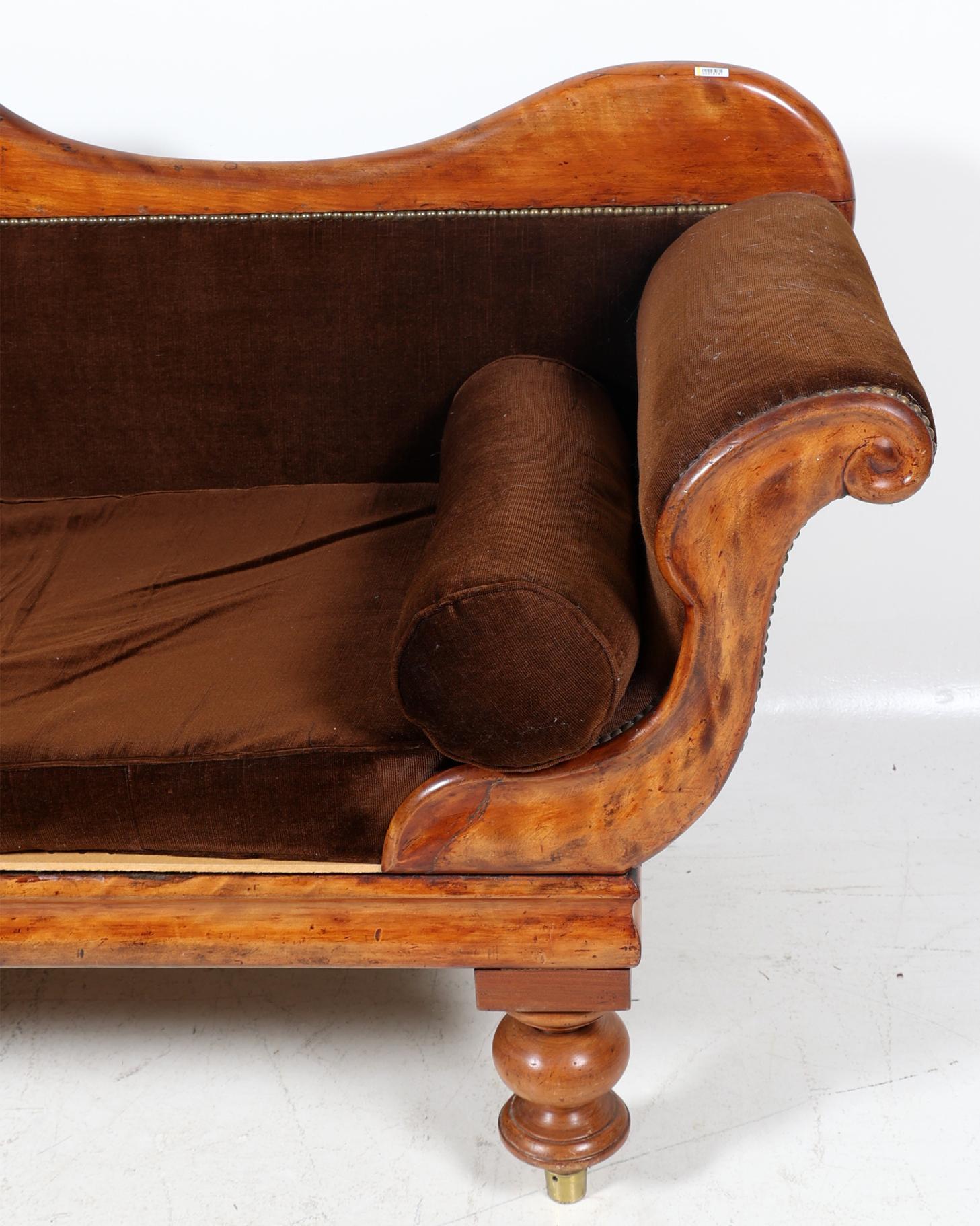 Antieke met bruin velours gestoffeerde mahoniehouten bank, Holland 1840, h.91 x b.238 x d.65 cm.
