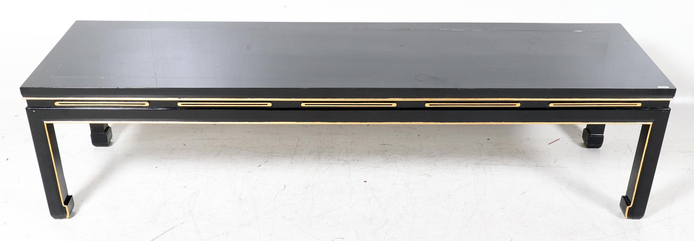Zwart met goud gelakte Chinese lakwerk salontafel, h.50 x b.200 x d.55 cm.