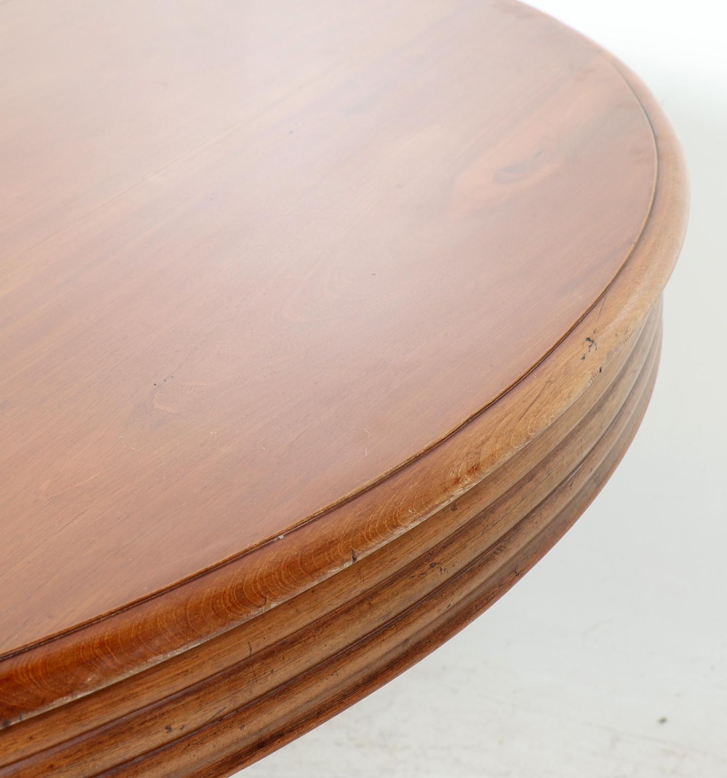 Antieke mahoniehouten coulissetafel met 4 aanvullende tussenbladen, h.80 x diam.140 cm. (verlengbaar met 1.25 cm.)