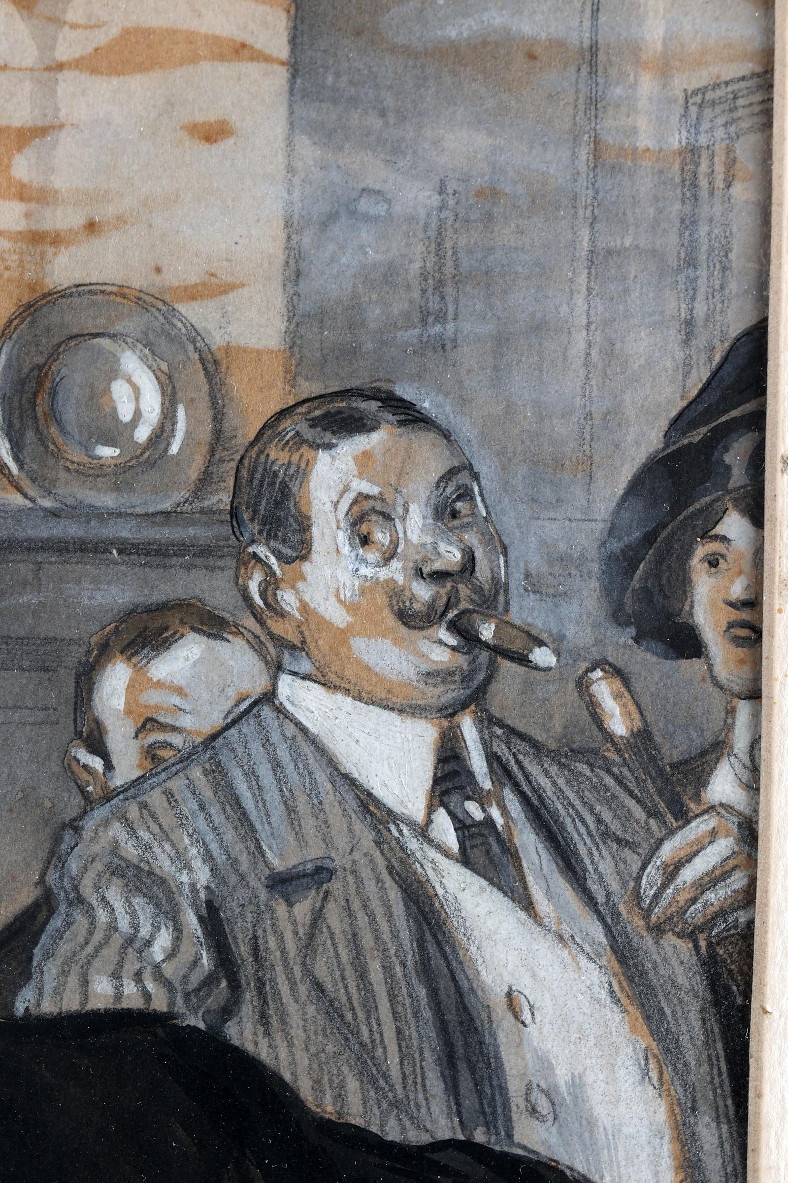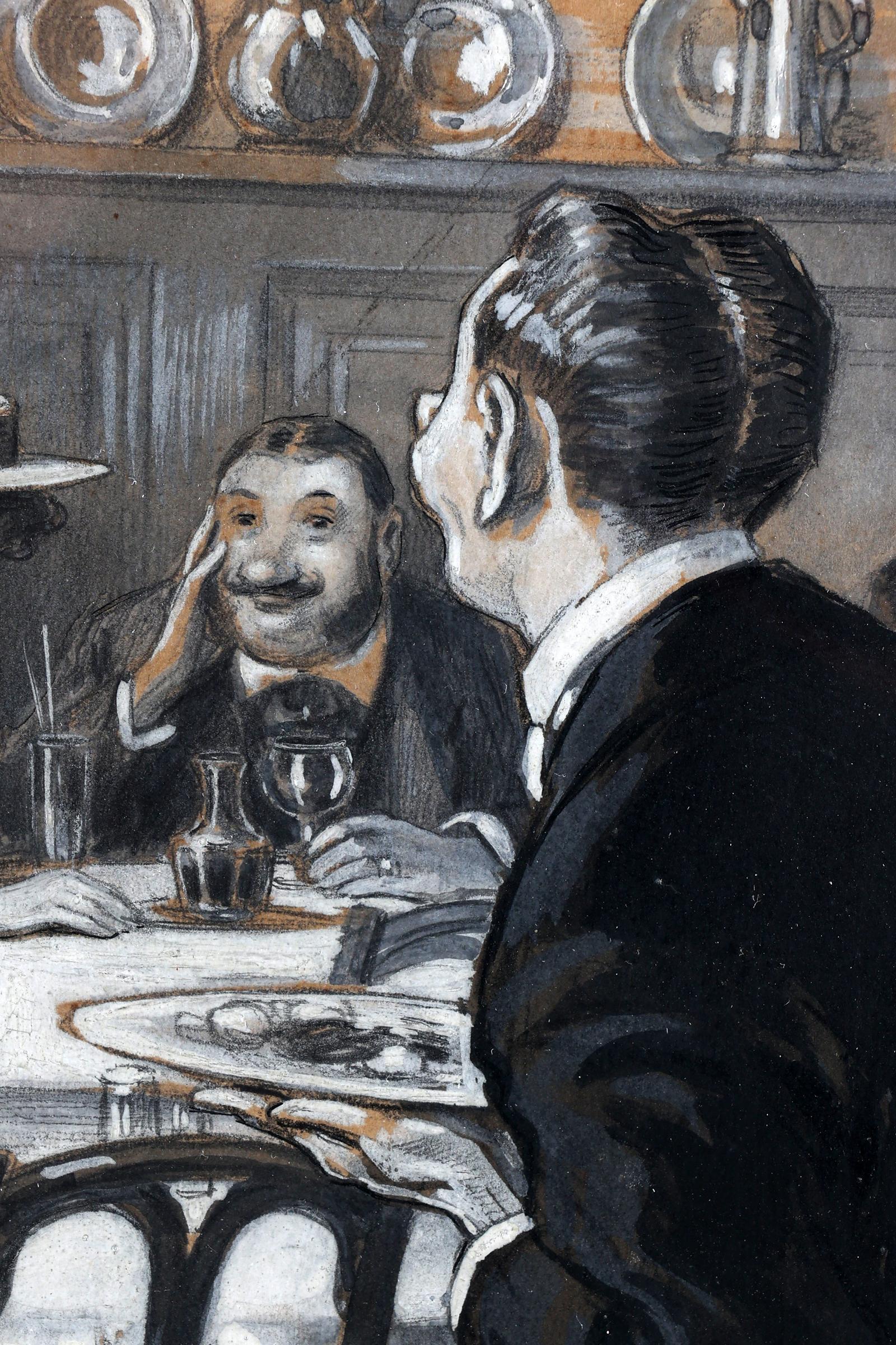 N. Keisl, Caféinterieur met personen, gouache op papier, 30 x 30 cm.