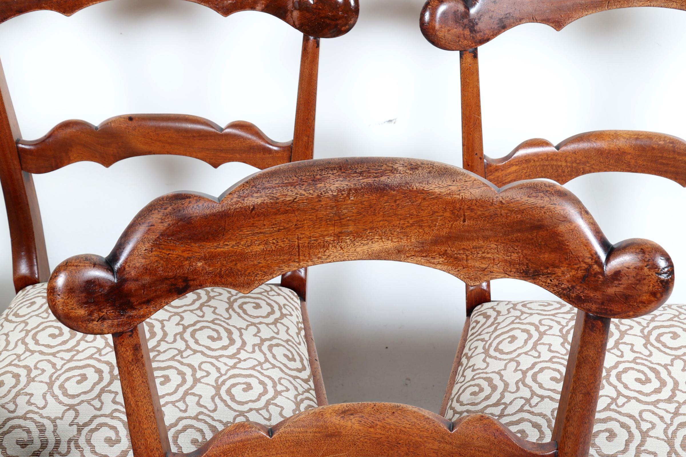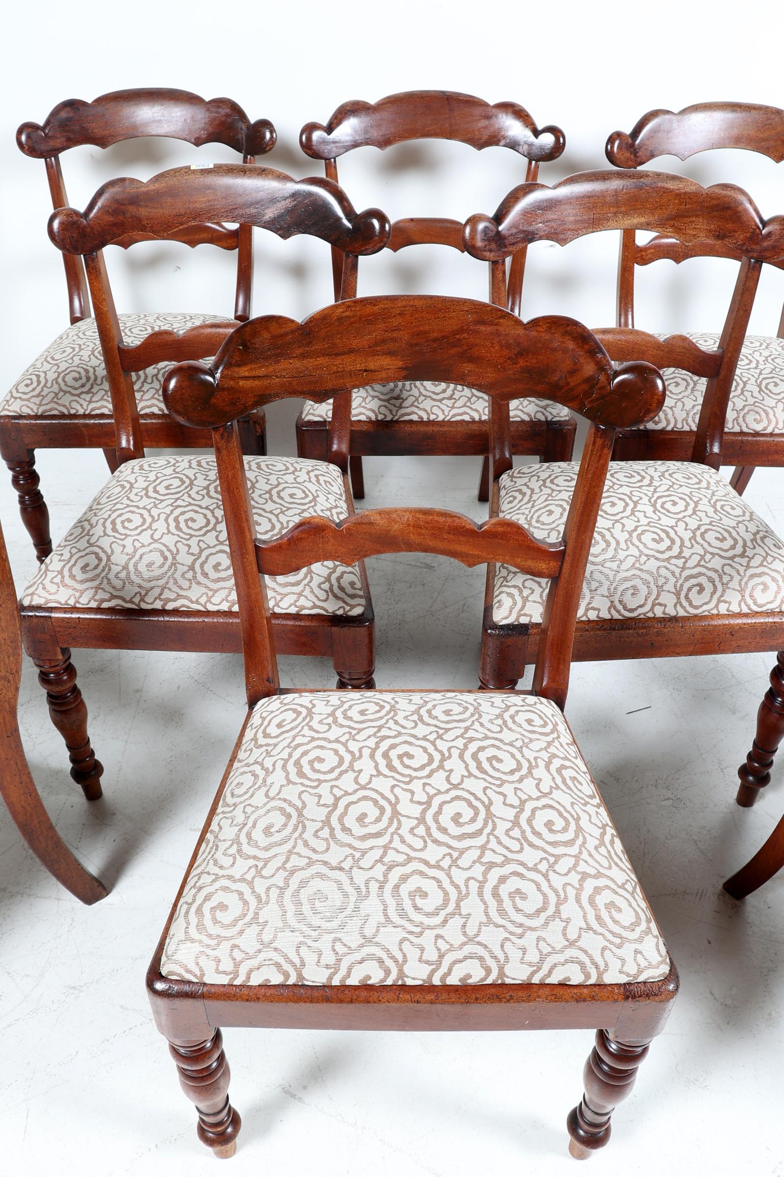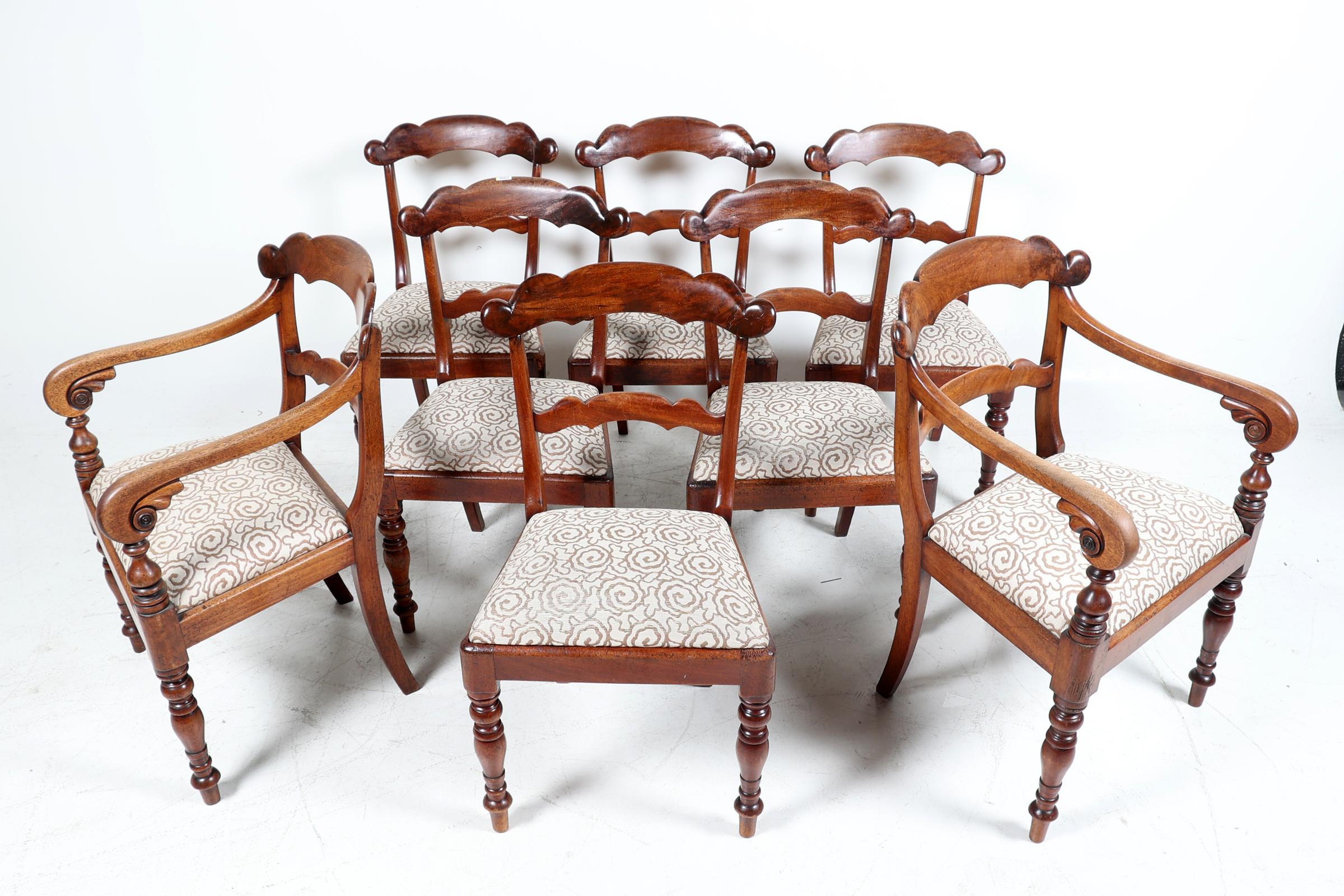8 Antieke mahoniehouten eetkamerstoelen waarvan 2 met armleuning en met moderne stof bekleed