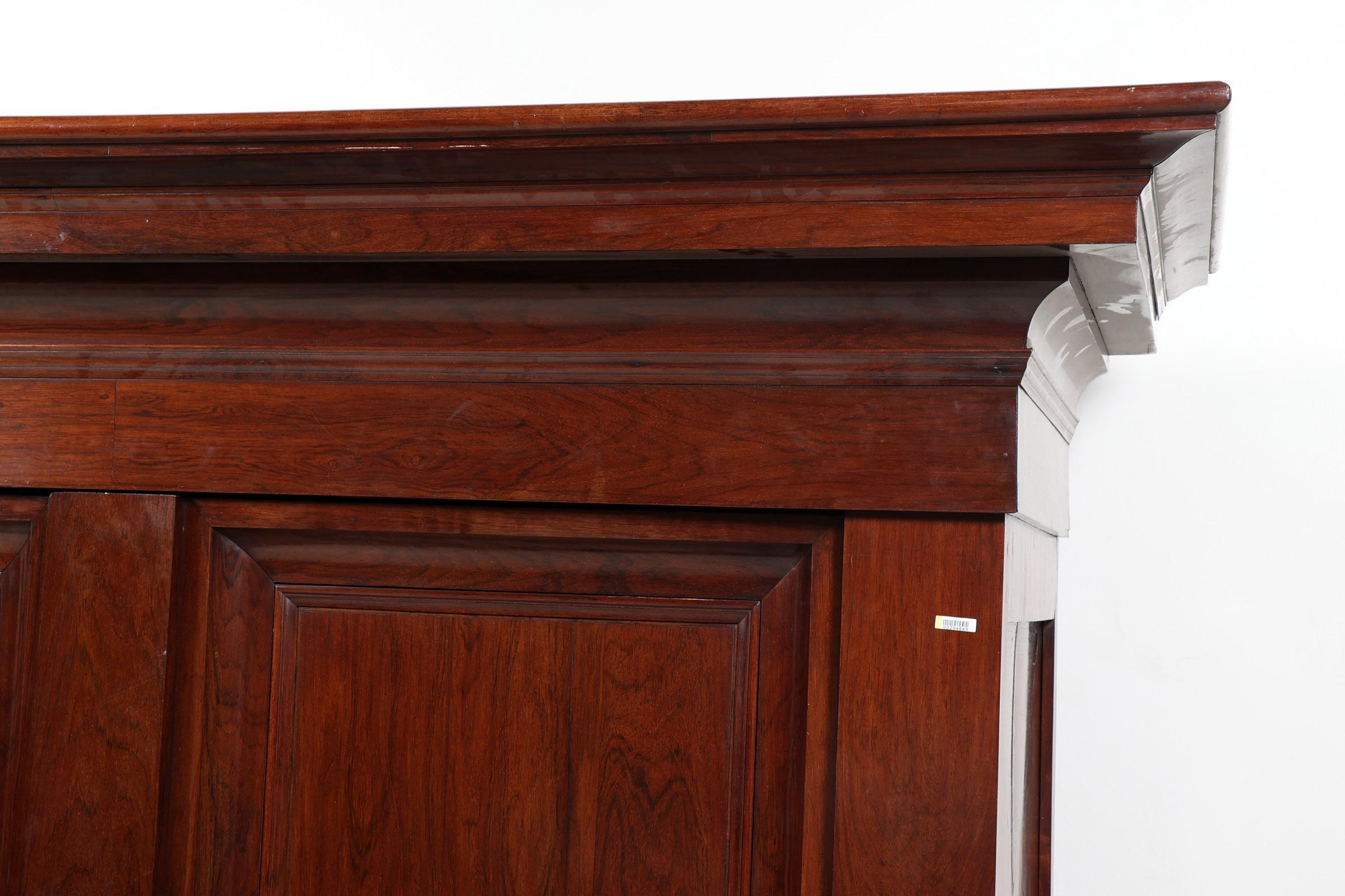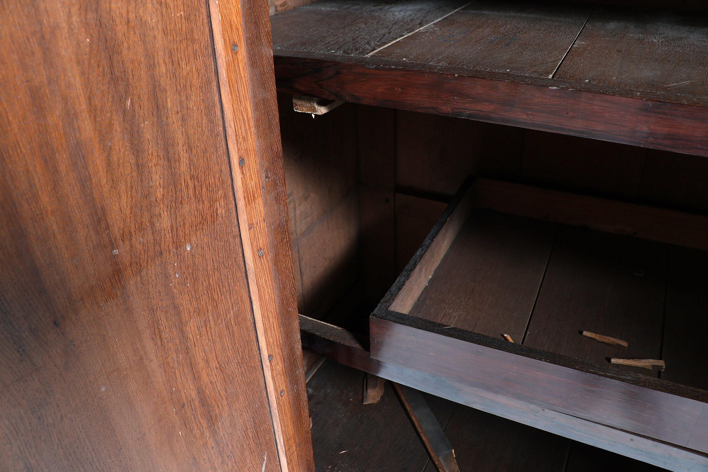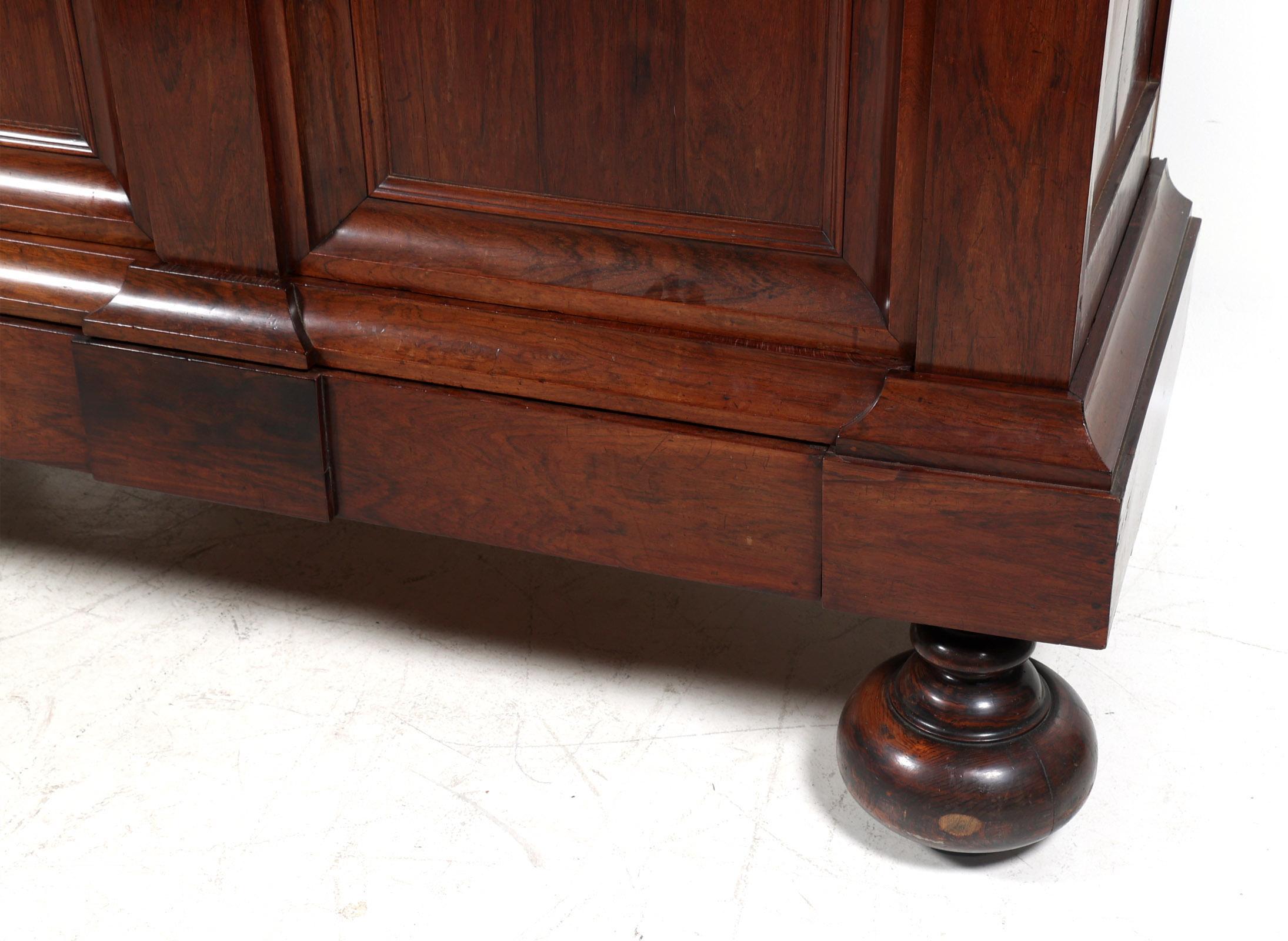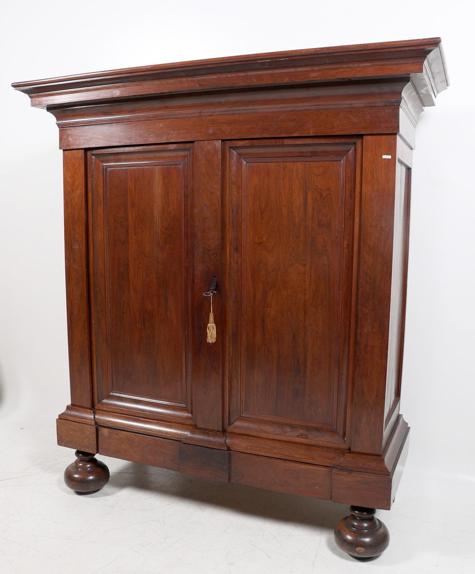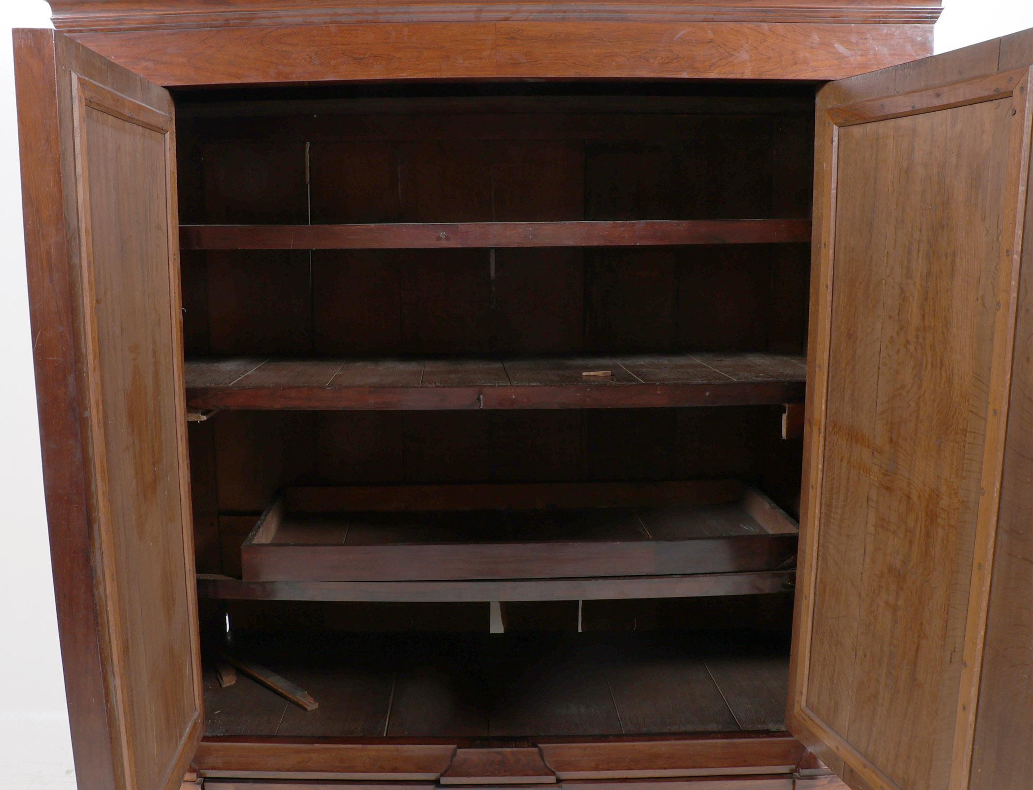 Antieke notenhouten 2-deurs pastoorkast rustend op bolpoten, 18e eeuw, h.198 x b.200 x d.86 cm.
